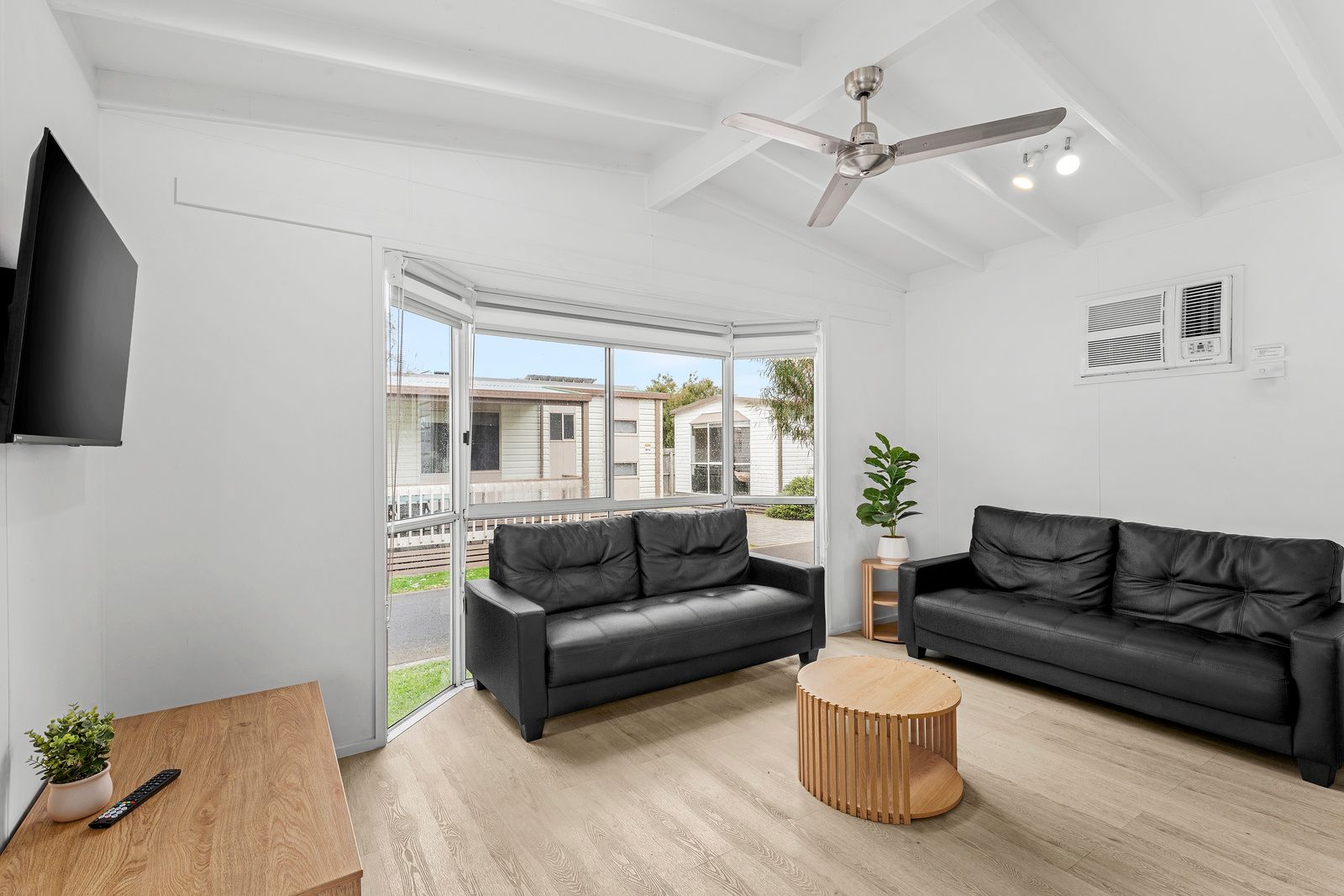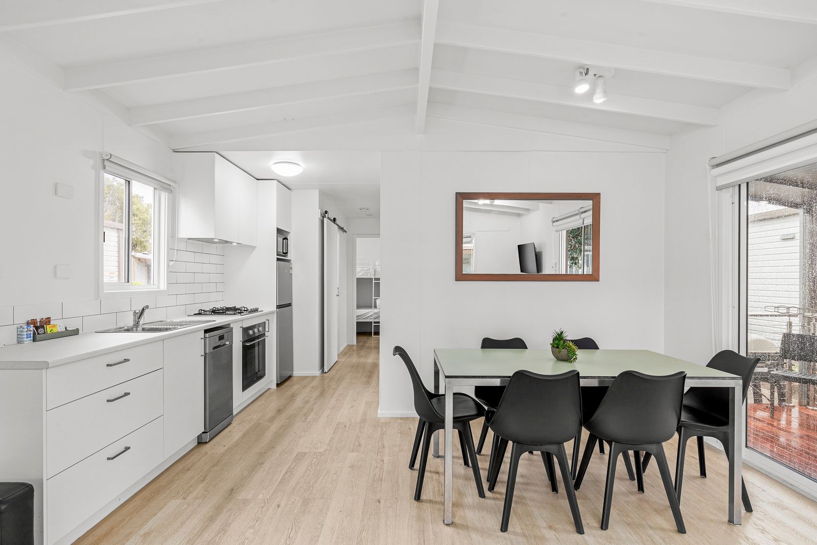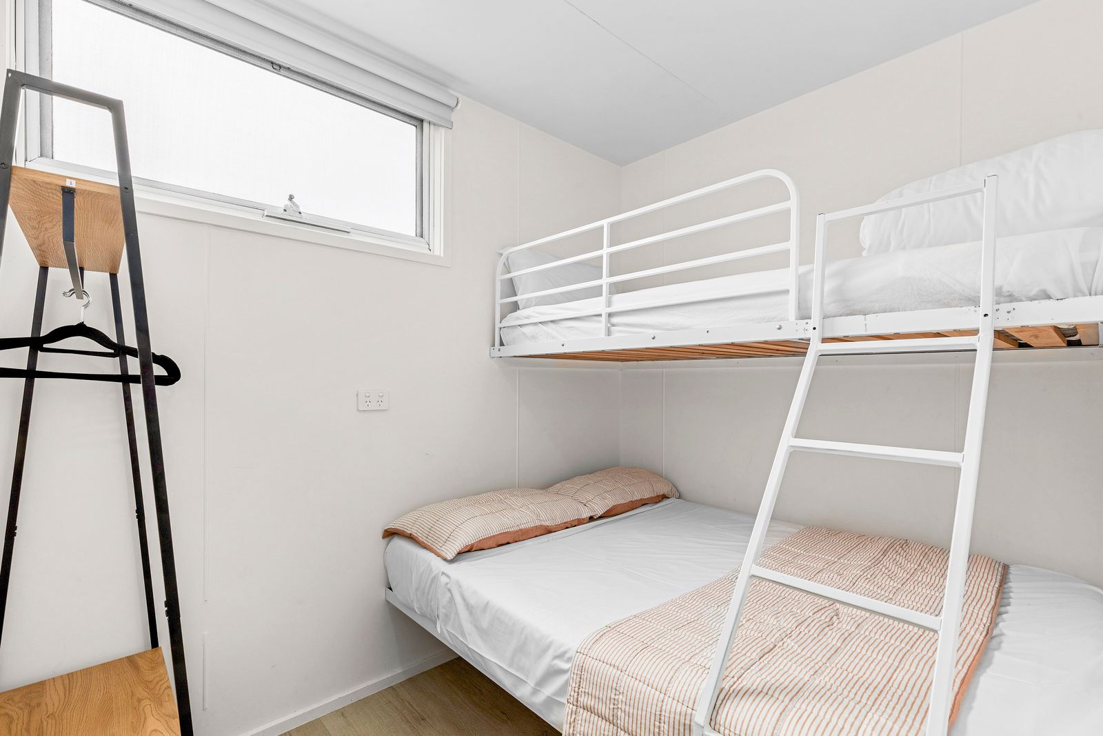 Enjoy extra space and comfort in our Queenscliff 3 Bedroom Cabins, designed to accommodate up to 6 or 8 guests. Each cabin features a queen bed in the main bedroom, with a mix of single bunks or a double bed with overhead bunk in the second and third rooms. You'll also find a private bathroom with separate toilet, a fully equipped kitchen, open-plan living area, and a private deck for relaxing outdoors. If you have a preferred room configuration, simply leave a note when booking and we’ll do our best to accommodate your request.