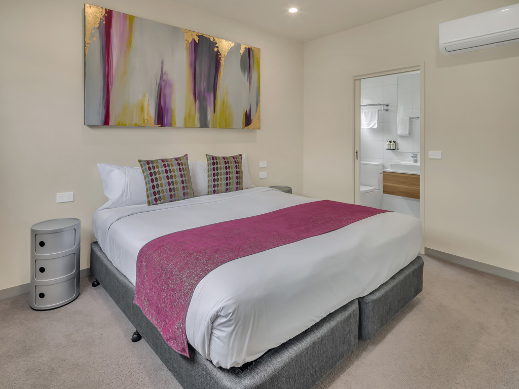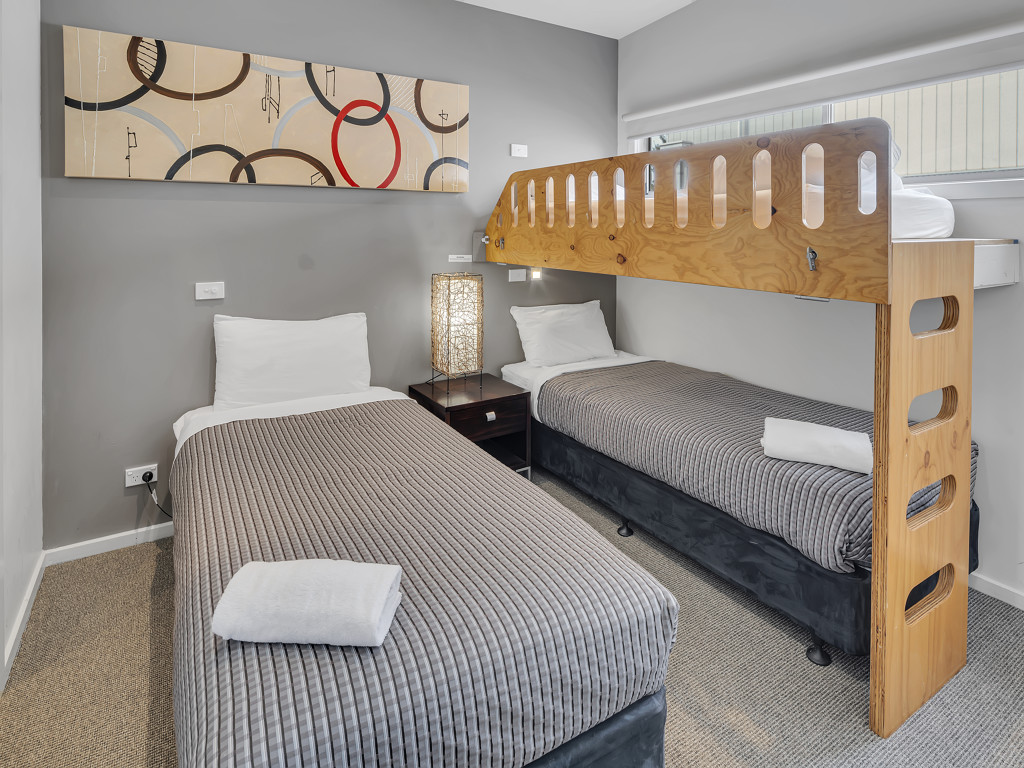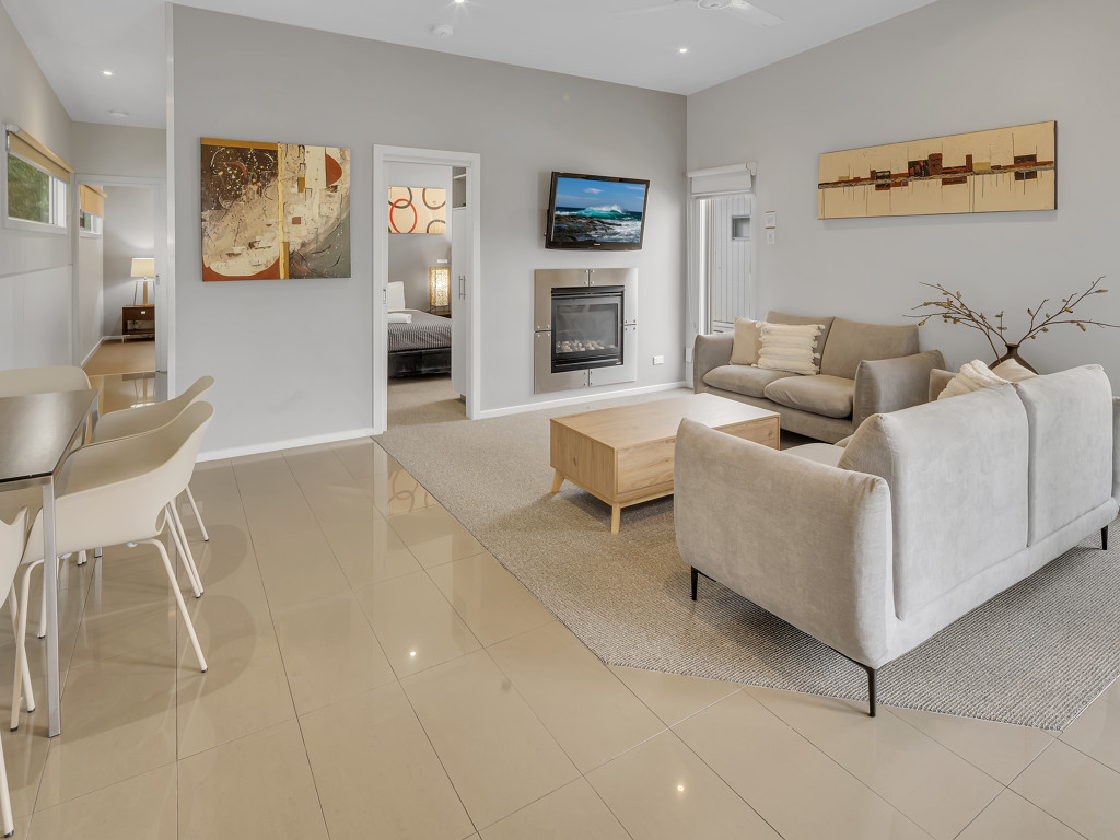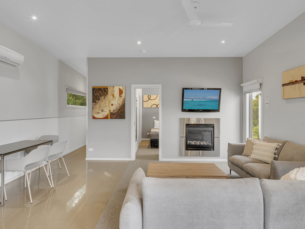 Our 2 Bedroom Villas sleep up to five guests with a king bed and ensuite in the main bedroom and a single bed, bunk, and ensuite in the second bedroom, as well as a spacious living area with fireplace, kitchen, and private deck.