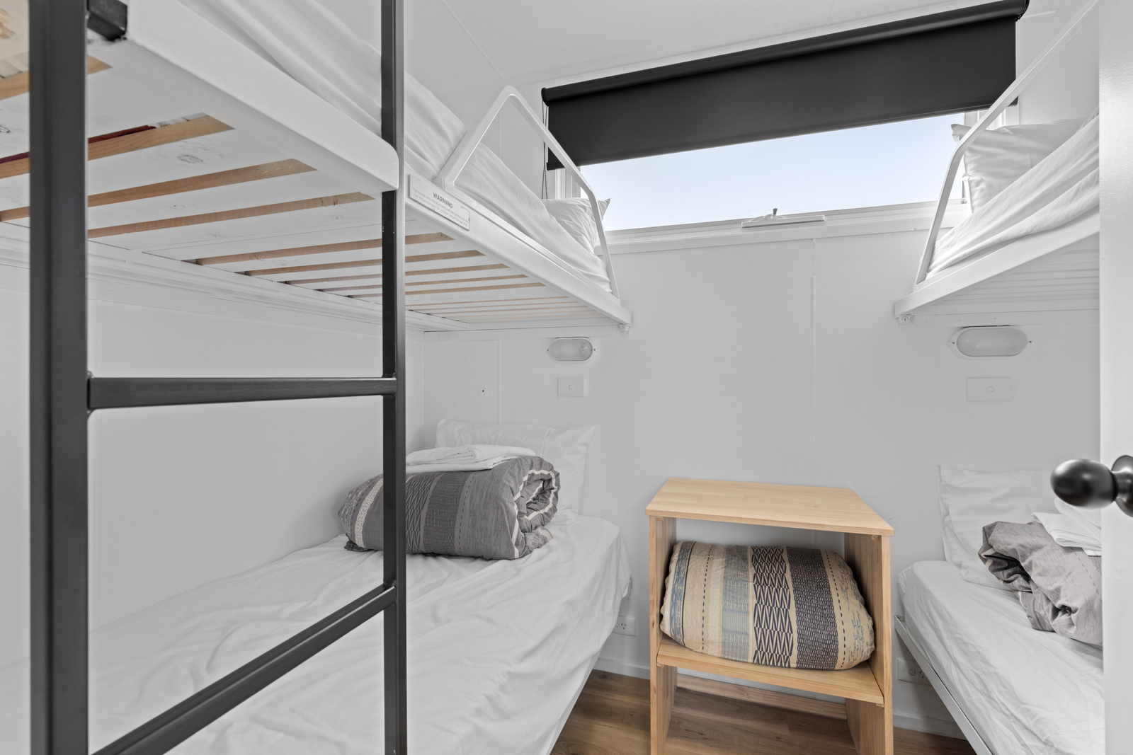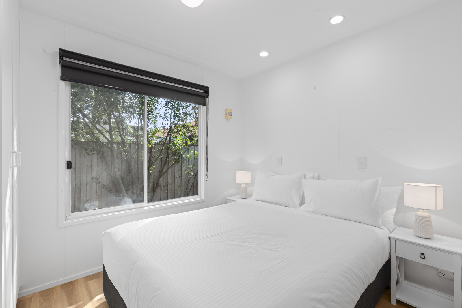 Experience a comfortable stay with a view of the pool. Our 2 Bedroom Poolview Villas sleep up to six guests with a queen bed in the main bedroom and two bunks in the second bedroom, as well as a bathroom, living area, kitchen, and private deck.