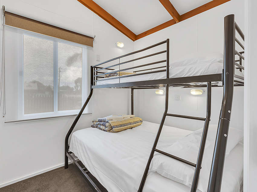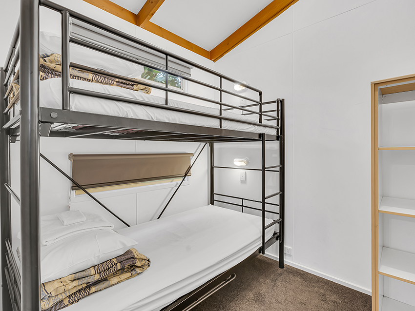 Enjoy extra space and comfort with a view of the pool. Our 3 Bedroom Poolview Villa sleeps up to seven guests (max four adults) with a queen bed in the main bedroom, a bunk in the second bedroom and a double with bunk overhead in the third bedroom, as well as a bathroom, living area, kitchen, and private deck.