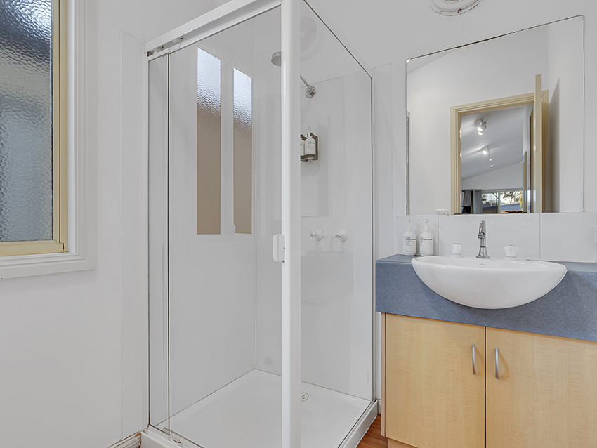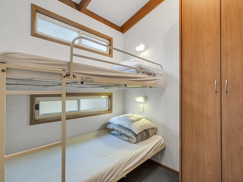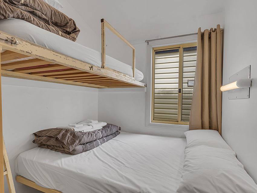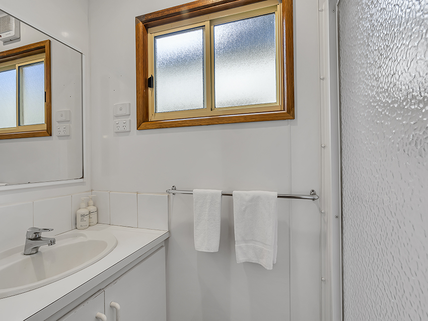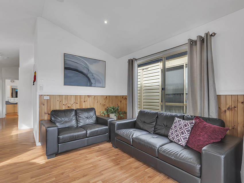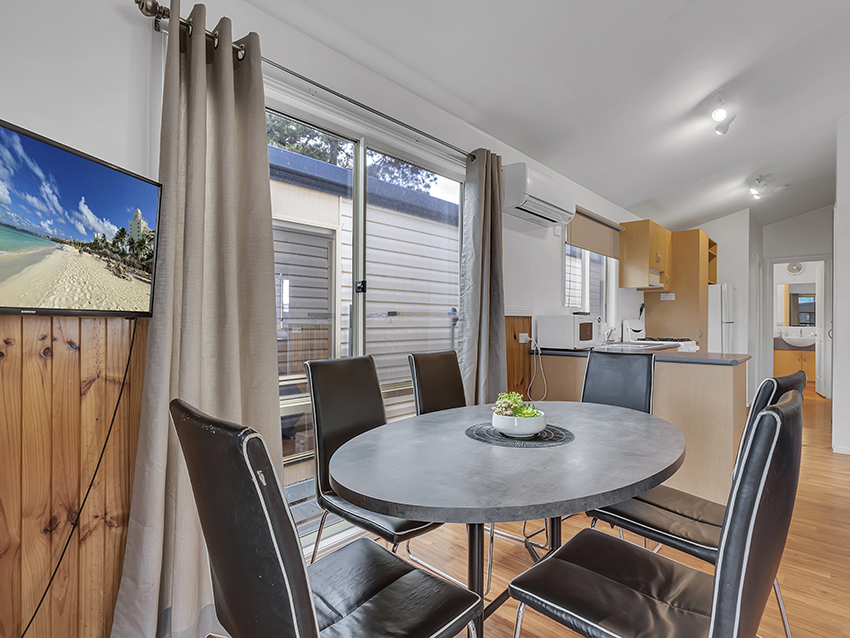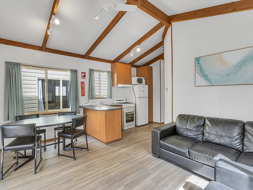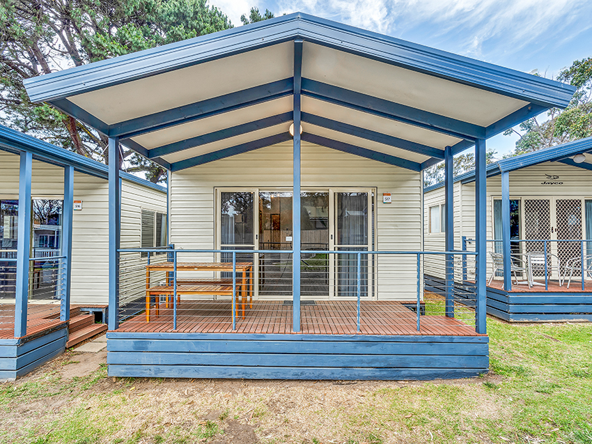 Enjoy a spacious stay near the coast. Our 3 Bedroom Villa sleeps up to seven guests with a queen bed in the main bedroom, and either double beds or double beds with single bunks overhead in the second bedroom, as well as a bathroom, living area, kitchen, and private deck.
