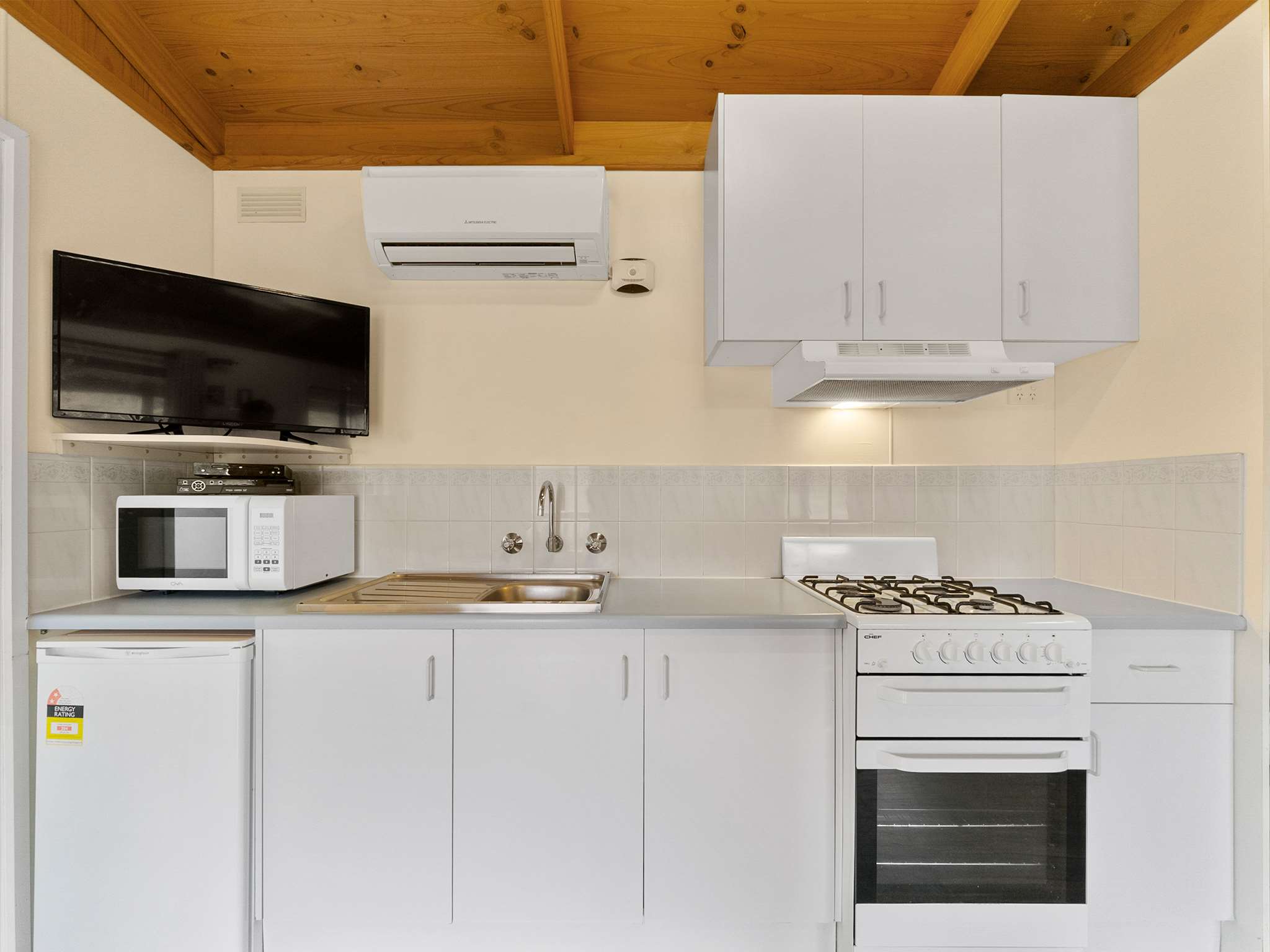 Located close to park facilities including camp kitchen, barbecues and TV room. One bedroom. One double and two single beds. Features air-conditioning; kitchen with fridge, oven, stovetop and microwave; bathroom; dining and seating area; outdoor seating; TV and DVD.