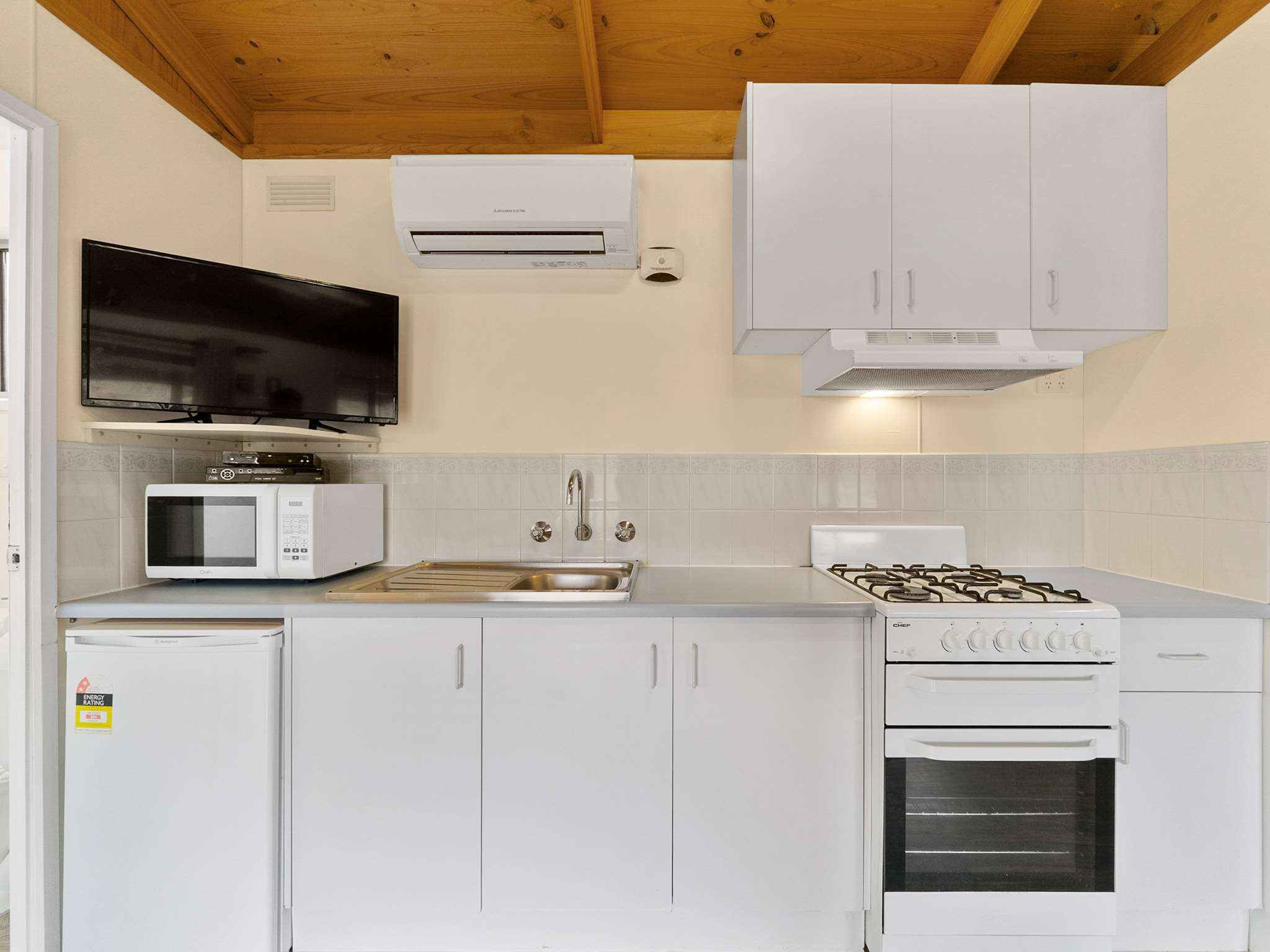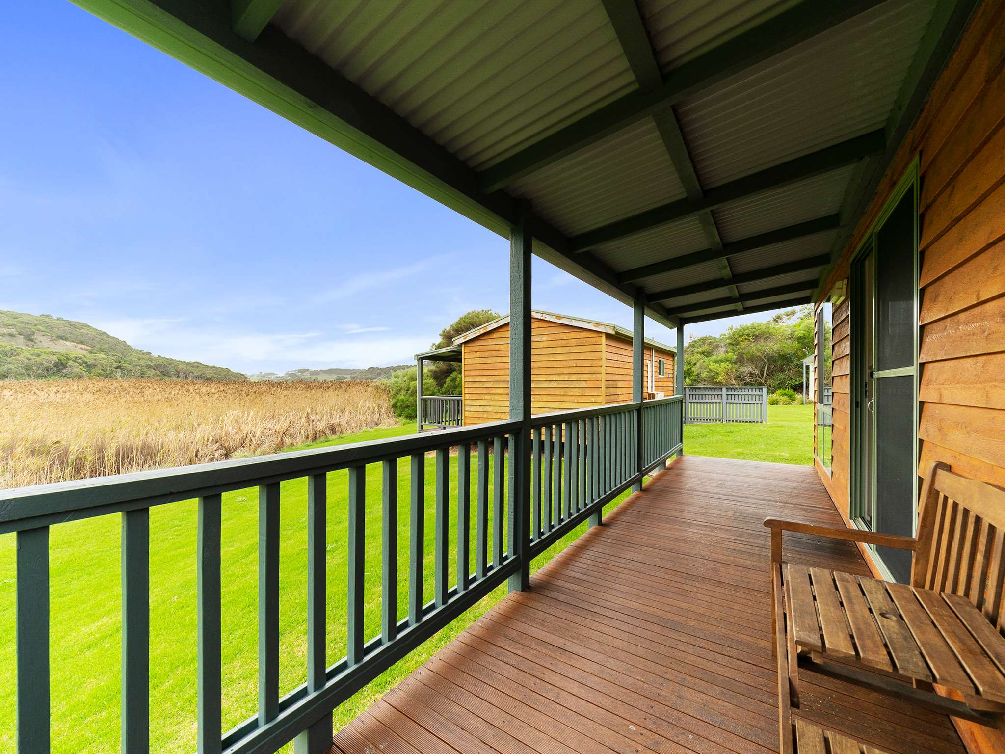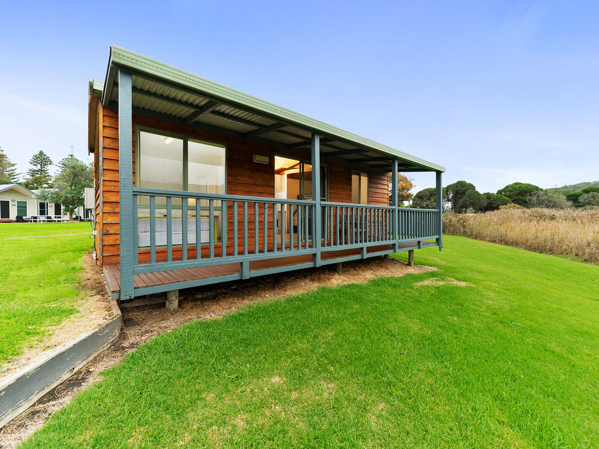 Cabin located overlooking the creek. One bedroom. One double and one double with single bunk. Features air-conditioning; full kitchen with fridge, oven, stovetop and microwave; bathroom; veranda and dining; TV and DVD.