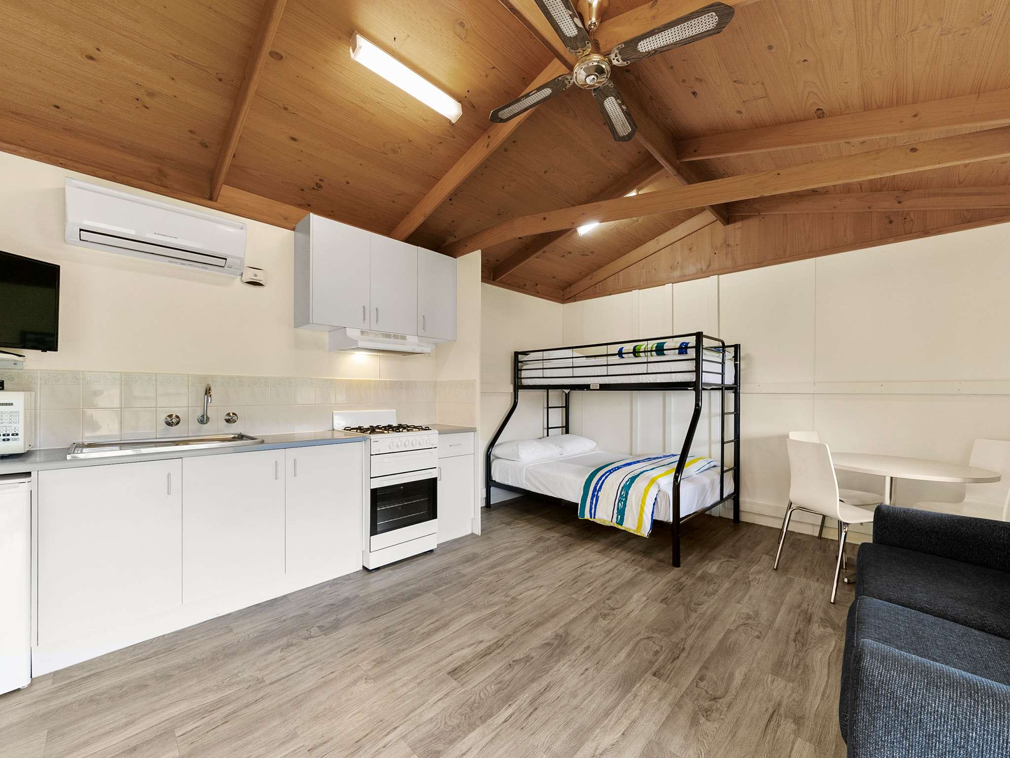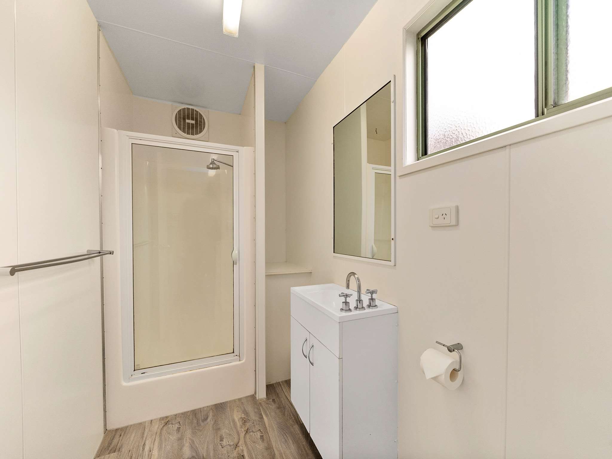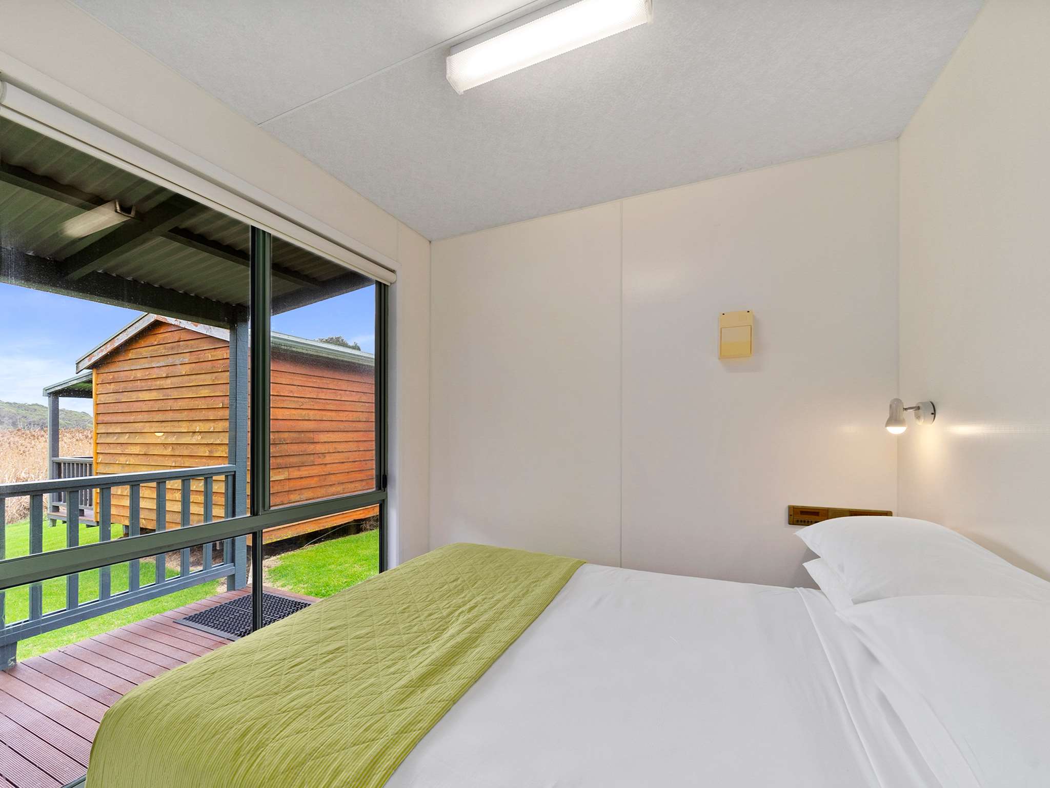 Cabin located overlooking the creek. One bedroom. One double and one double with single bunk. Features air-conditioning; full kitchen with fridge, oven, stovetop and microwave; bathroom; veranda and dining; TV and DVD.