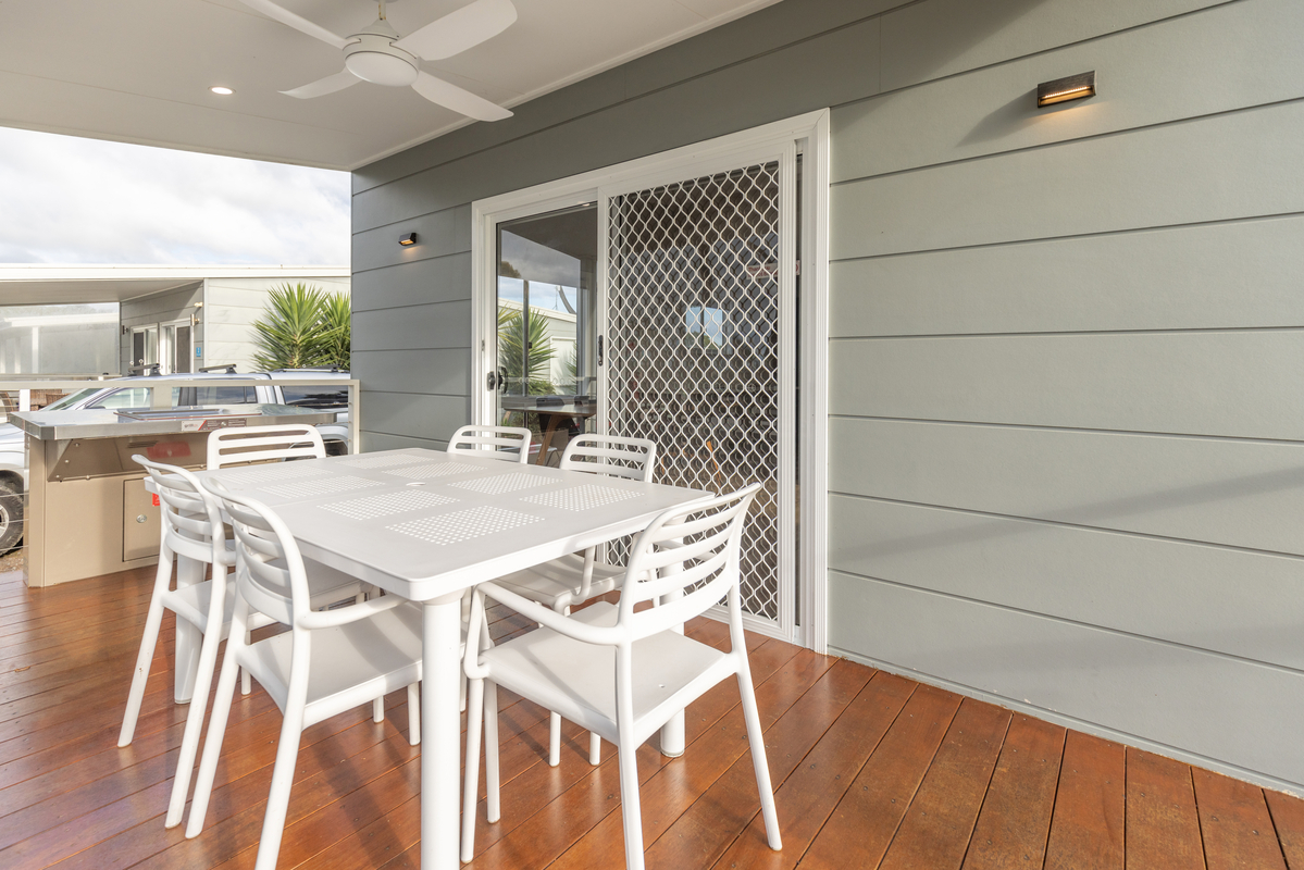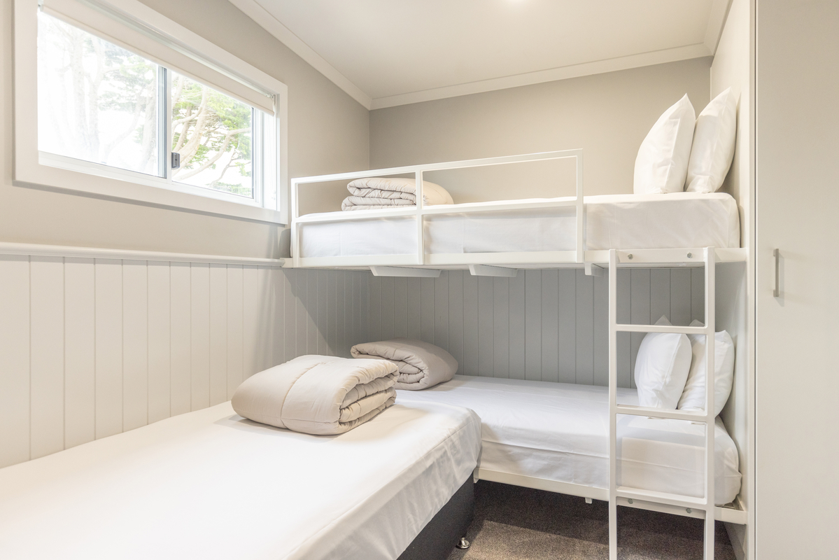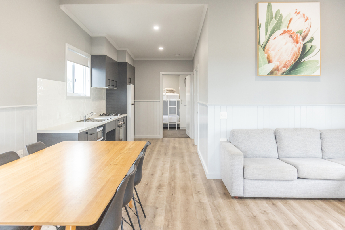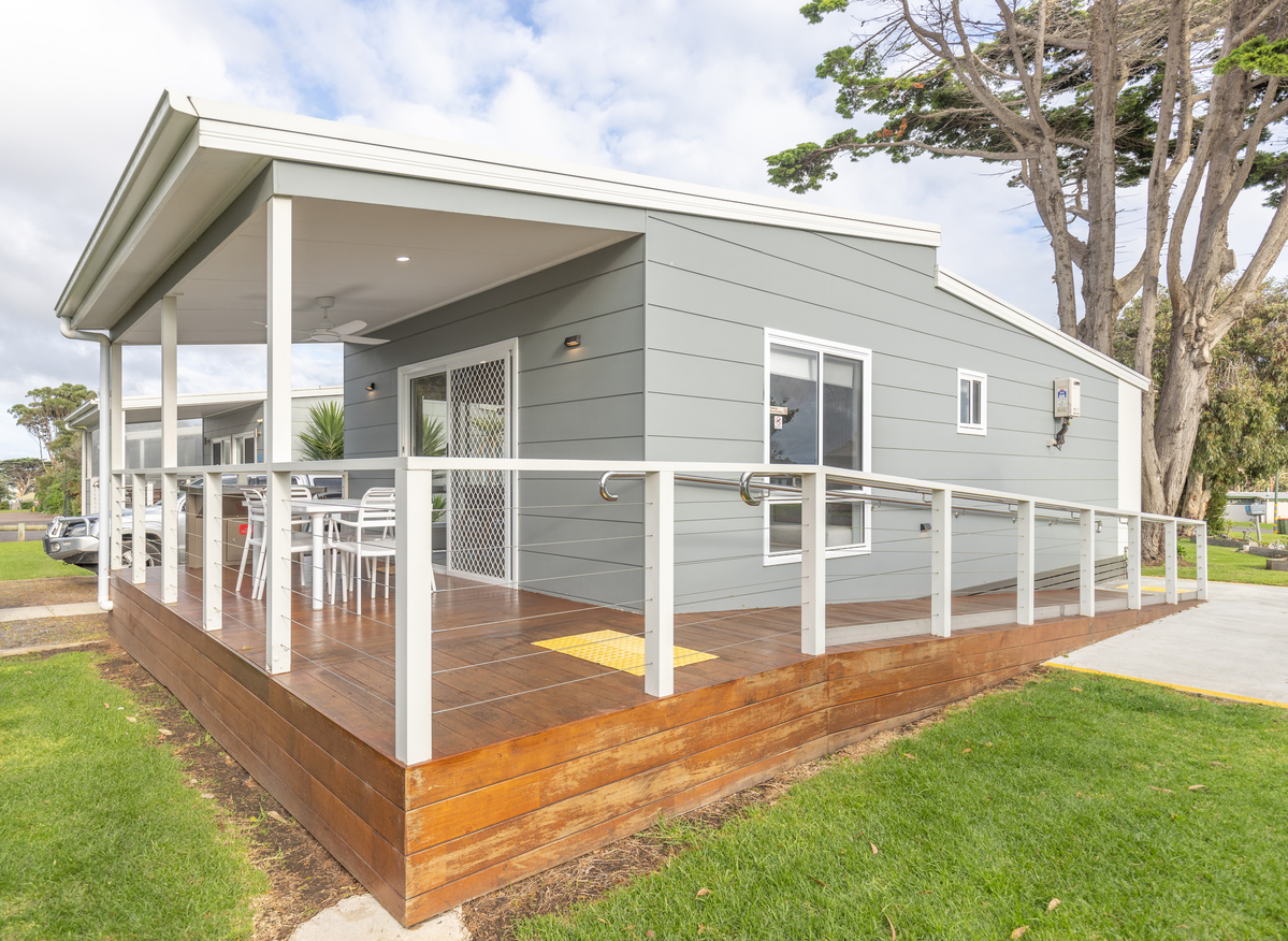 Two bedroom cabin overlooking the ocean. One queen, one king single bunk and one single sleeping up to five. Features include ramp access, air-conditioning; heating; full kitchen including stovetop, oven, dishwasher, microwave and fridge; accessible bathroom; patio with outdoor dining; lounge and dining area with TV and DVD; accessible car parking next to cabin.