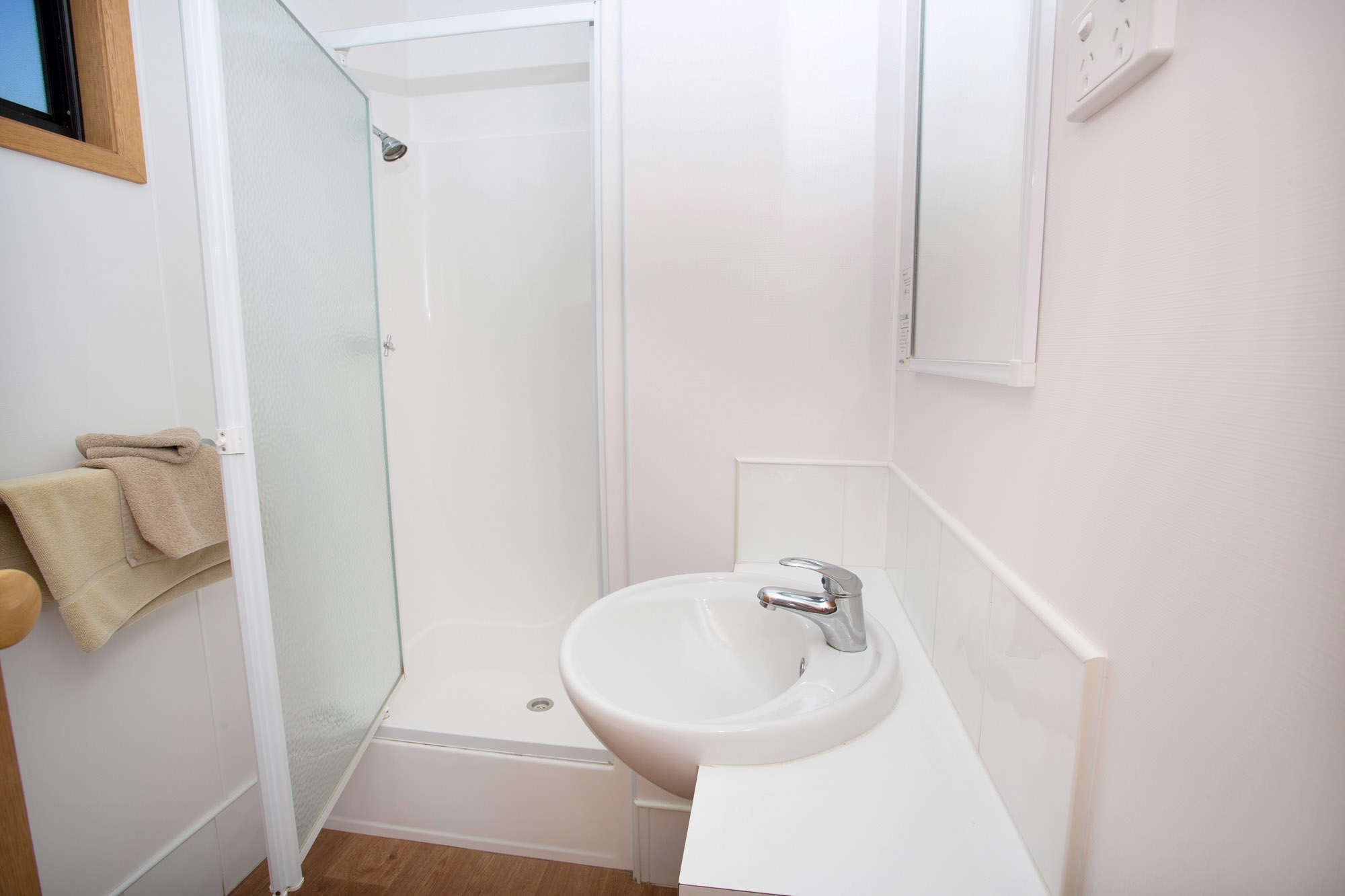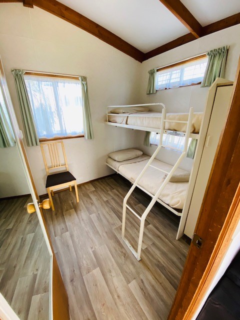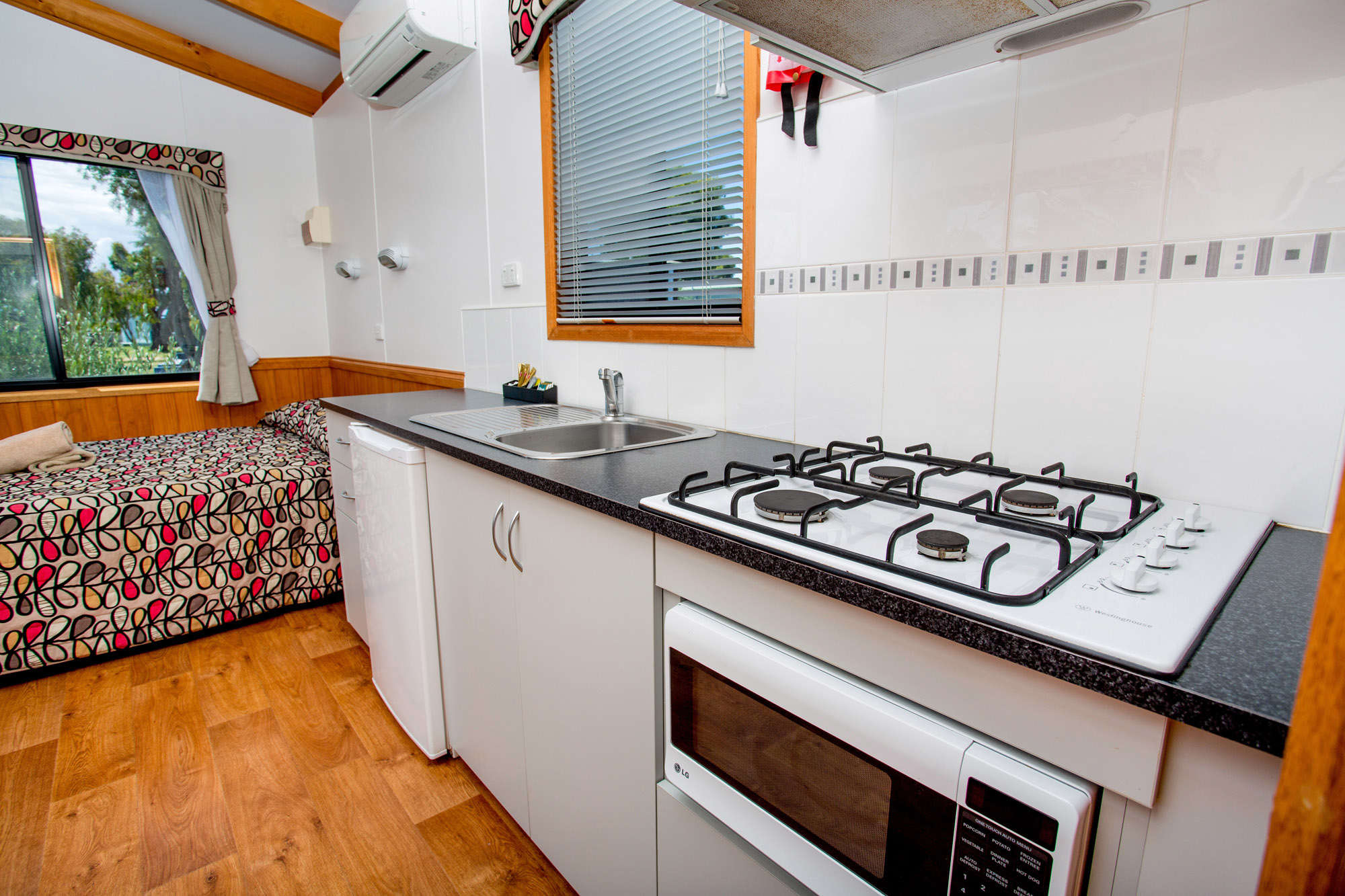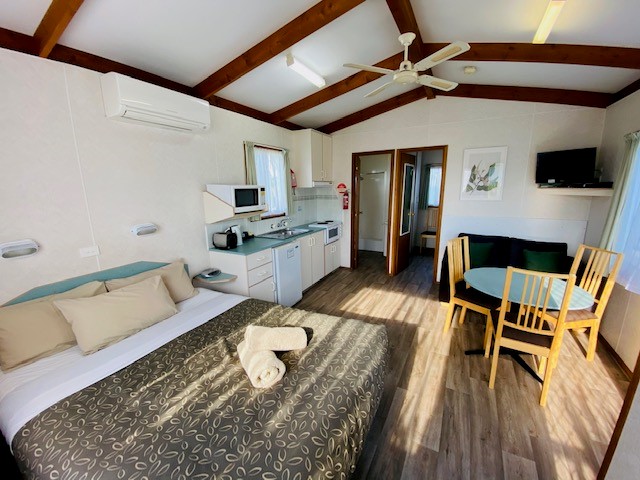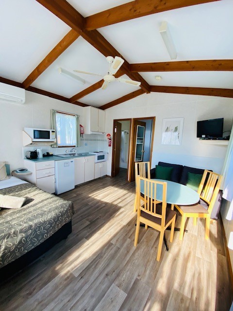This studio style cabin is fabulous for an overnight or an extended stay. The queen sized bed is in the living area & the separate bedroom has single bunks. Linen provided on all beds. The kitchen area has a cook top and small oven, a small refrigerator & microwave, table & chairs, a small sofa and LCD TV & DVD. Reverse cycle air conditioning.