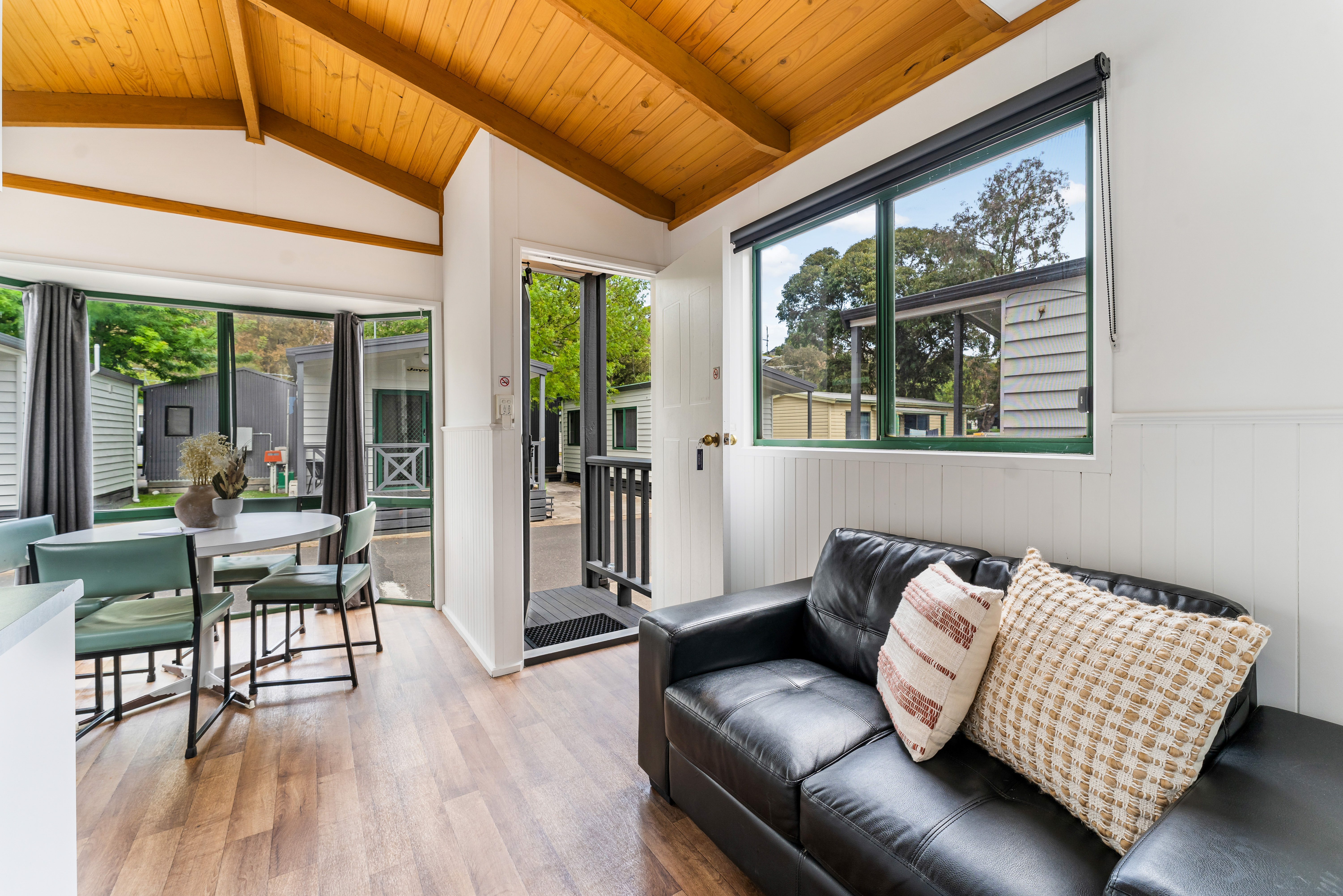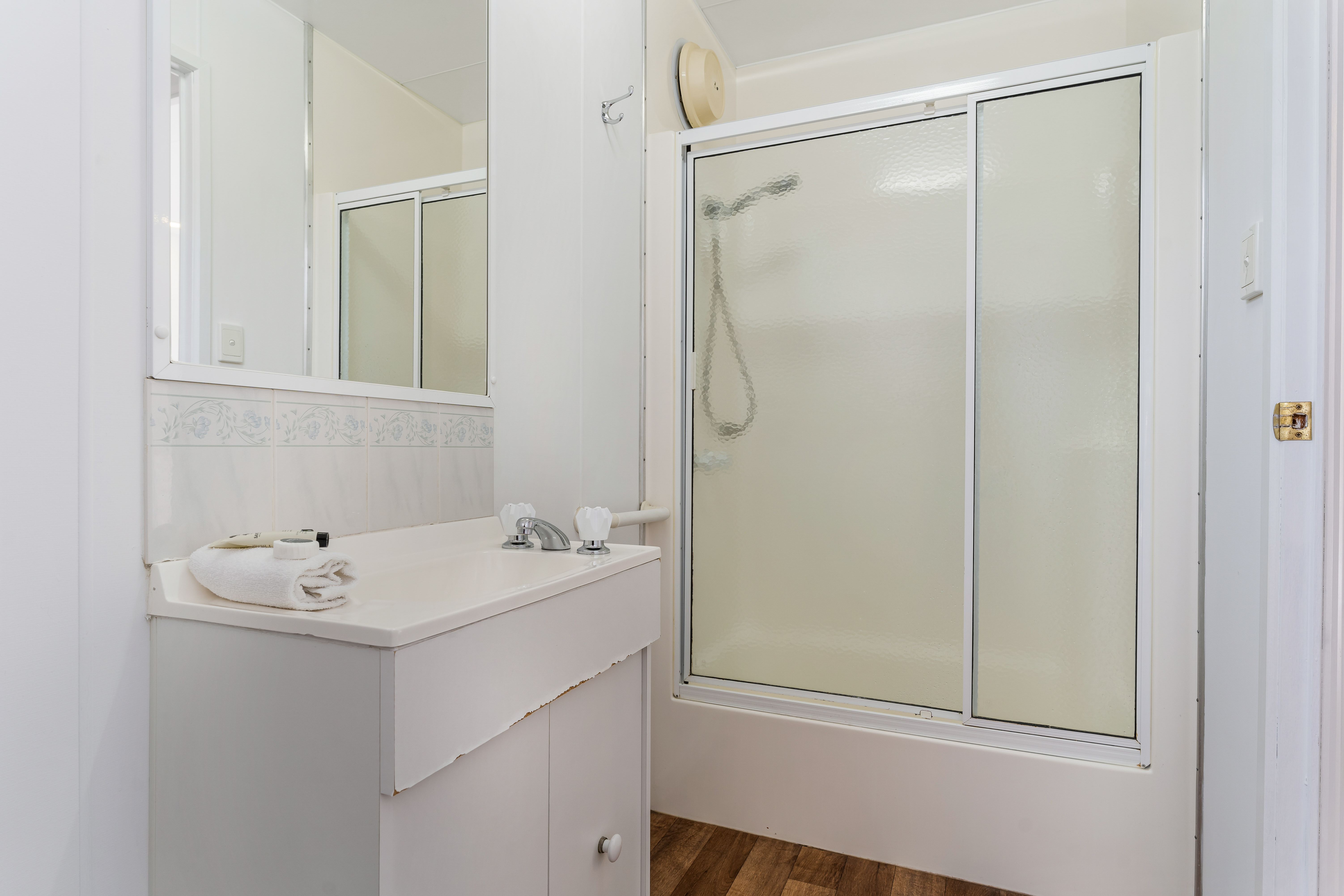 Our smallest two bedroom cabins offer amazing value for money with a small open plan kitchen, dining and lounge area, designed for guests wanting somewhere to sleep while being out during the day. These two-bedroom cabins include a queen bedroom and a second bedroom with two sets of small bunk beds, ideal for children. The family bathroom has shower and toilet facilities. A car space is located directly beside your cabin and, all linen and toiletries are included for your convenience.