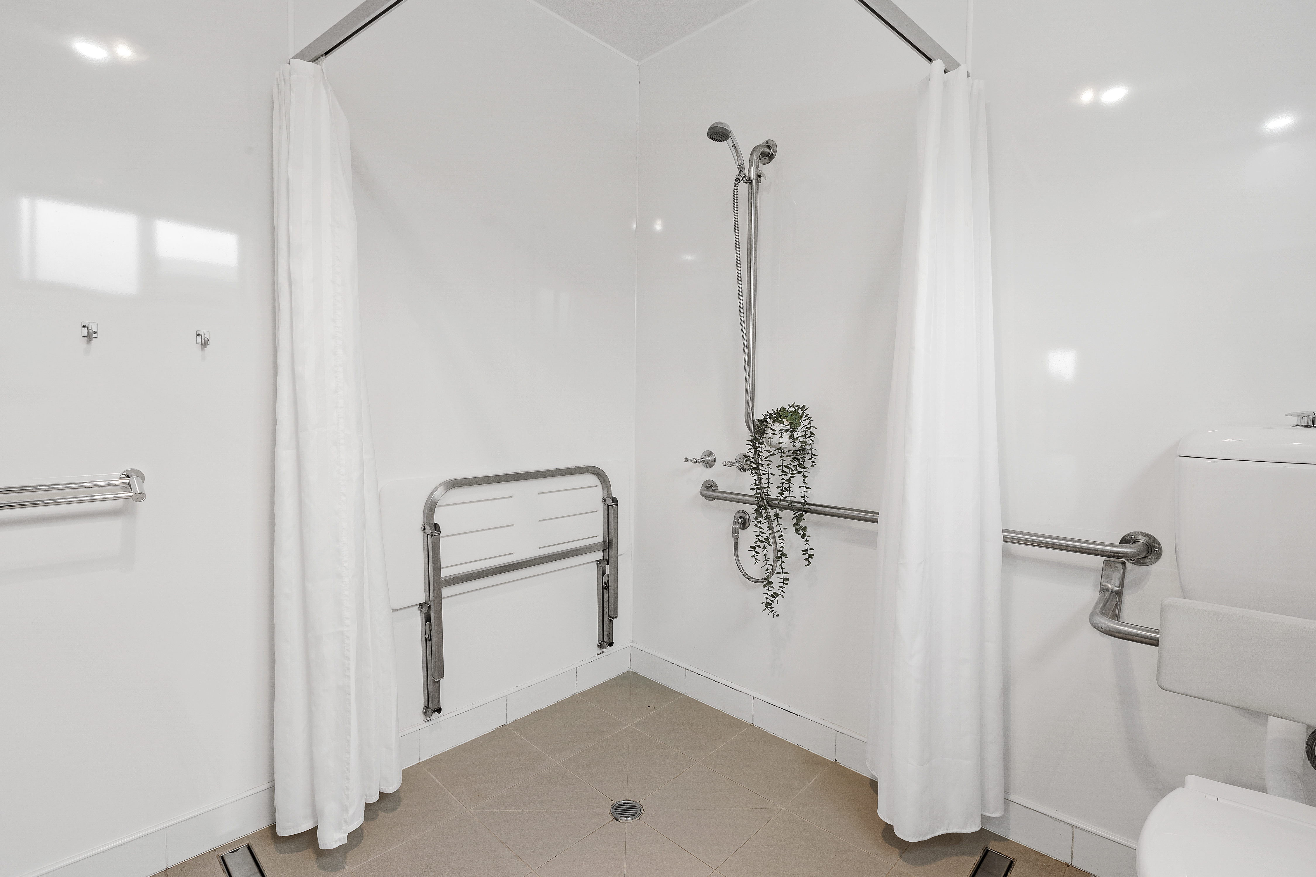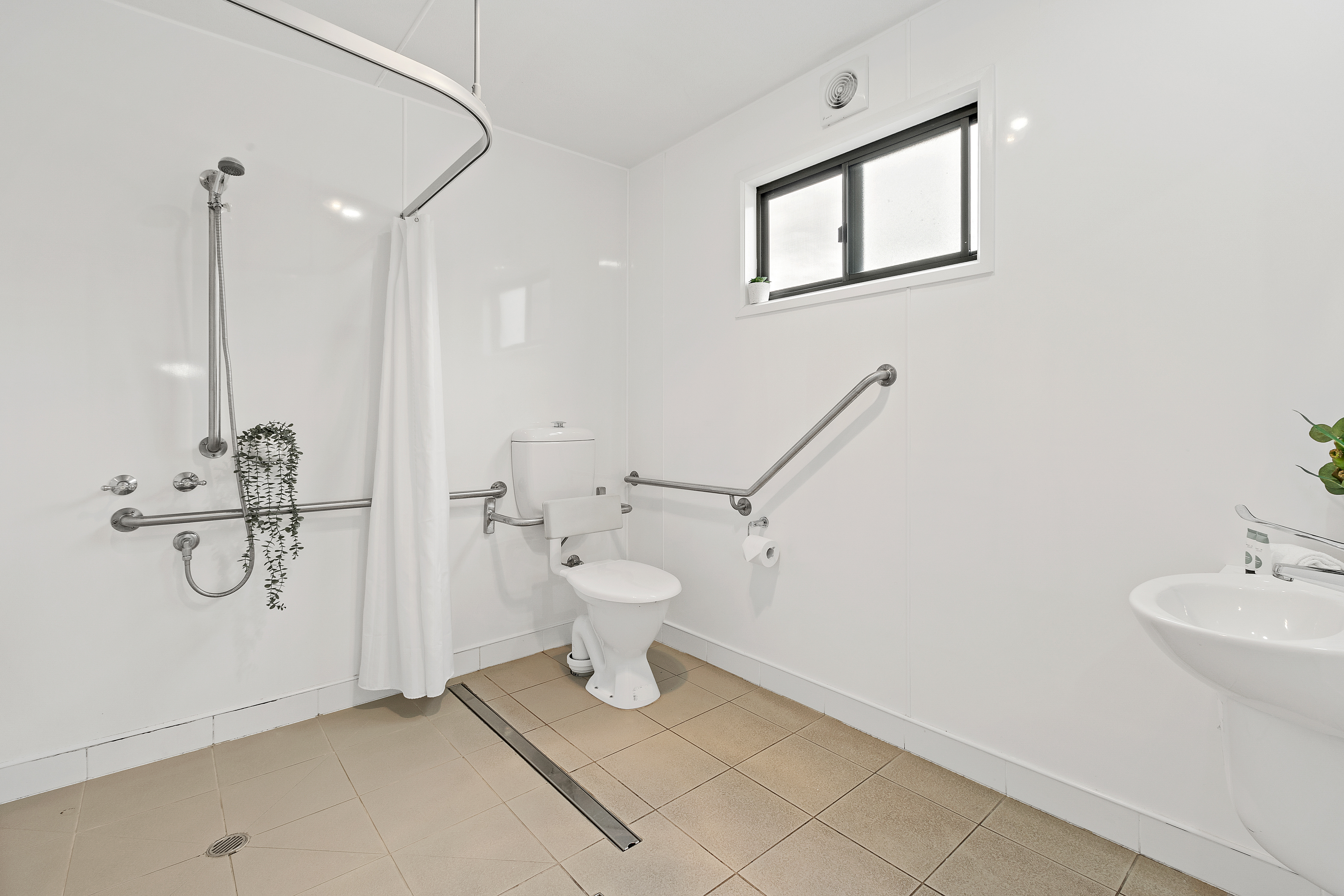 The bathroom features a roll-in shower with grab handles and, the entrance to the cabin has an accessible ramp.
