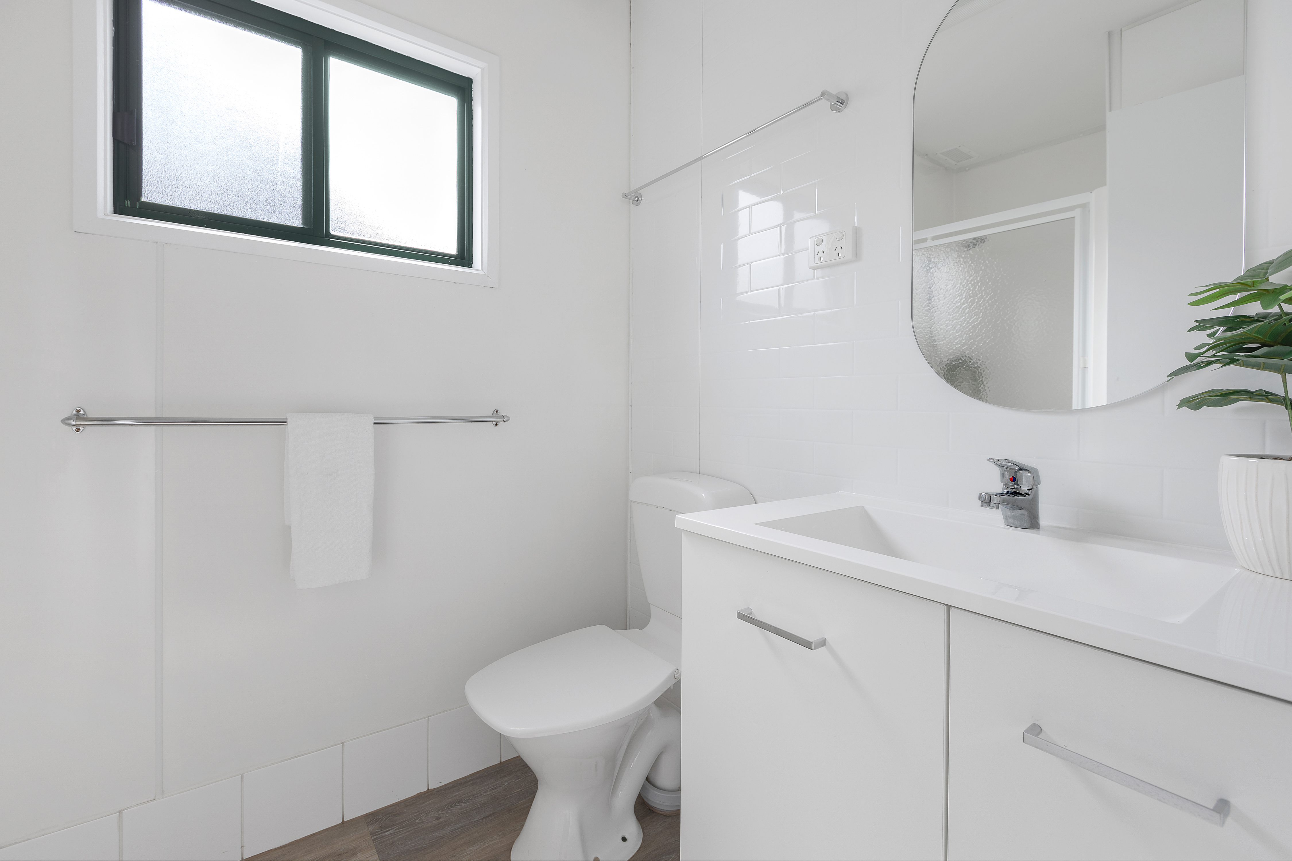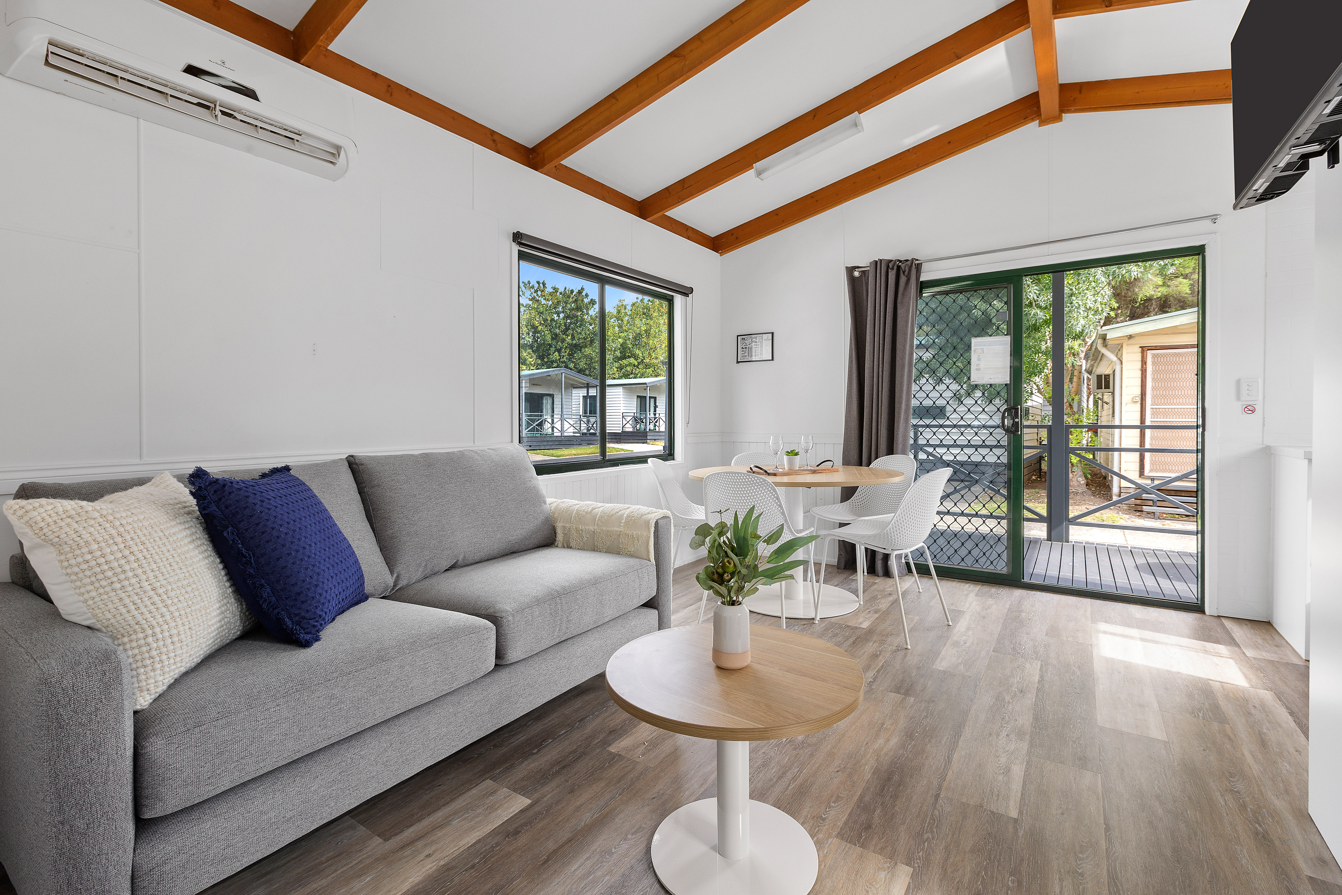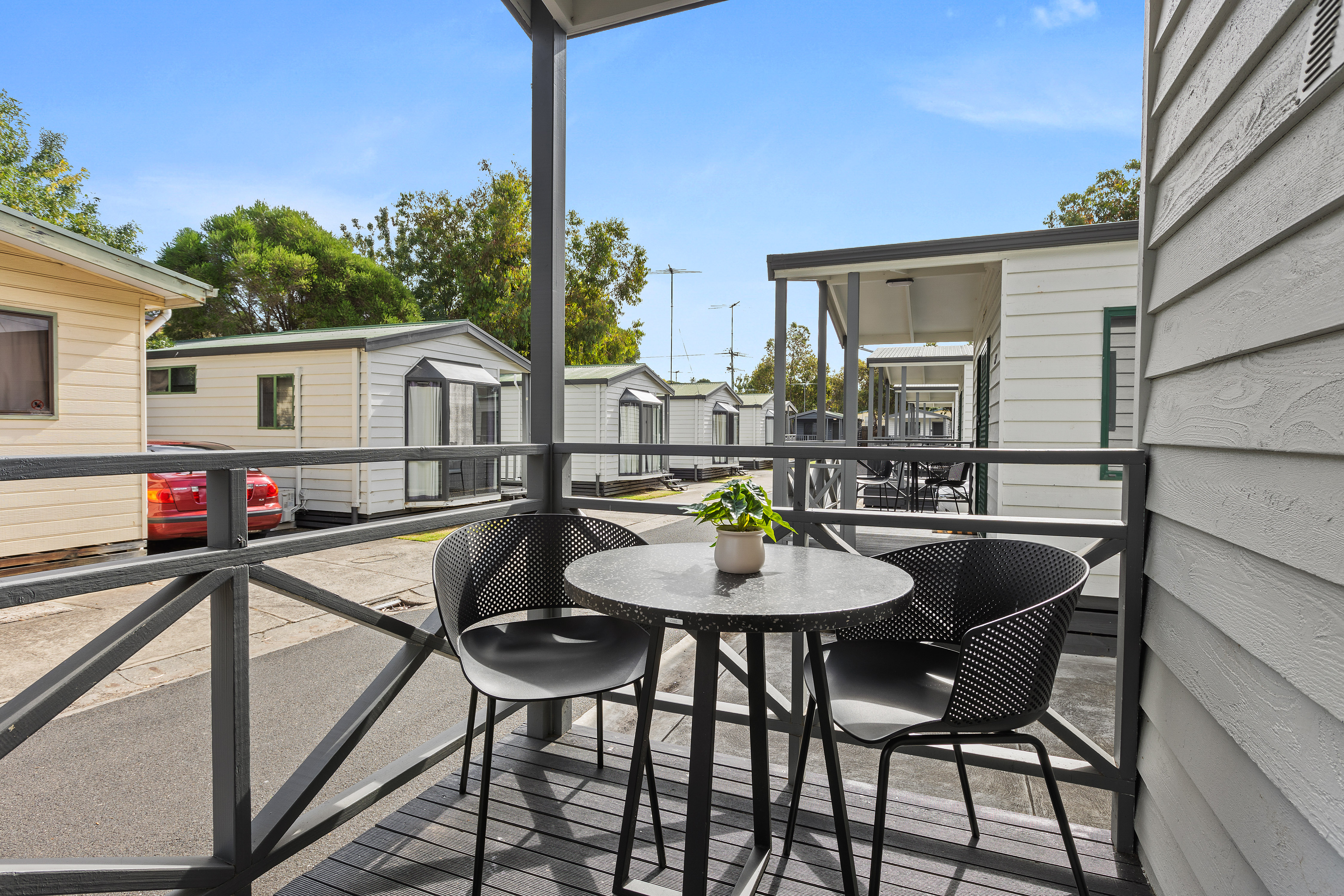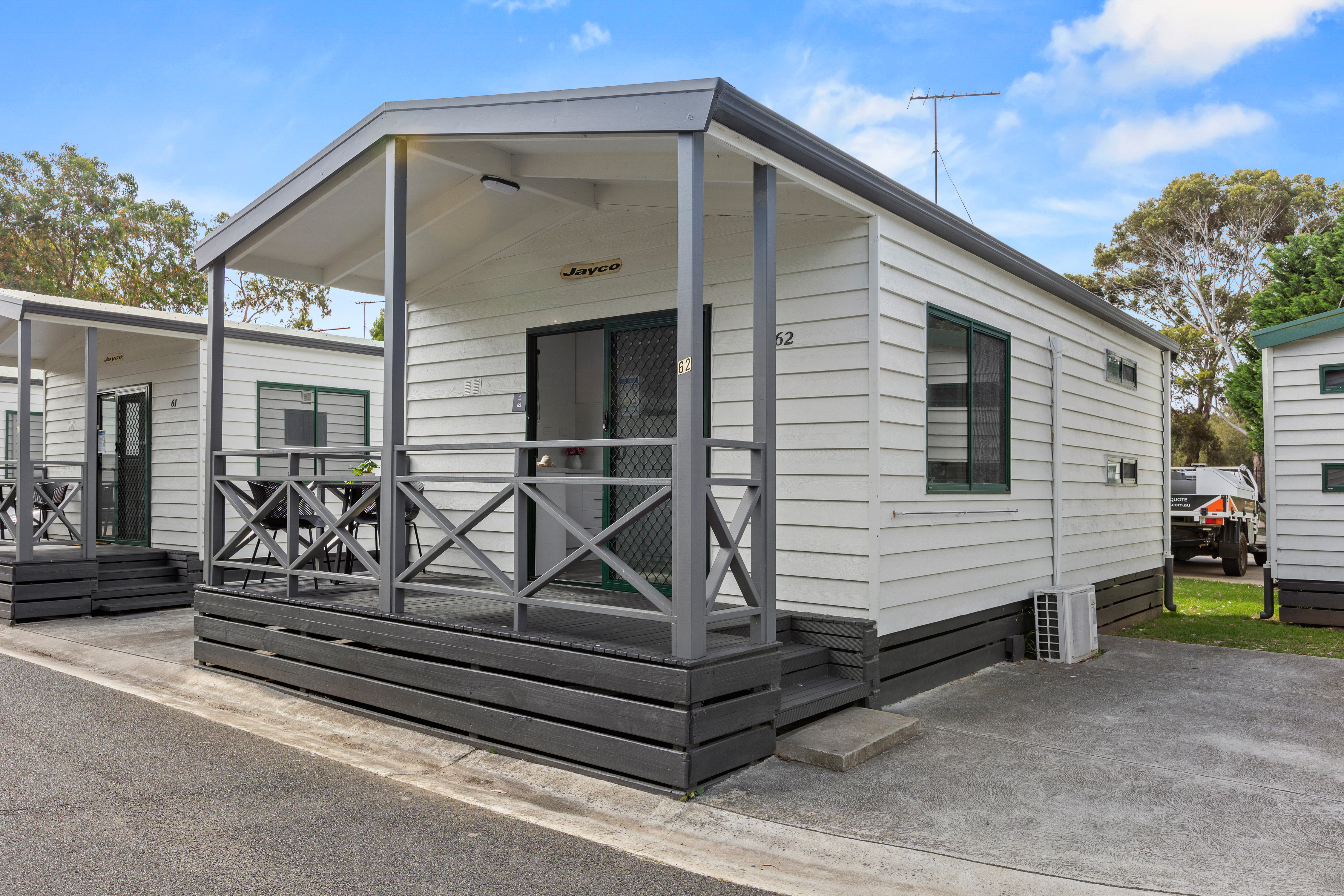 Up to four guests can enjoy our newly refurbished two bedroom cabins with a double bed in first bedroom and a second bedroom with double bunks. Sleep in comfort on our platinum hotel beds, enjoy fast free Wi-Fi, or sit back and watch Netflix on our smart TVs. Enjoy a glass of wine on your balcony, or prepare something for dinner in your own kitchen with fridge, hotplates and convection microwave. Each cabin features a full bathroom with shower and a toilet. A car space is located directly beside your cabin and, all linen and toiletries are included for your convenience.
