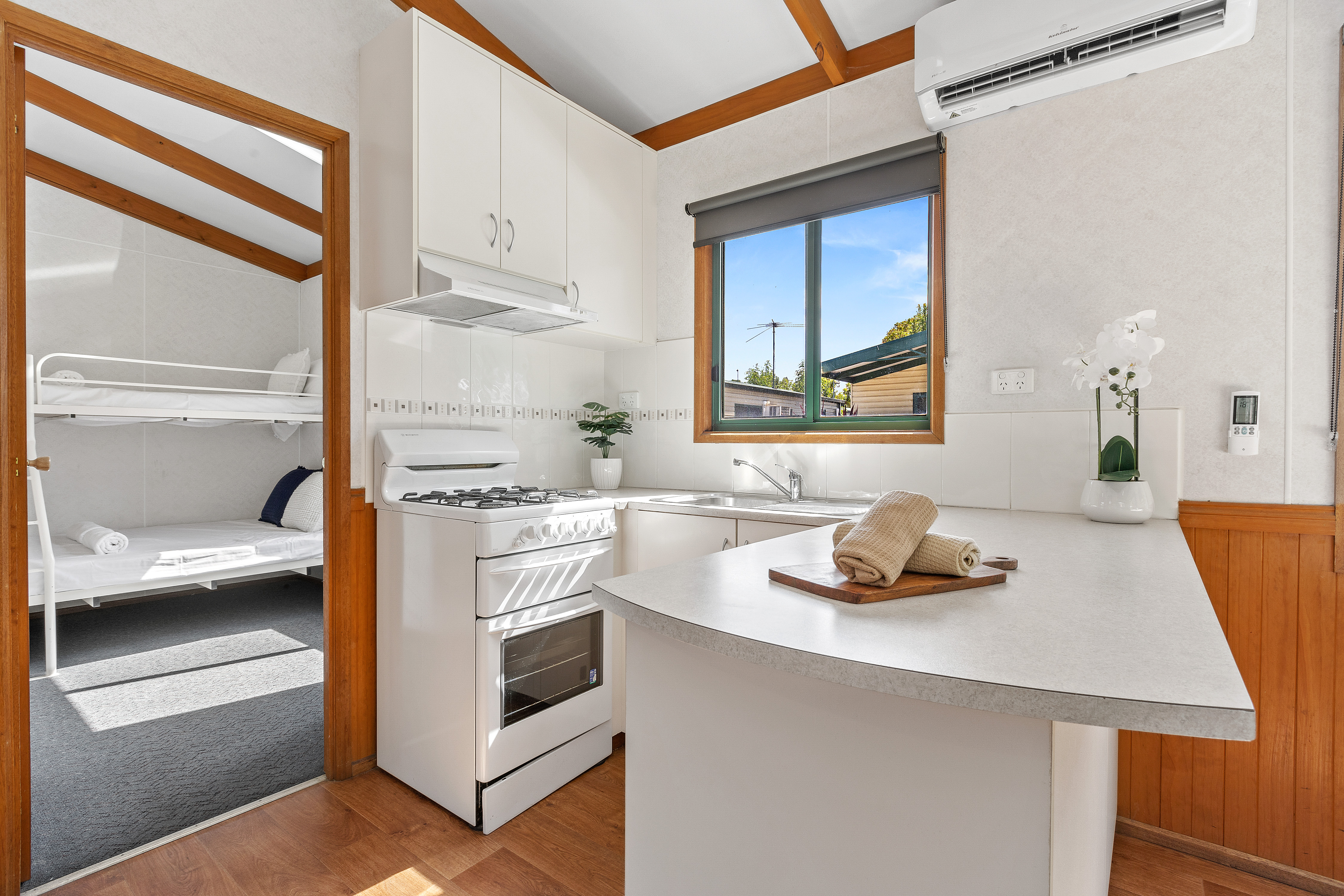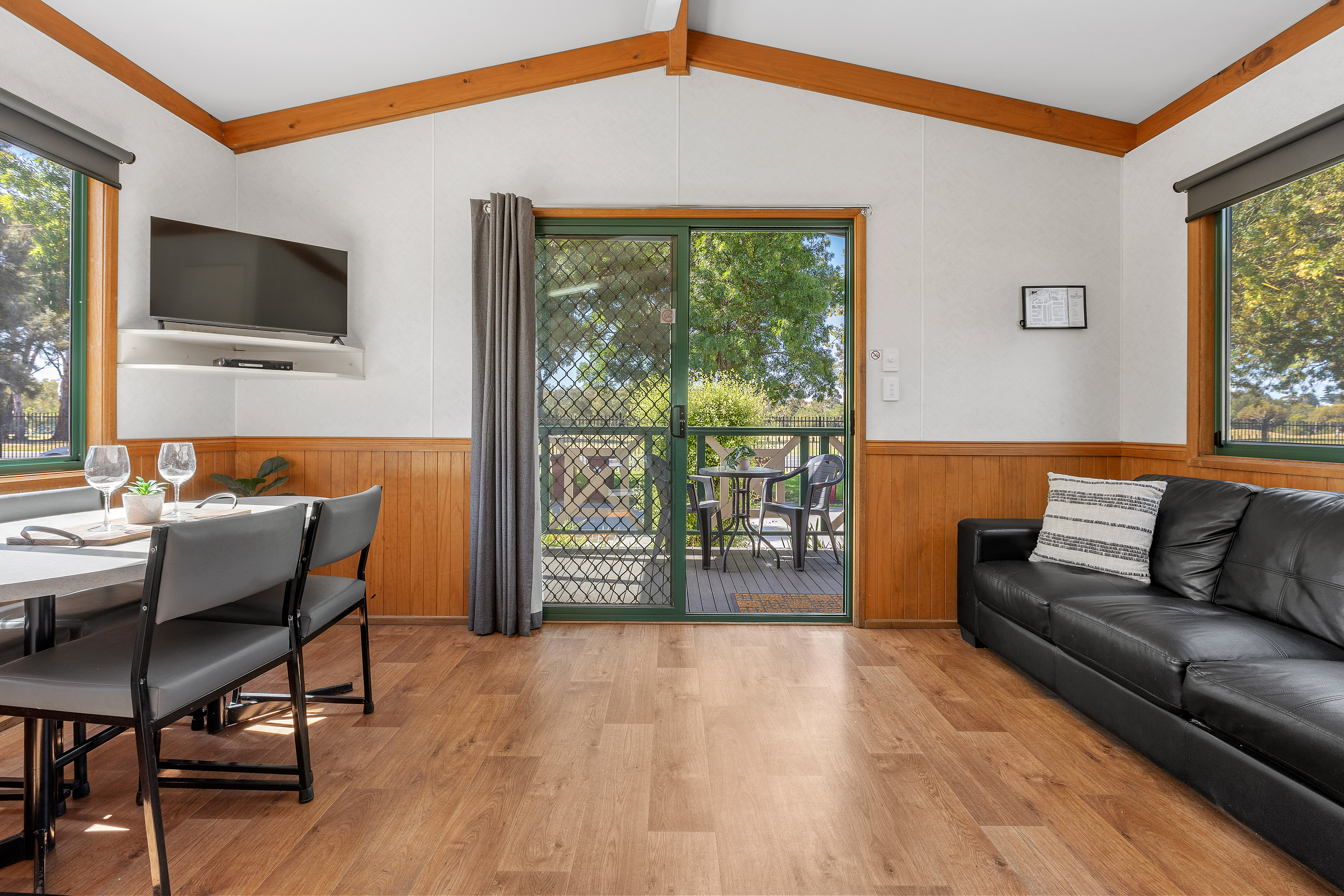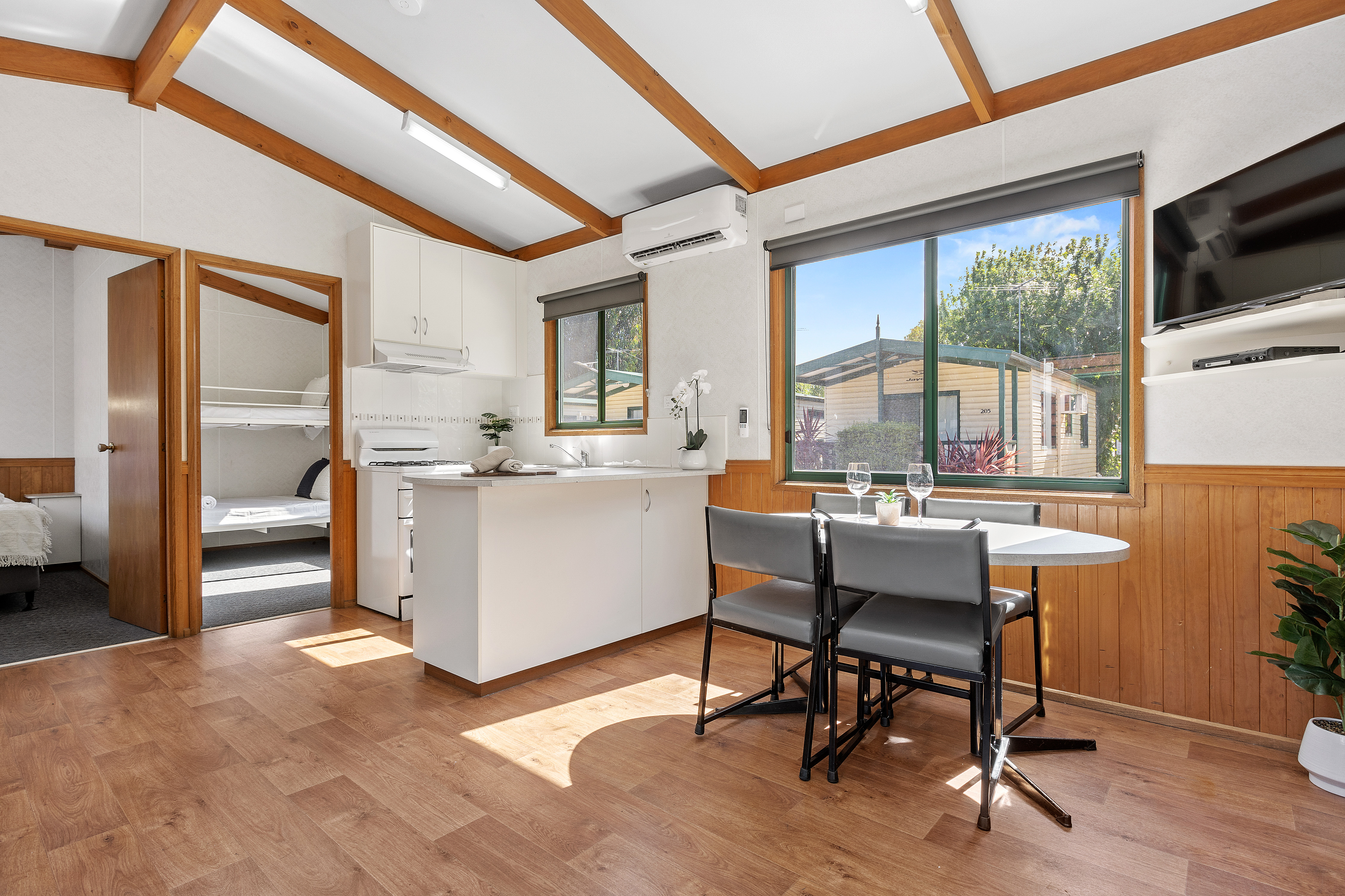 Our original two bedroom cabins offer great value for money with an open plan kitchen, dining and lounge area, ideally suited to guests on a budget.