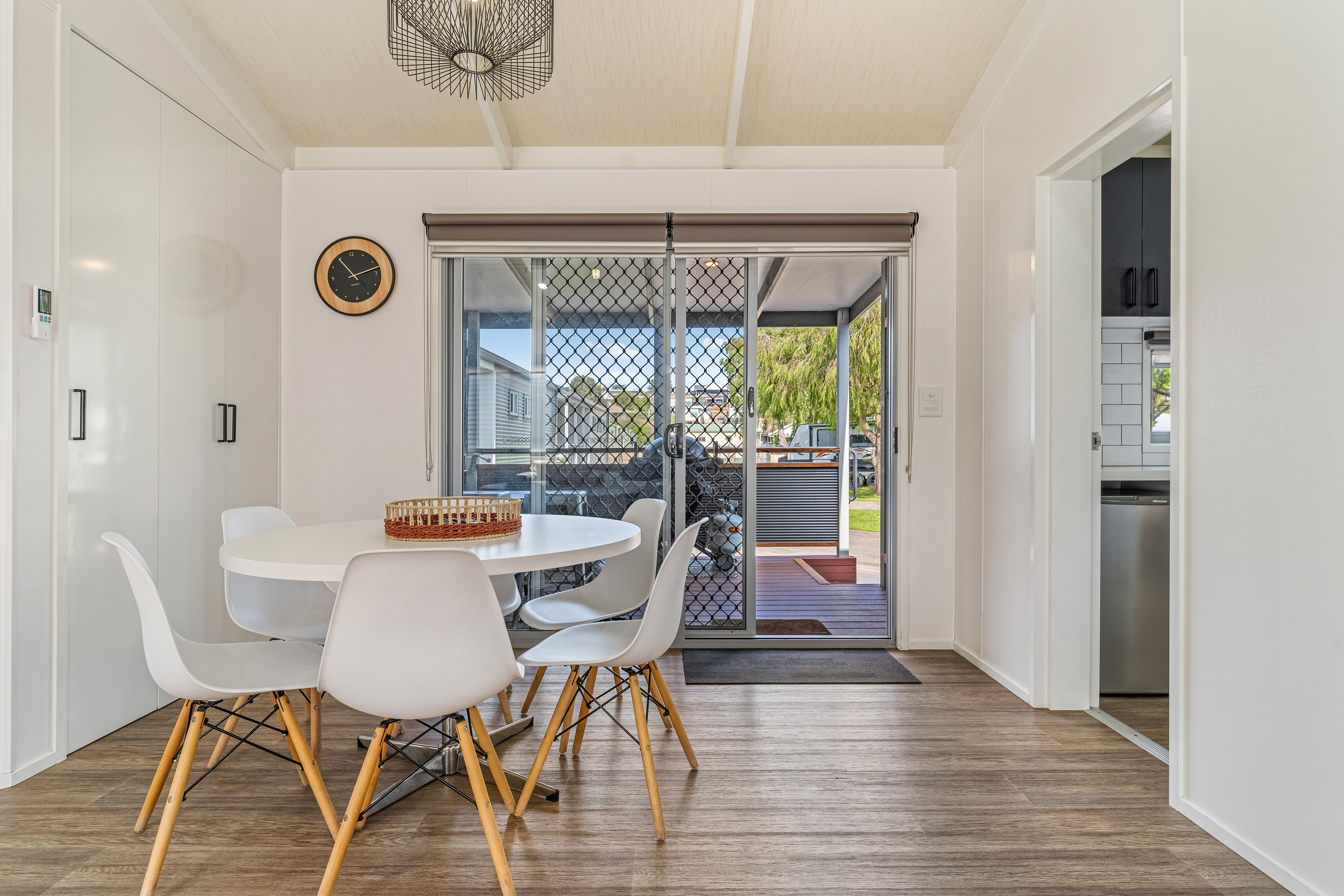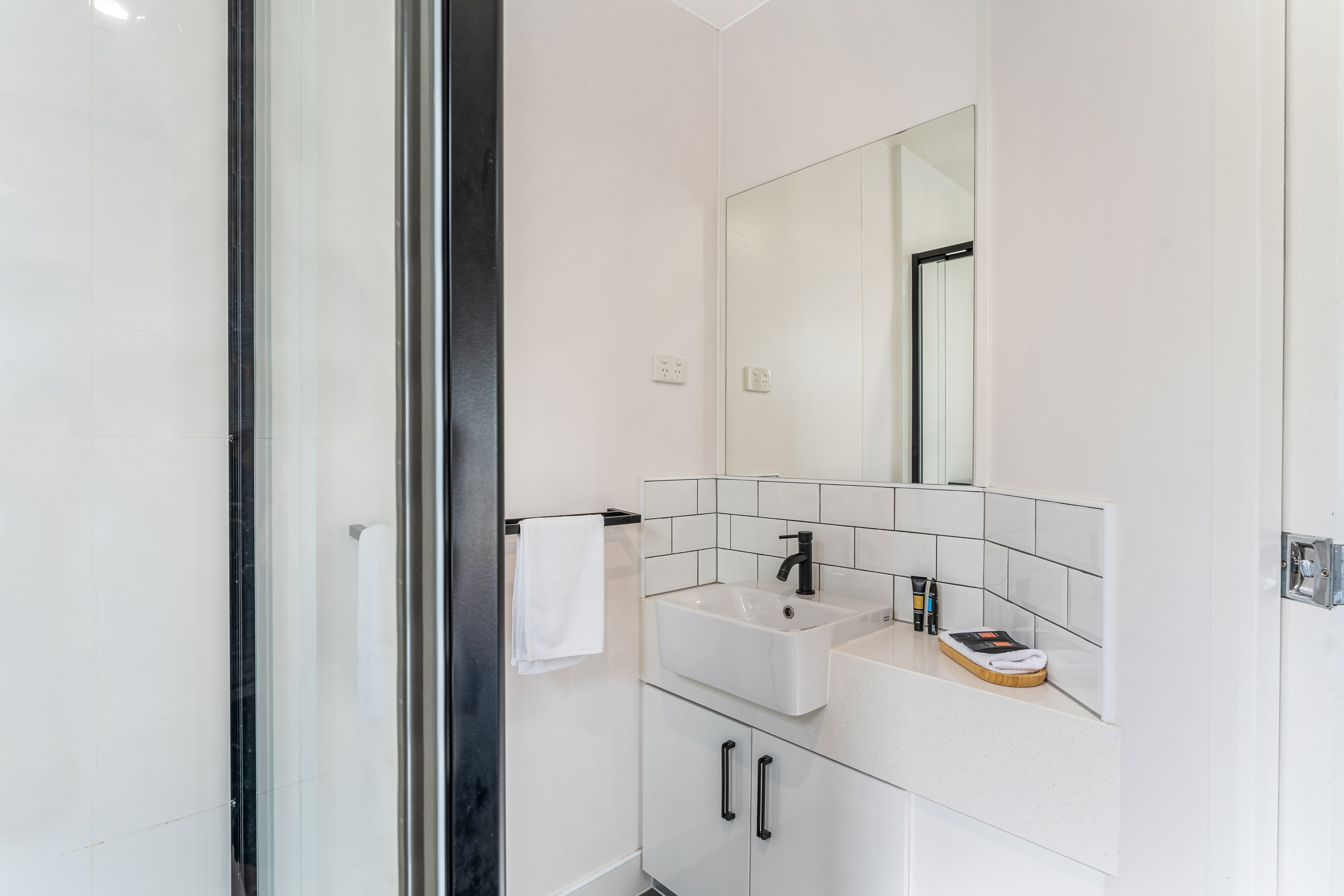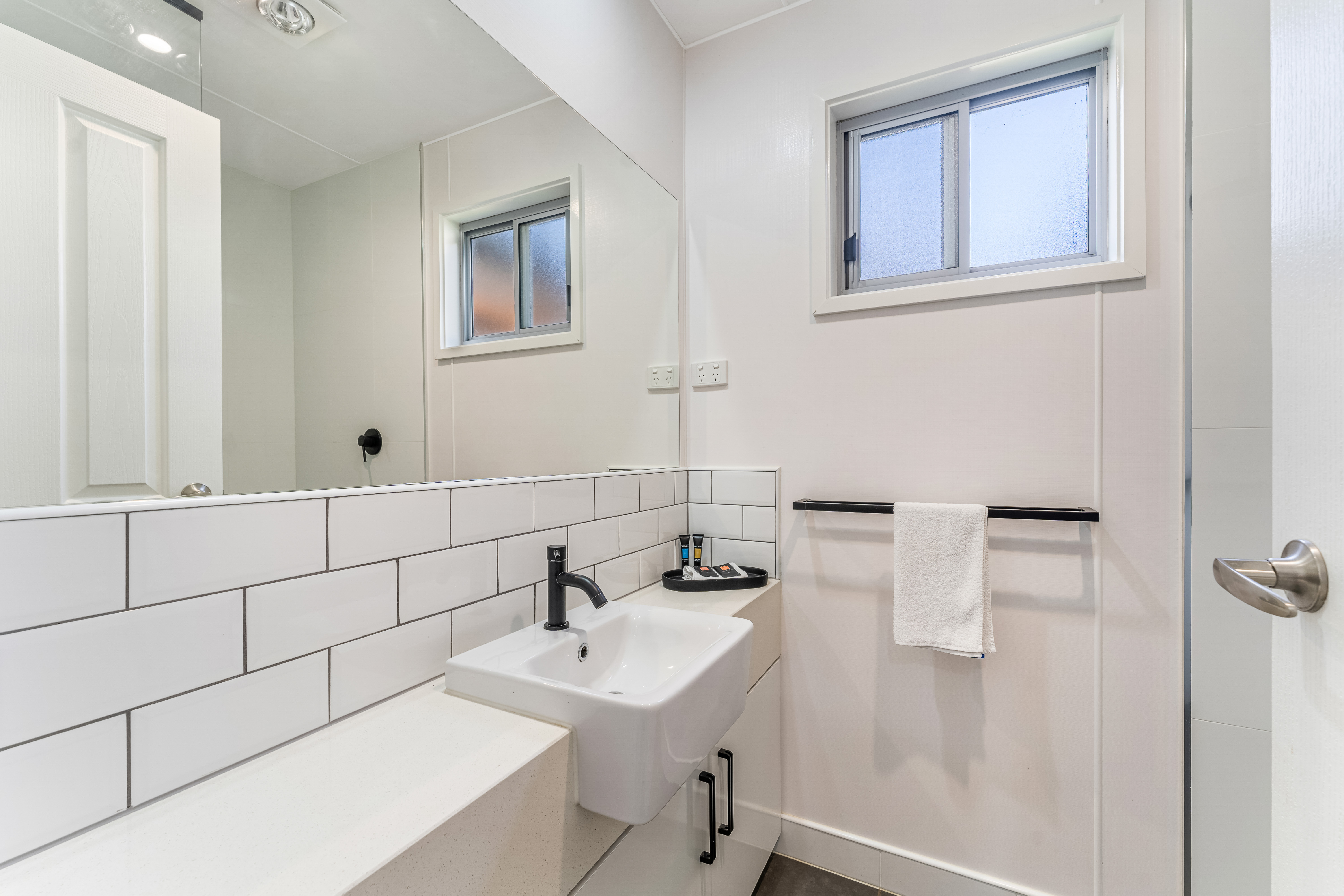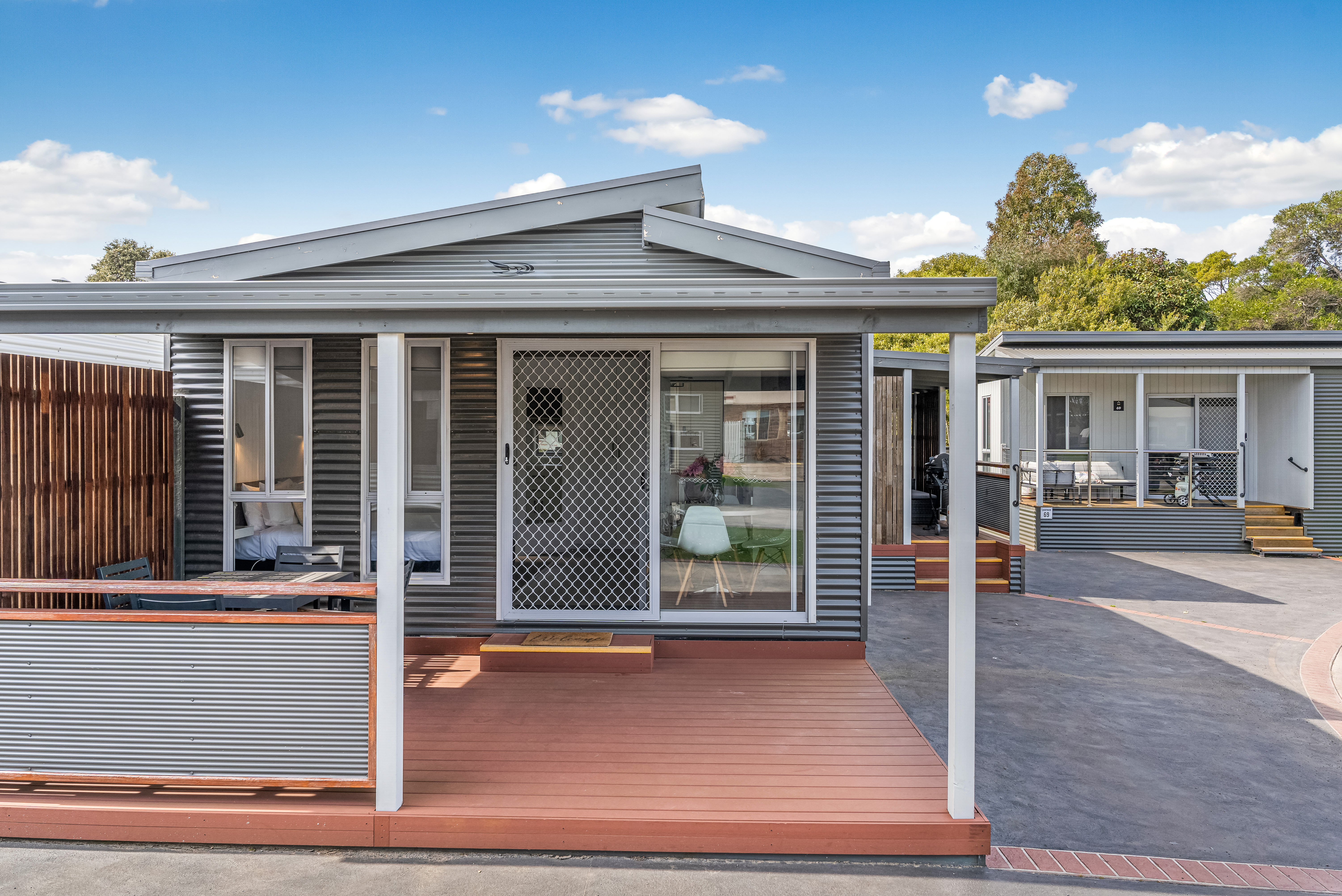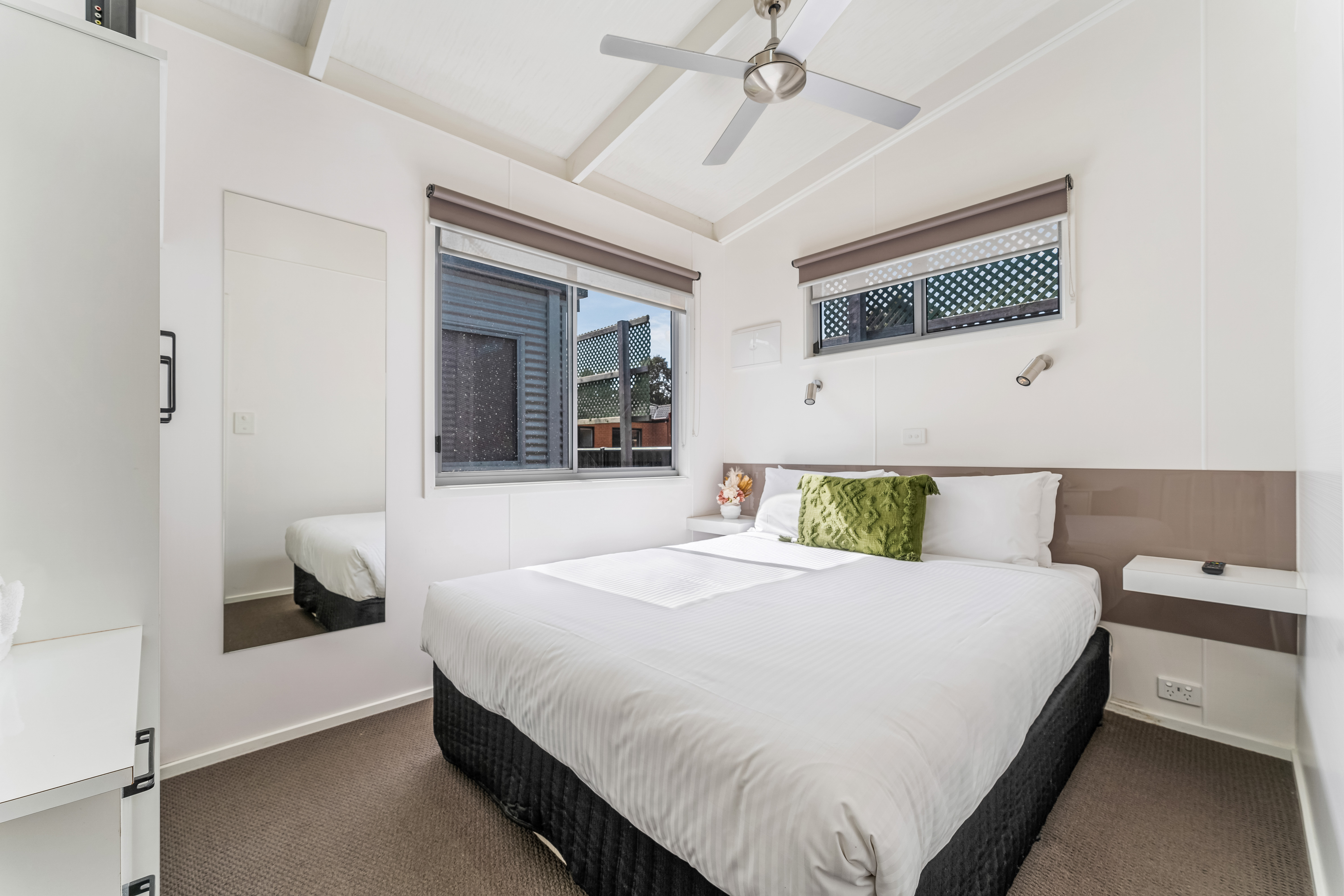 Our modern 3 bedroom cabins feature a full kitchen, including dishwasher, coffee machine, gas stove top, oven and full sized fridge. The lounge area features a couch, flat screen smart TV and dining table/chairs. There’s a modern bathroom with walk-in shower, and separate toilet. The King room features a king-sized bed, plus a separate kitchenette, ensuite, flat screen TV and dining table. The second room has a queen bed and the bunk room has 2 sets of bunk beds. Enjoy two outdoor spaces, with an outdoor lounge, table and BBQ and the other with an outdoor setting.