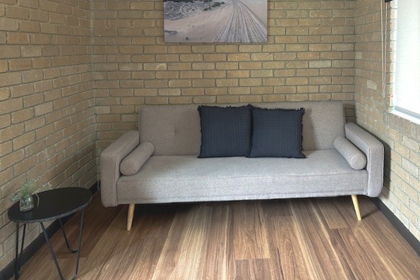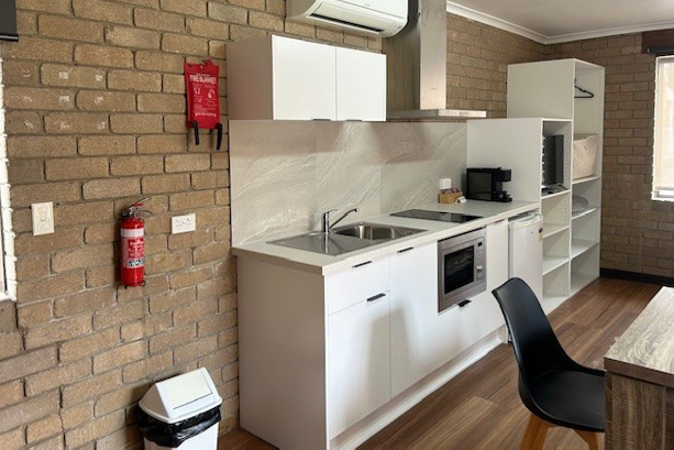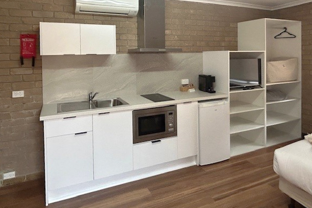 The kitchen/living area is fully equipped with dining area, sofa, electric hotplates, grill, small oven, microwave, kettle, toaster, crockery, cutlery, cooking utensils, saucepans, TV, reverse cycle AC/heater.