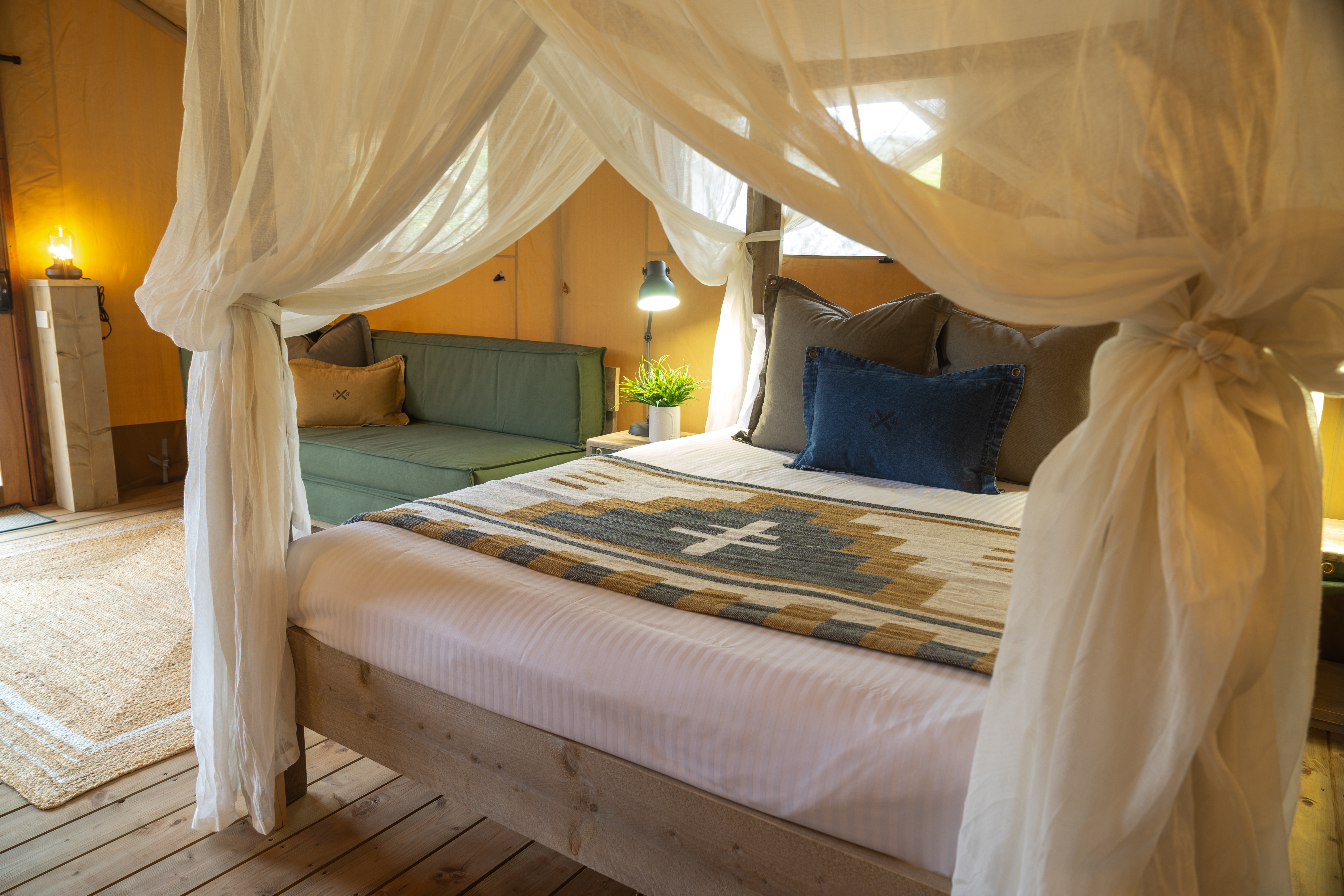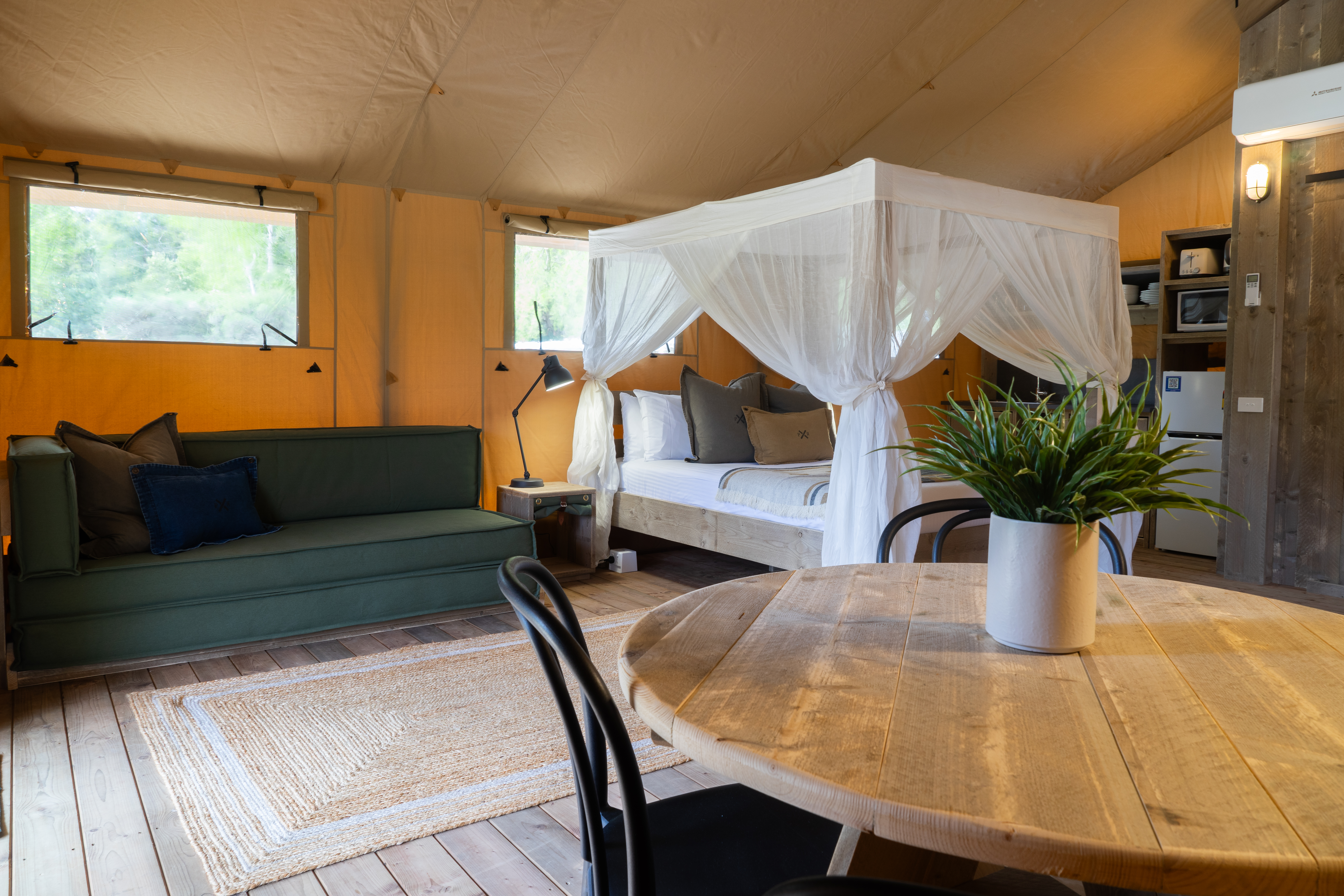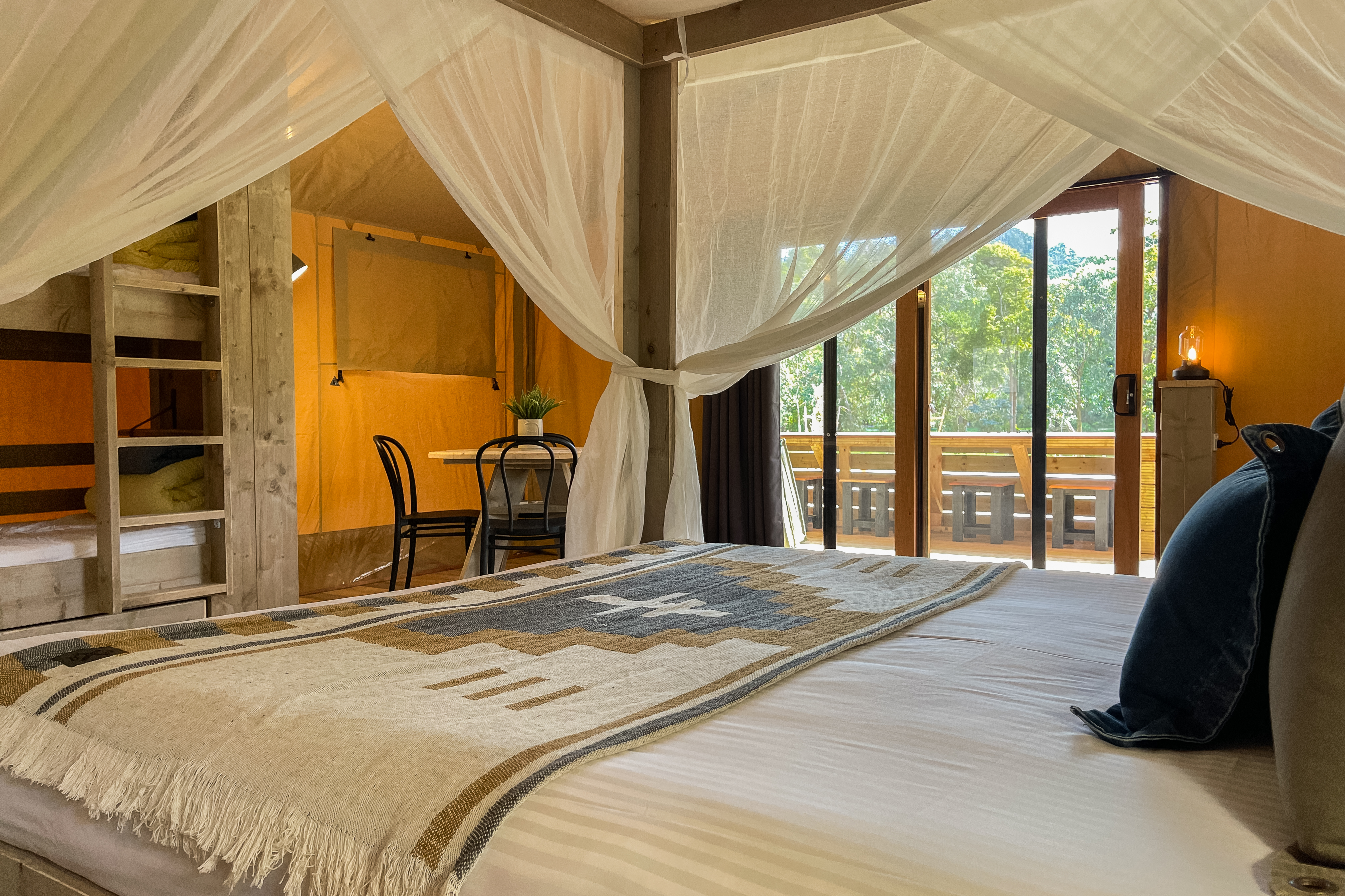 Each Luxury Safari Tent comfortably sleeps 4 with a Queen bed & 1 x Bunk beds, there is an option of adding 2 additional guests using the sofa bed.