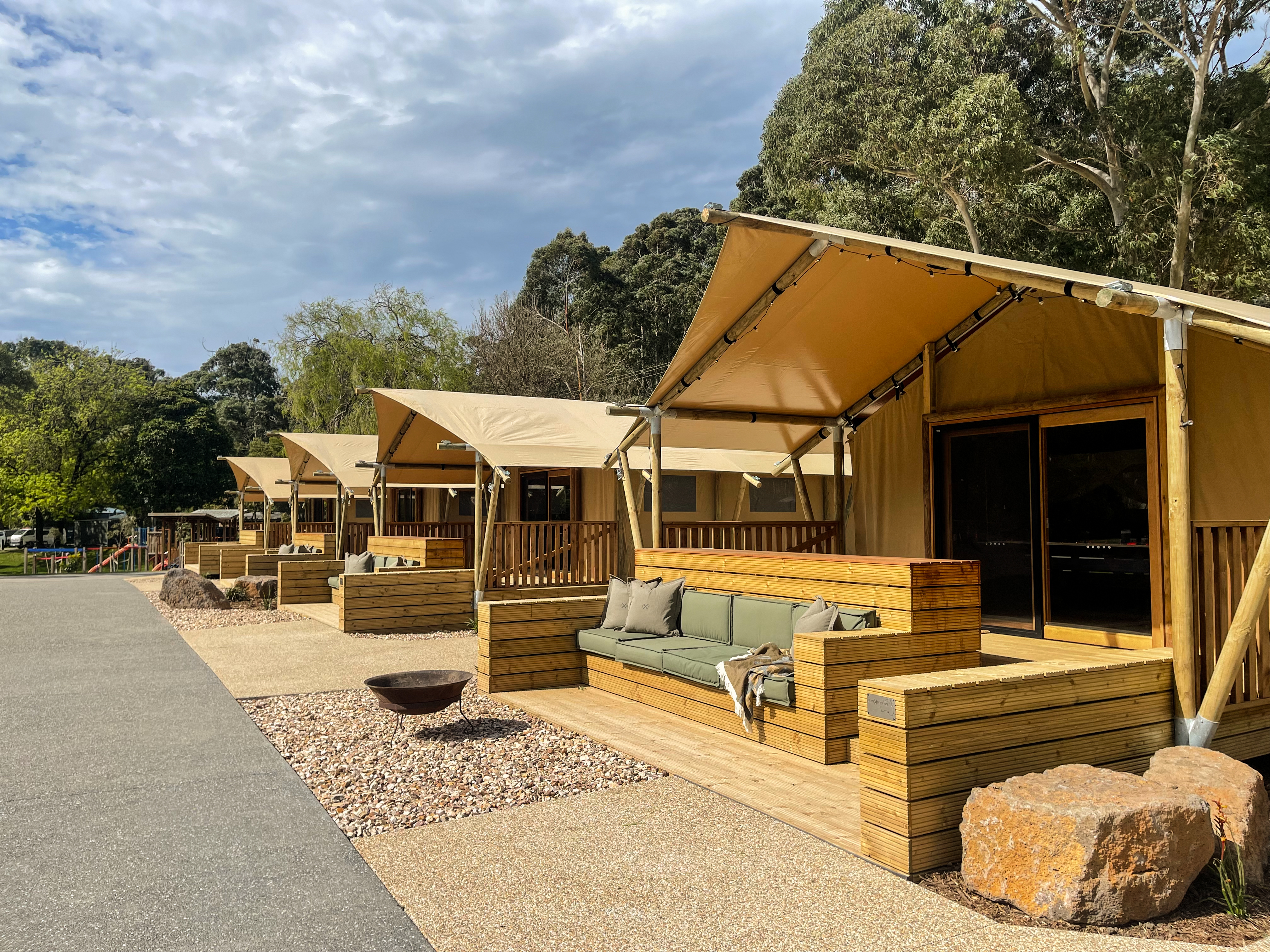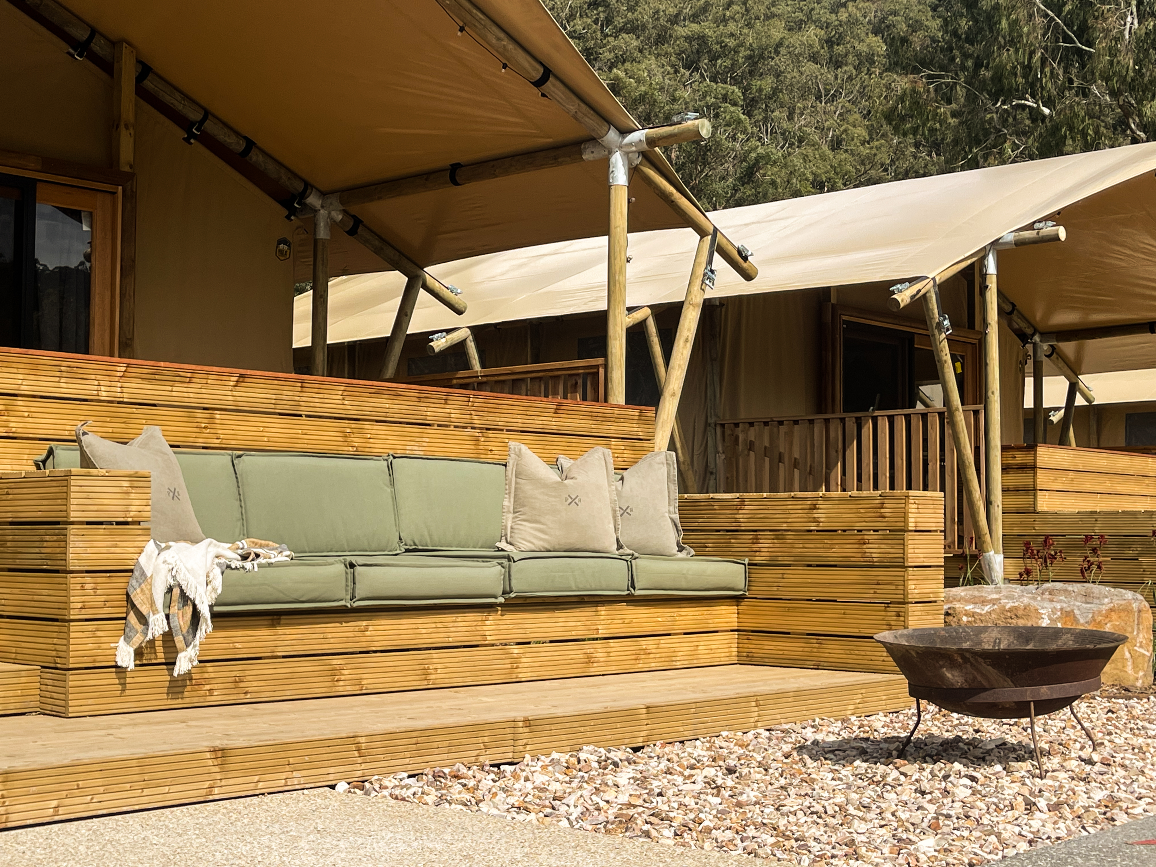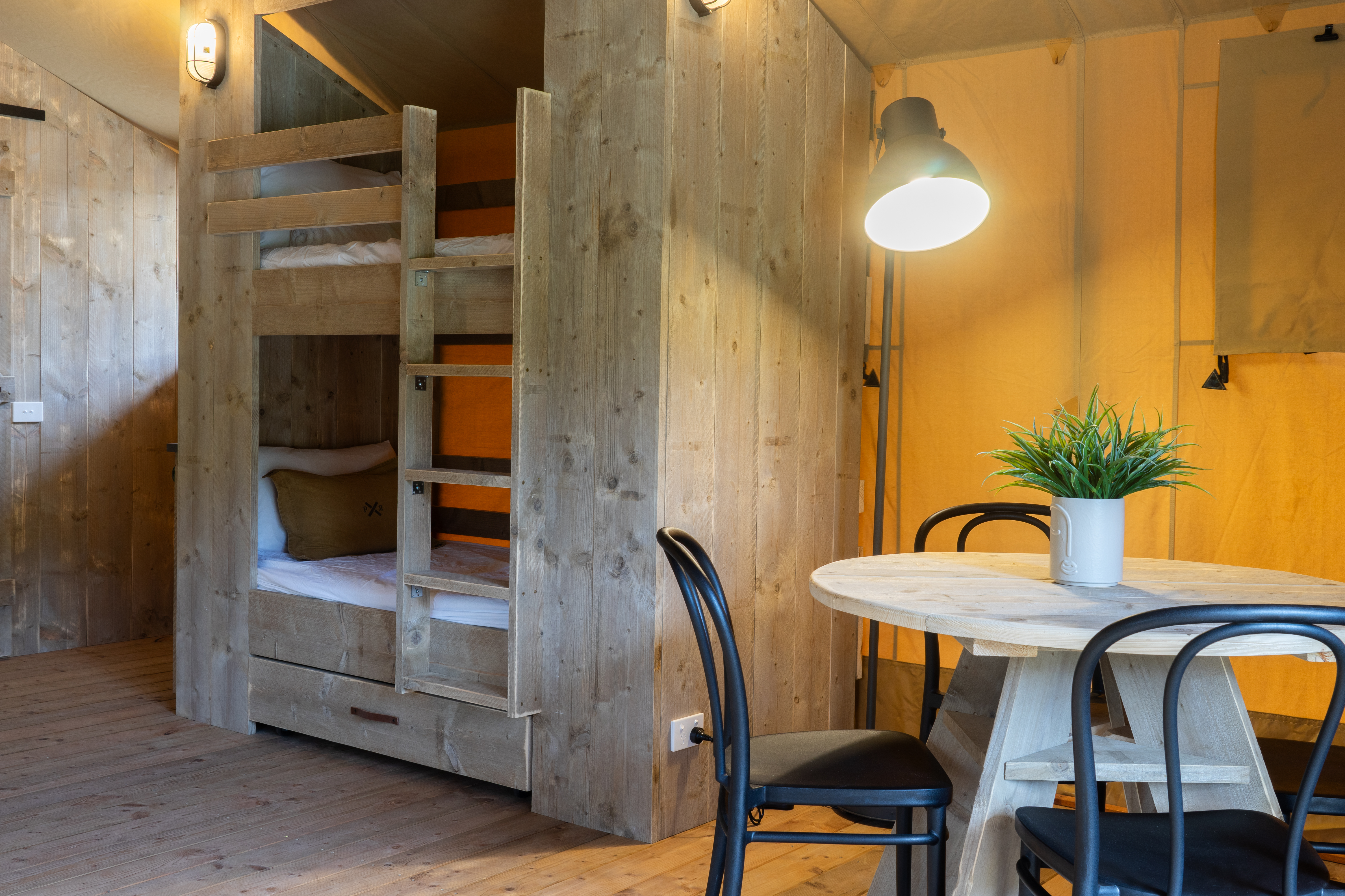 Each Luxury Safari Tent comfortably sleeps 4 with a Queen bed & 1 x Bunk beds, there is an option of adding 2 additional guests using the sofa bed.