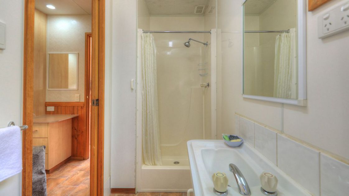 The villa has a comfortable queen bed, ready made with a doona or blanket and linen. There’s an electric blanket on the bed to keep you snug and warm during the cold winter nights and spare blankets in the cupboard if required. The cabin has a bathroom suite with a shower, mirror and a hair dryer with complimentary toiletries for your use. The cabin boasts an outdoor setting on the verandah and there’s parking beside or near the villa for your car and a trailer or boat.