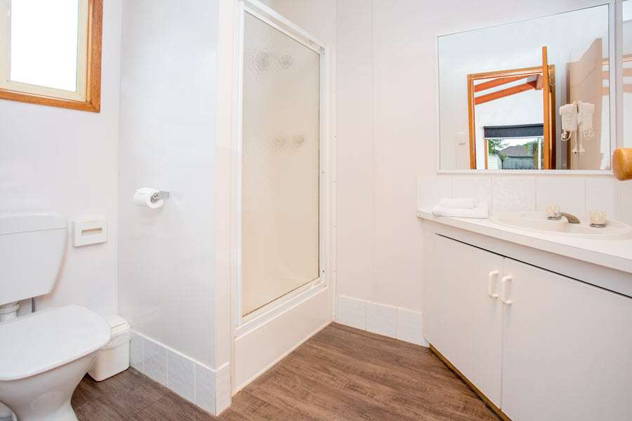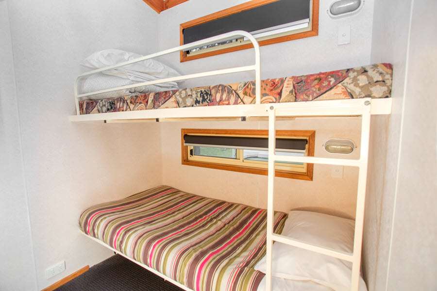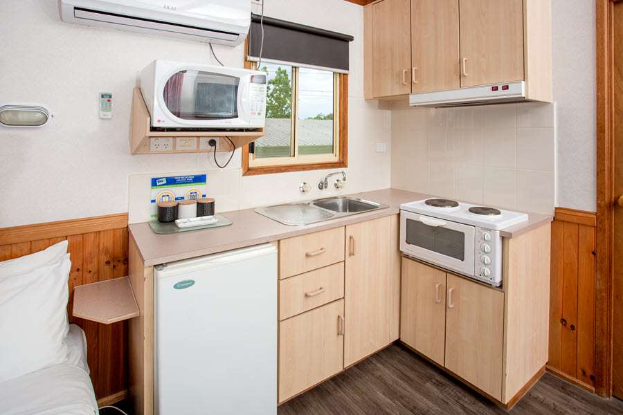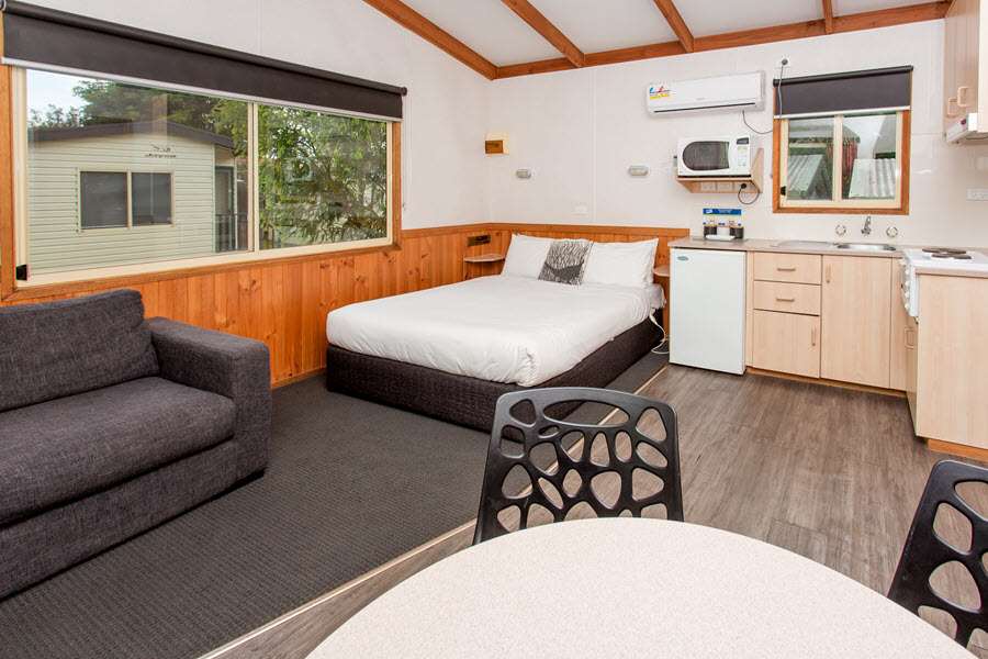 The one-bedroom cabins are a perfect retreat for a small family or a couple. It has an open plan living area with a queen bed, kitchenette, air-conditioning, heating, sofa, television, and free in-house movies. There is a separate bunkroom that has one set of bunks. The bathroom provides a shower, vanity and toilet. All bedding is provided including towels. The four berth one-bedroom cabins are the perfect retreat for a small family or a couple.