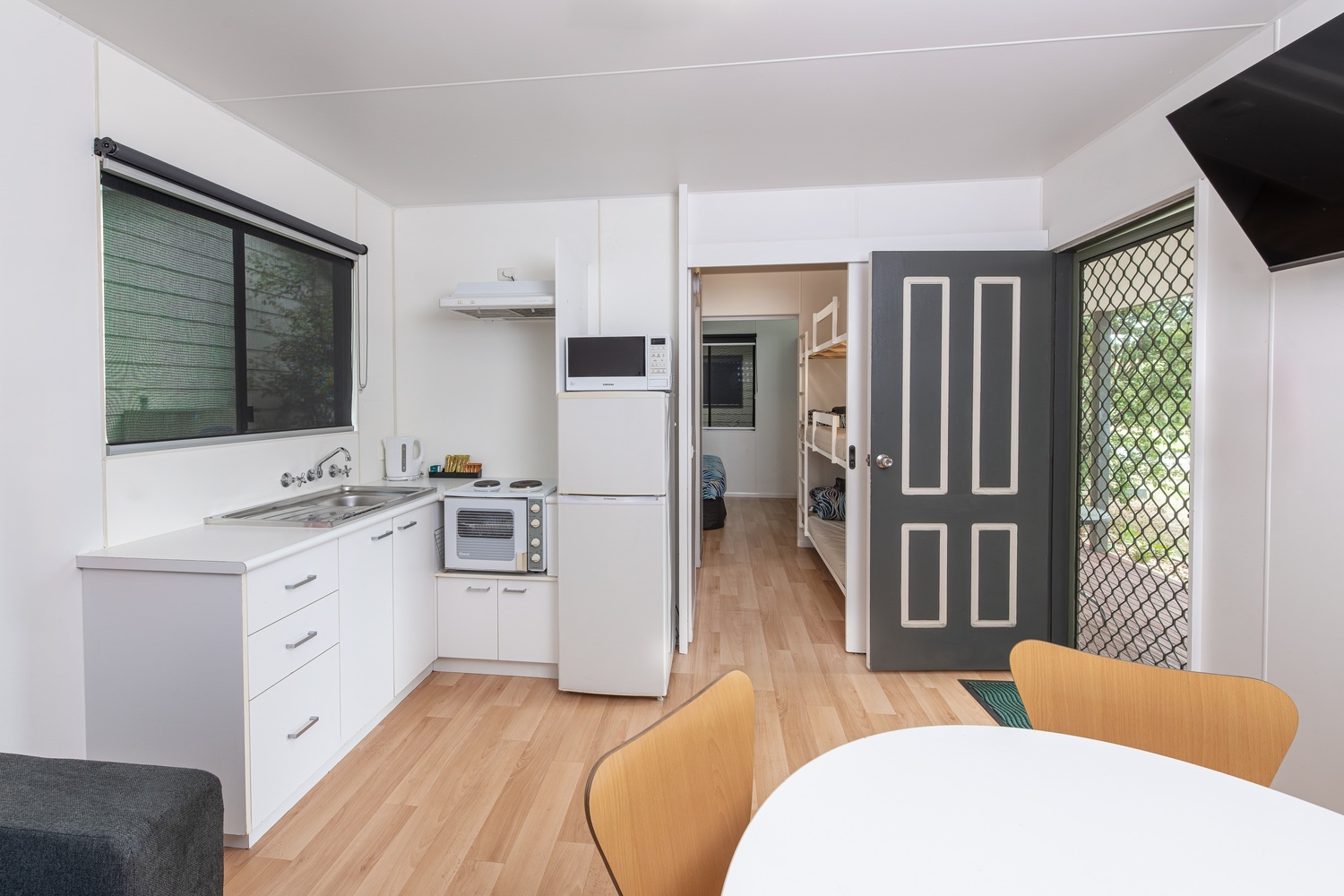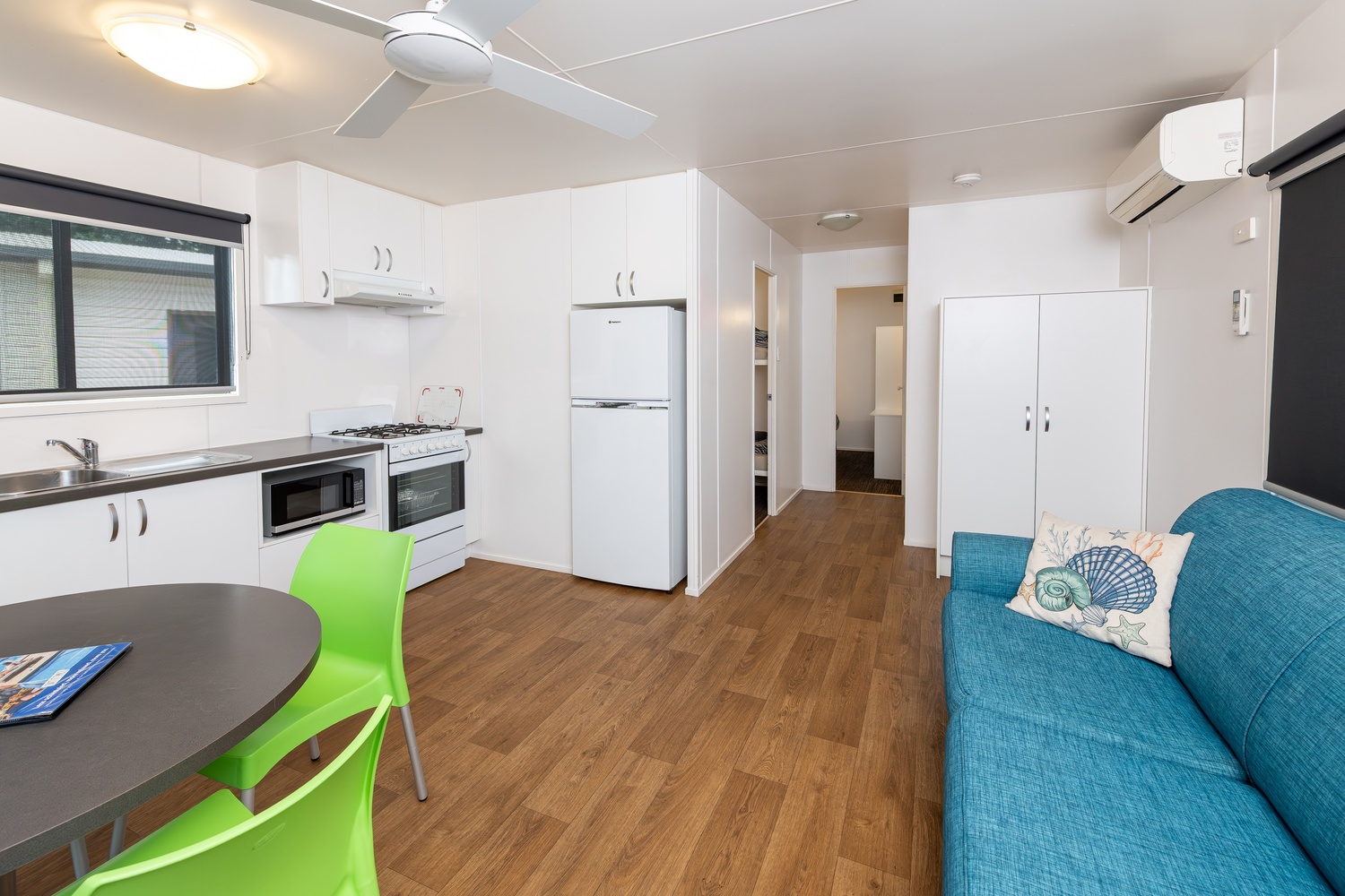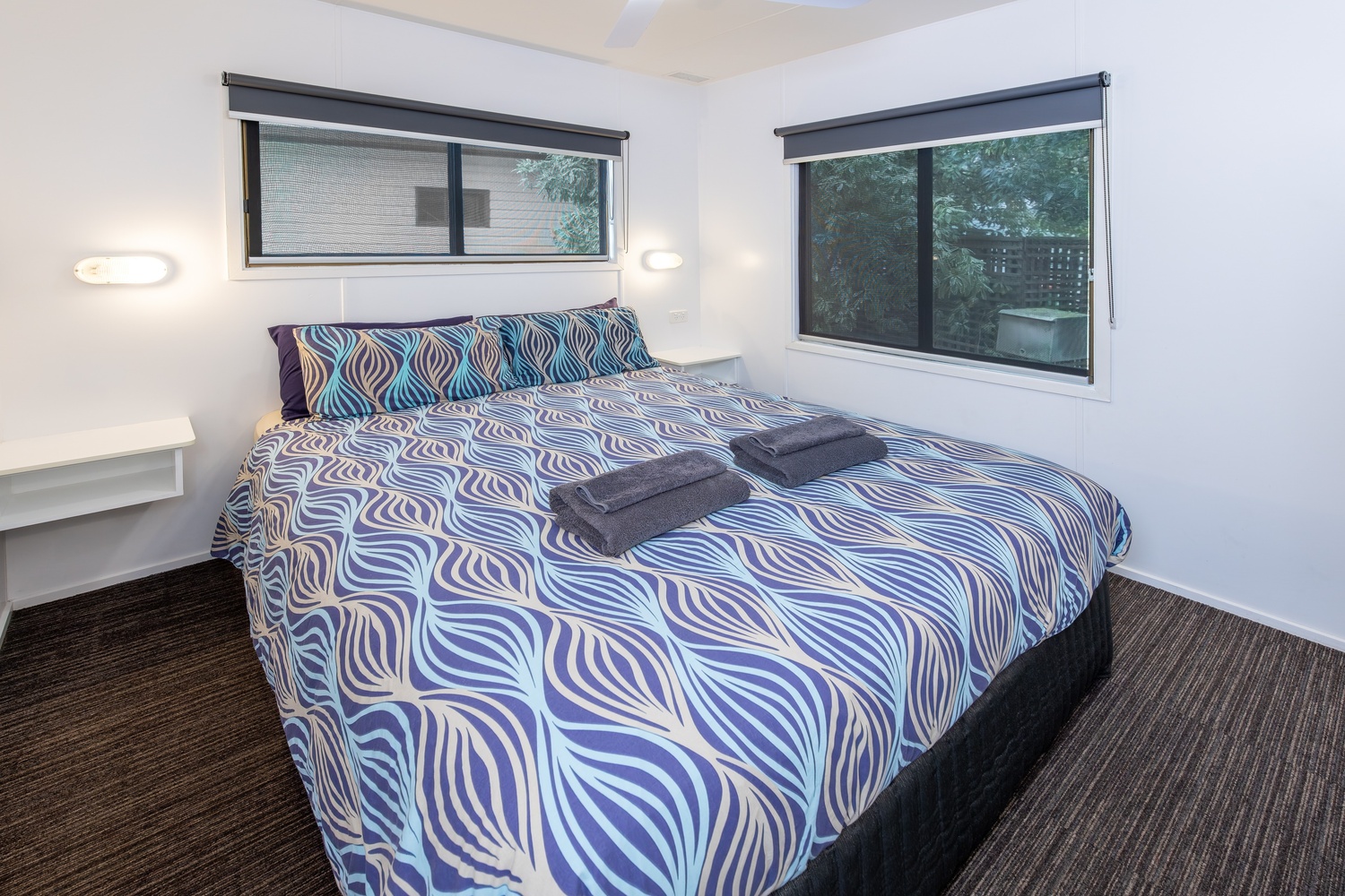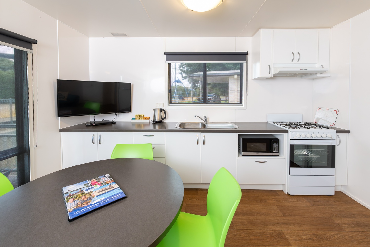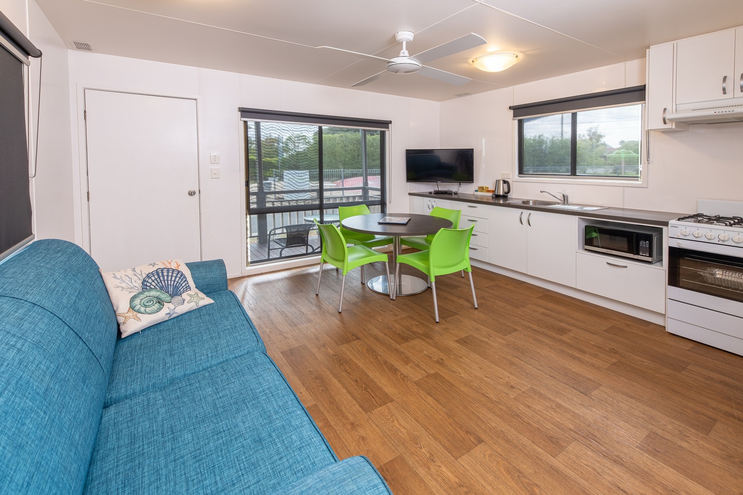 Our spacious two bedroom holiday units are a great option for families. They provide all those home away from home comforts including a fully self contained kitchen, lounge area with TV and DVD player and a large deck - perfect for chilling out on after a busy day exploring. The main bedroom has a queen size bed and the second room has a double bunk with room for a port-a-cot if needed. All bedding is provided including towels and electric blankets – perfect for a cosy sleep on those cool winter nights!