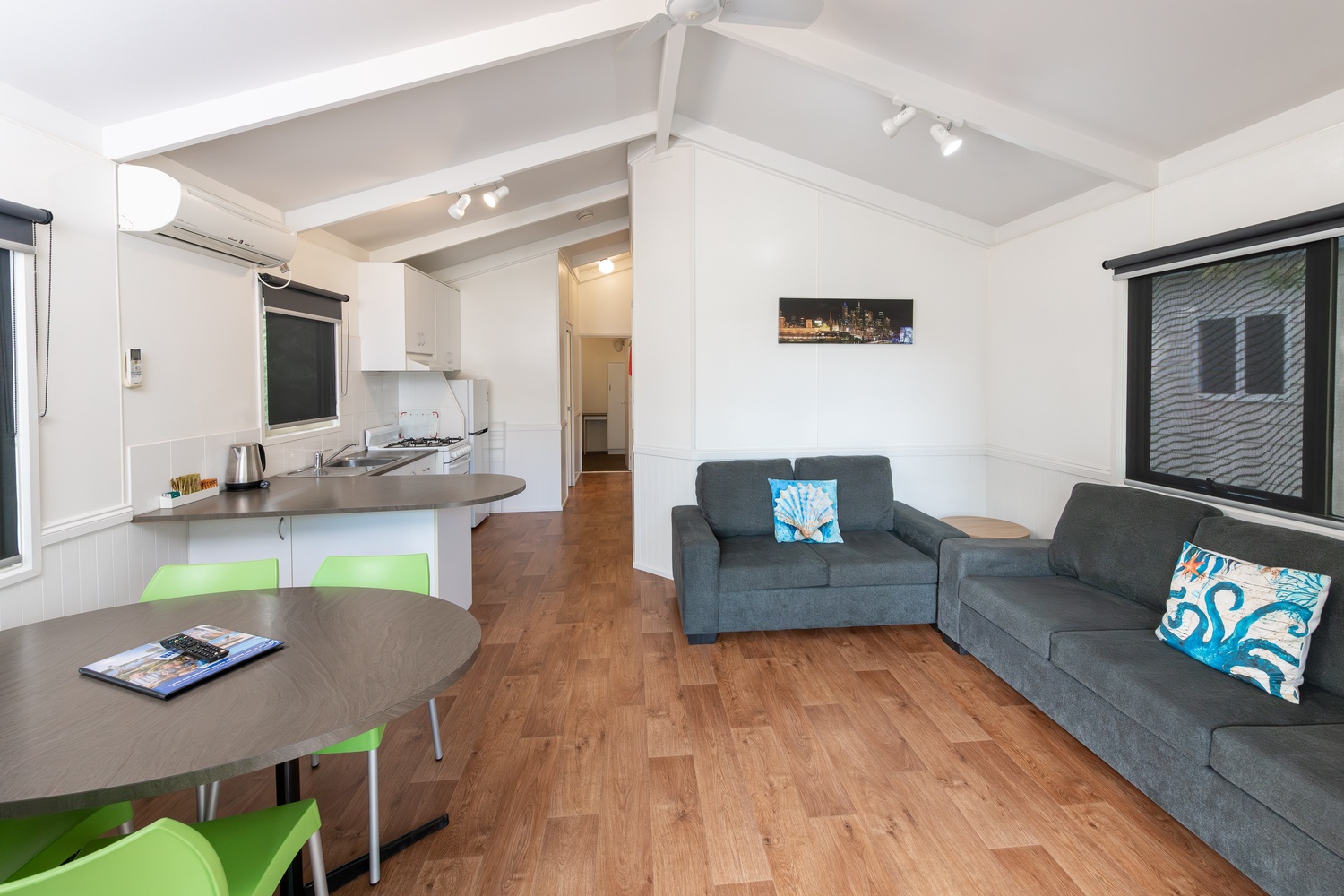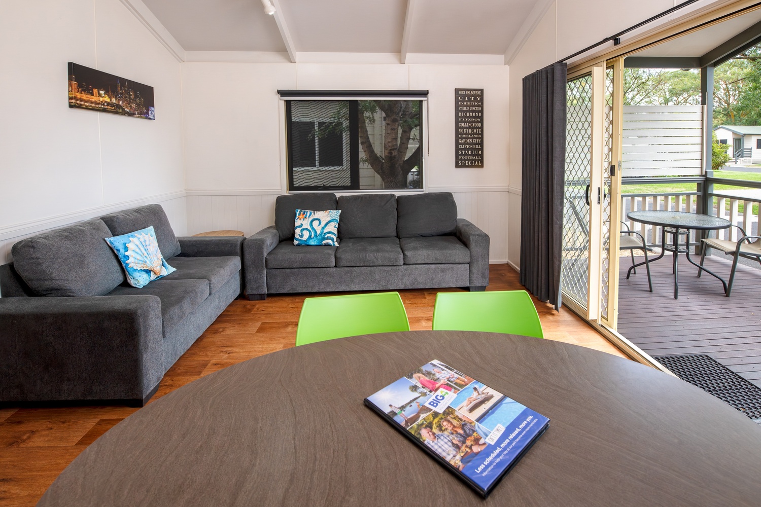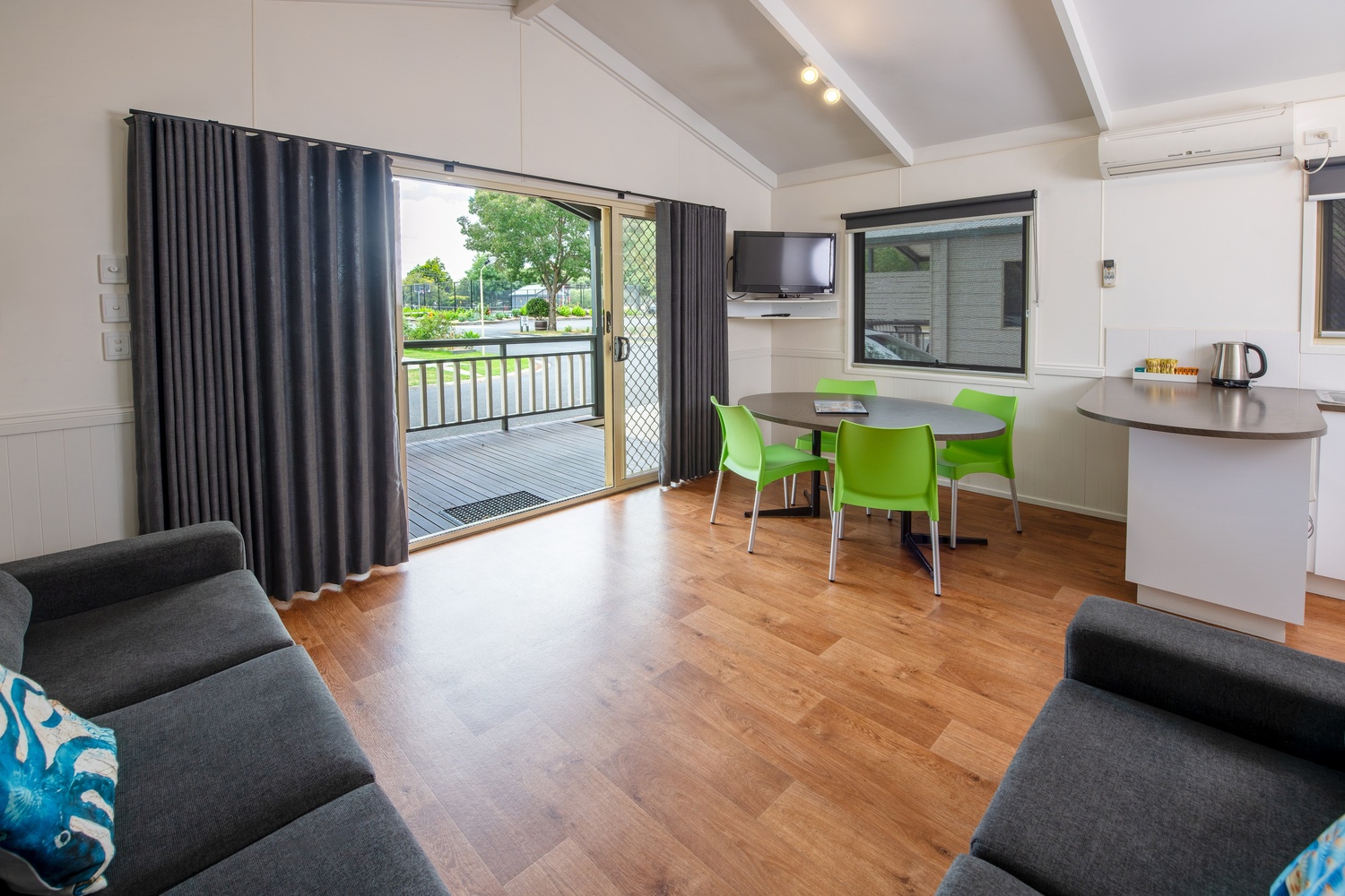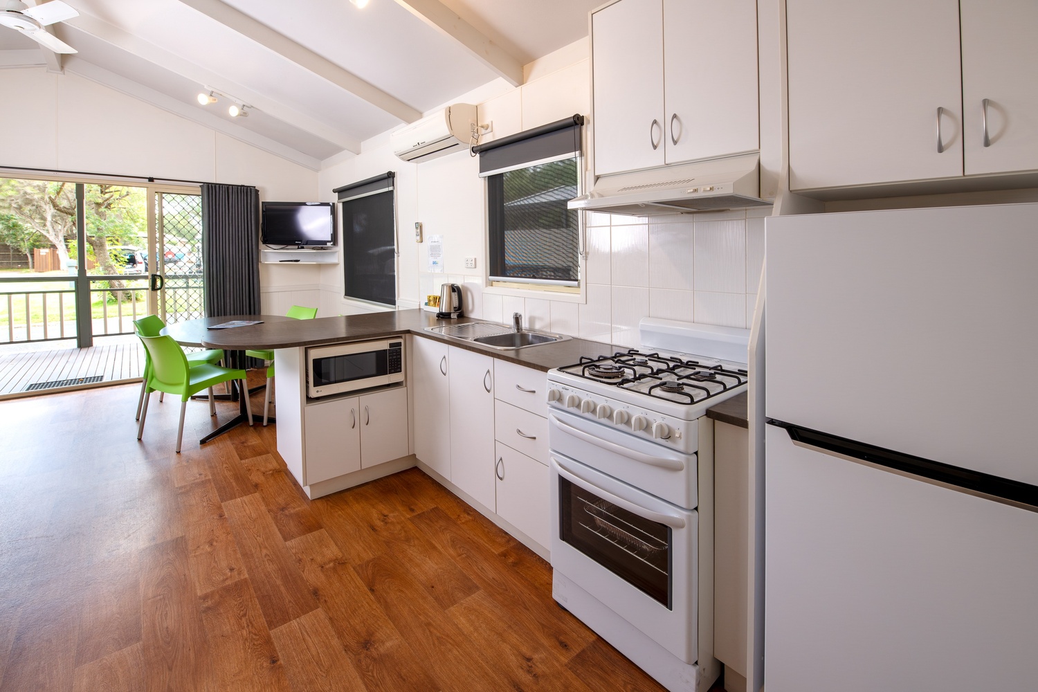 Ideal for families our newest cabins offer comfort, space and that home away from home feeling. They have a fully self contained kitchen, dining area as well as a living area with a large modular lounge. The main bedroom has a queen size bed, the second room has a double bed and the third room has a set of bunk beds which can be altered to fit a port-a cot if needed. It has a bathroom with separate toilet and a large deck with outdoor setting - perfect for relaxing on those long summer nights.