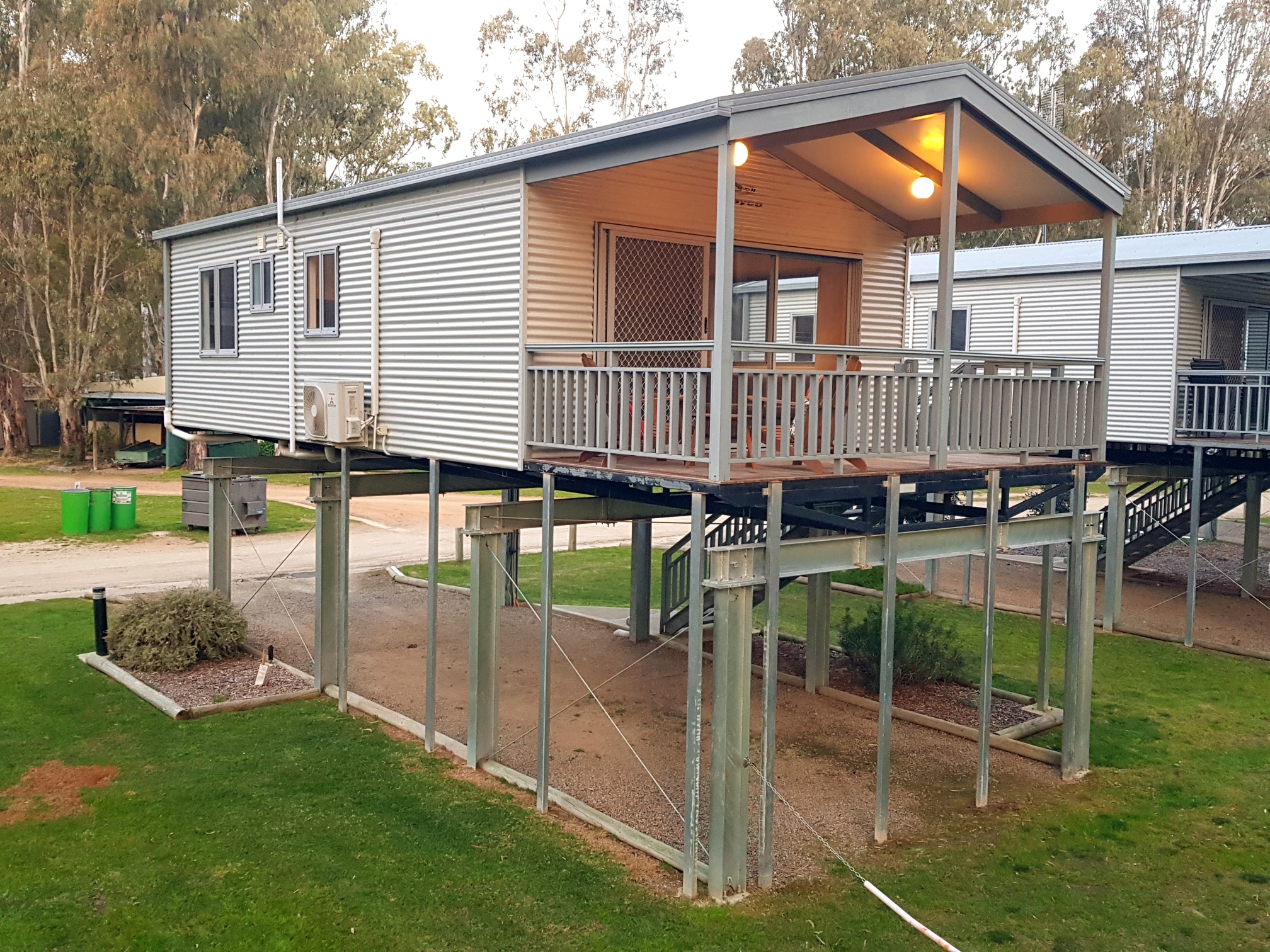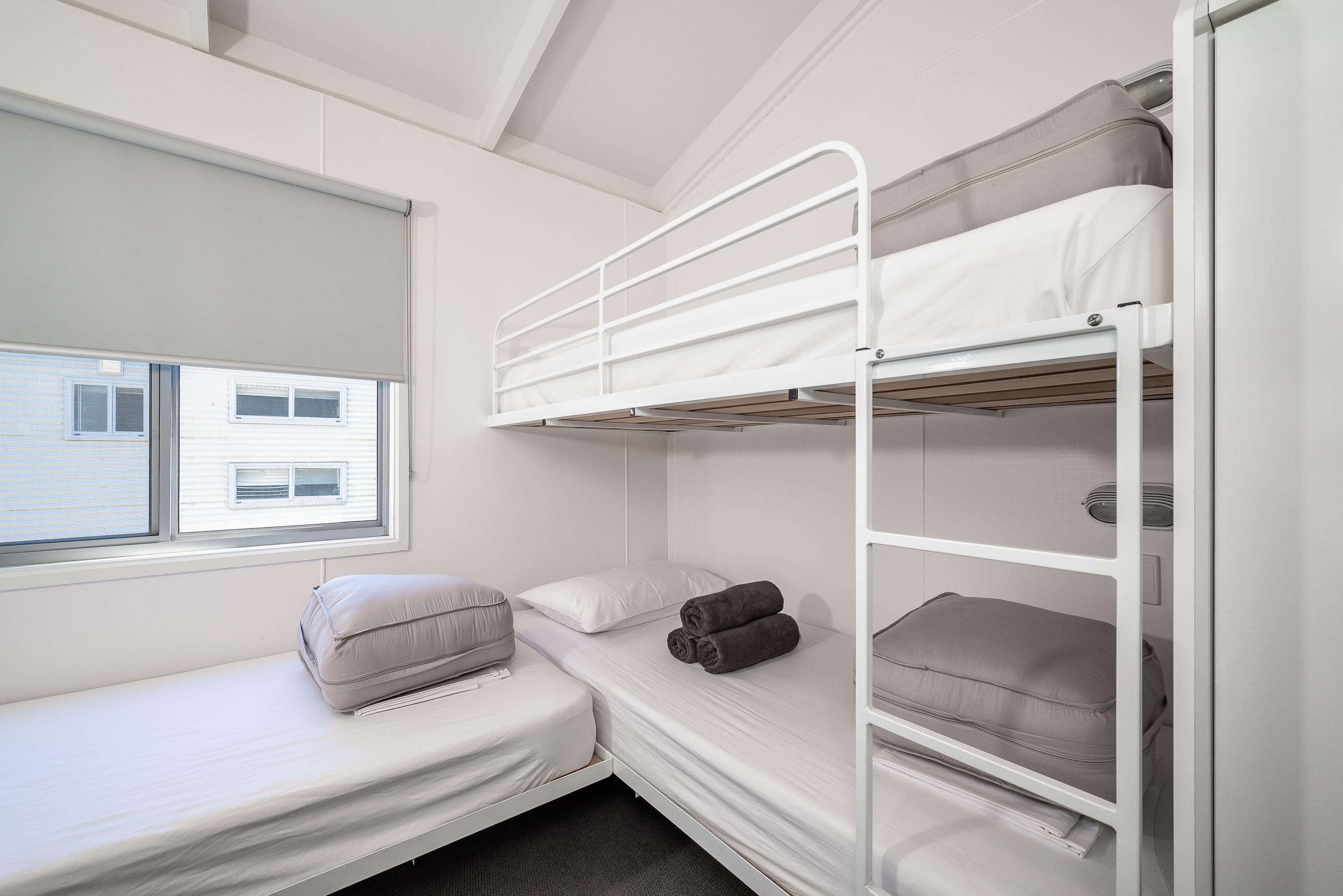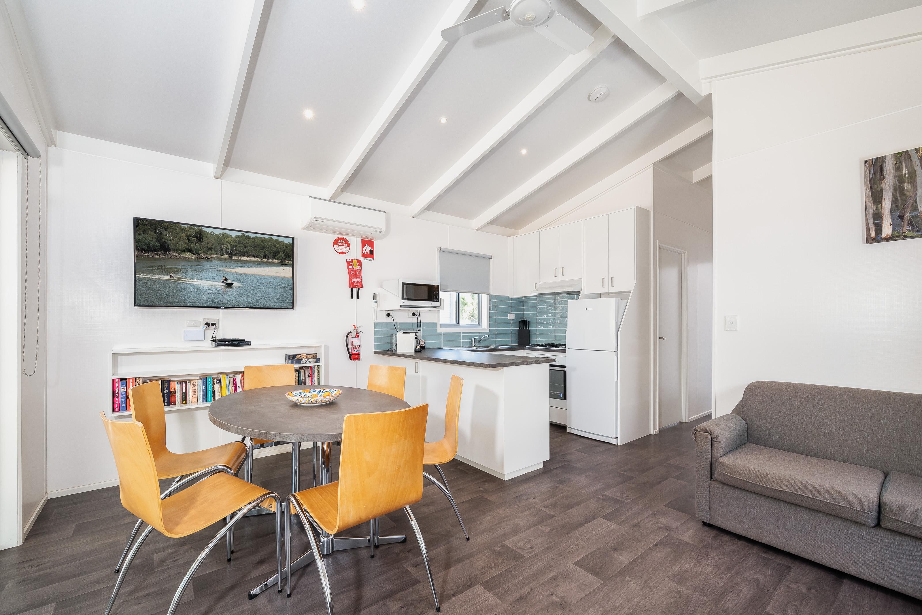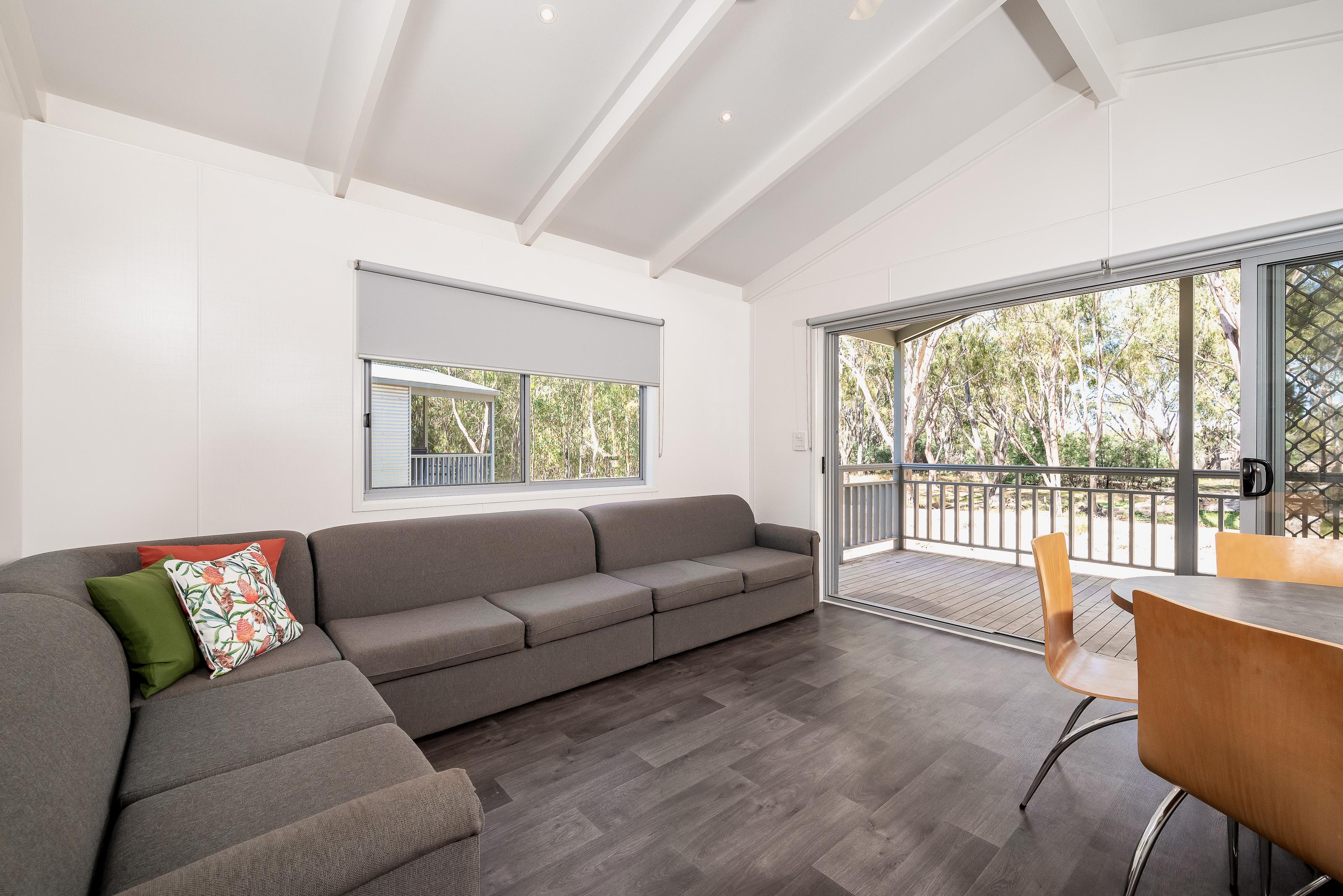 Our 2 Bedroom Riverview Villas sleep up to five guests with a queen bed in the main bedroom and a set of bunks plus single bed in the second bedroom, as well as a bathroom with separate toilet, living area, kitchen, and private deck.