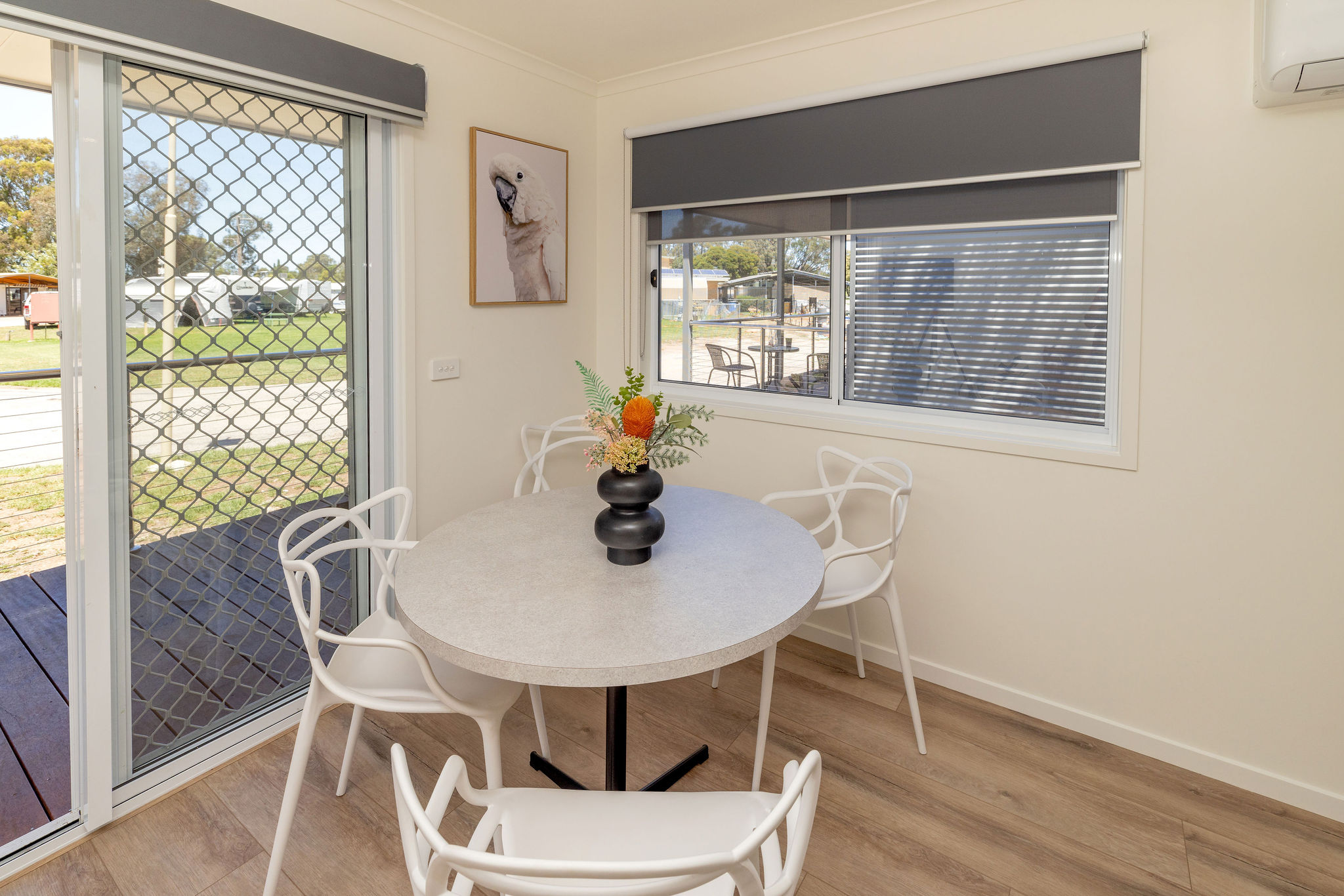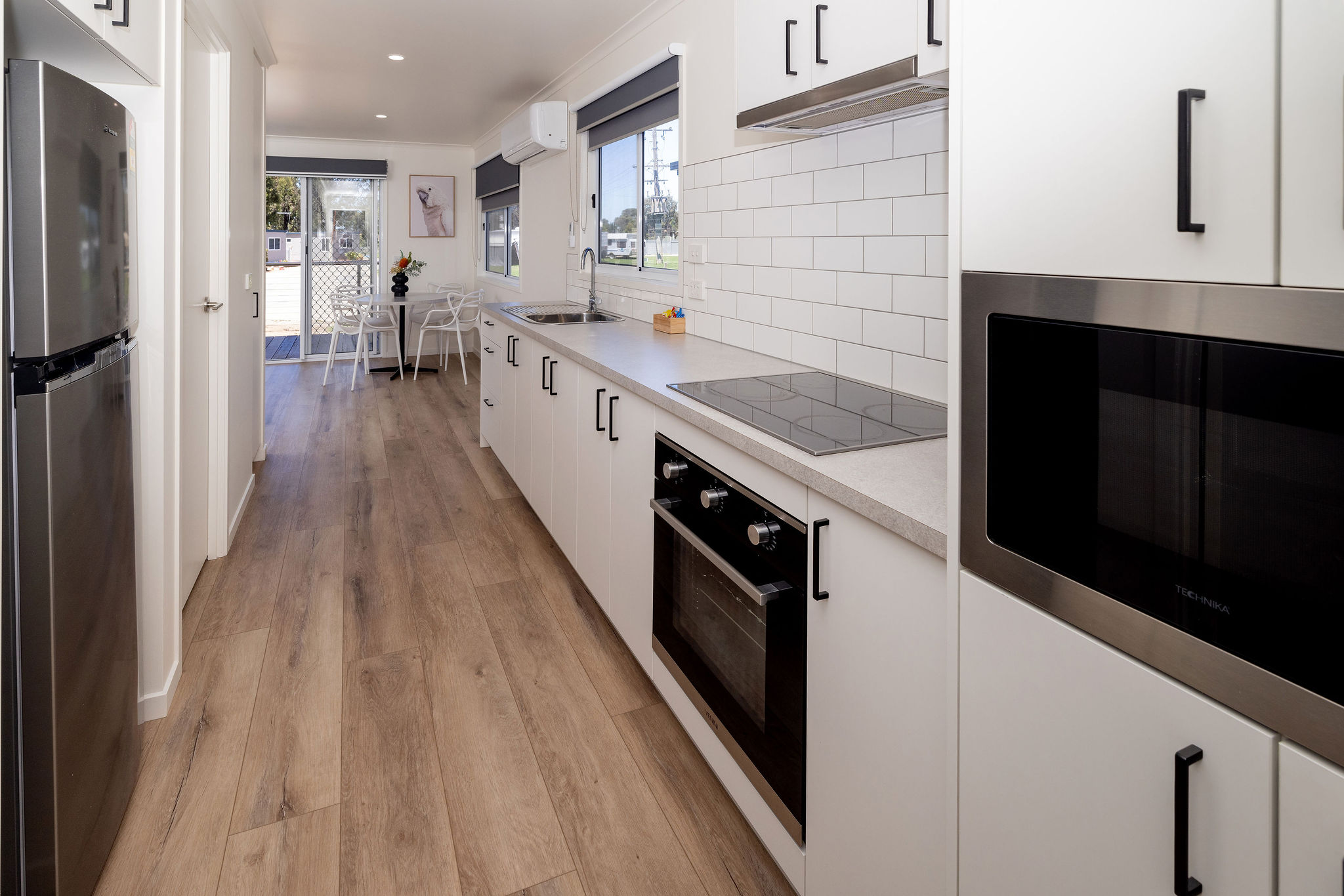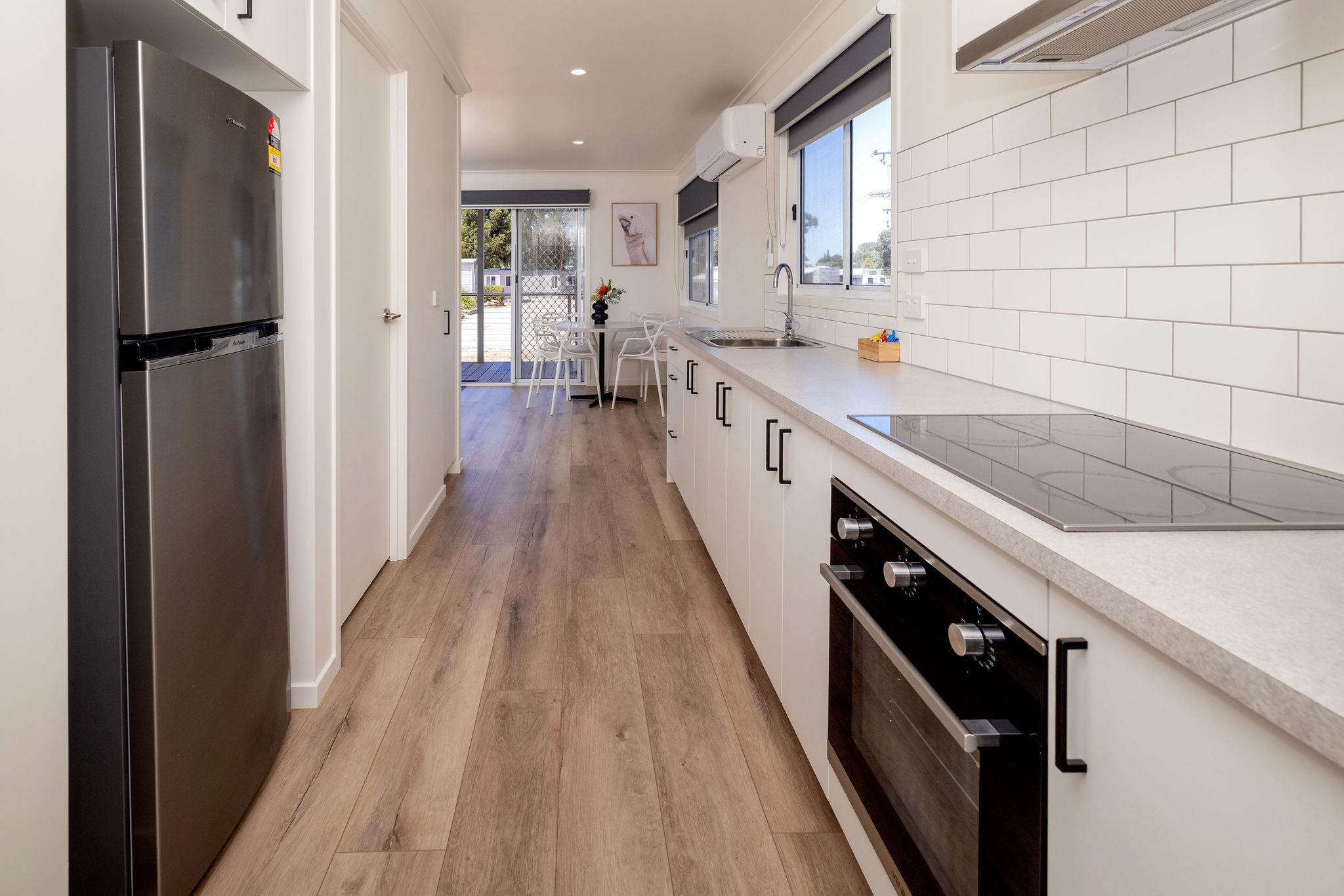 These cosy cabins feature 2 bedrooms, a bathroom, full kitchen, with living and dining areas.