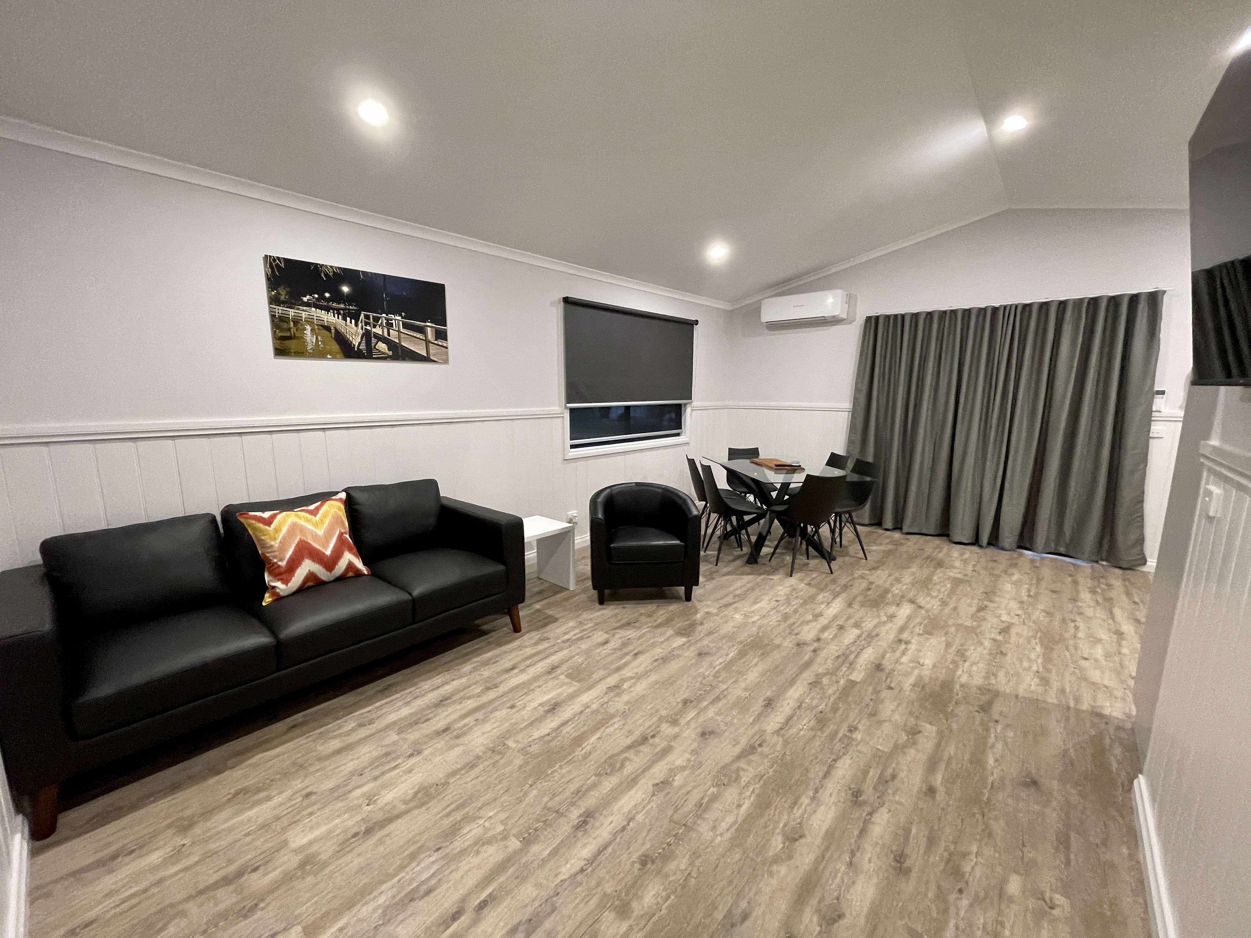 Our Premier Cabins are our largest 2 bedroom cabins. They are fully self contained & newly built to a high standard. They feature two bedrooms and a spacious living area with 50-inch flat screen TV. The main bedroom has a queen sized bed with flat screen TV & ceiling fan. The second room has 2 sets of bunk beds & linen is supplied. The cabin has reverse cycle to keep you comfortable and a deck with outdoor table & chairs. Car parking is alongside.