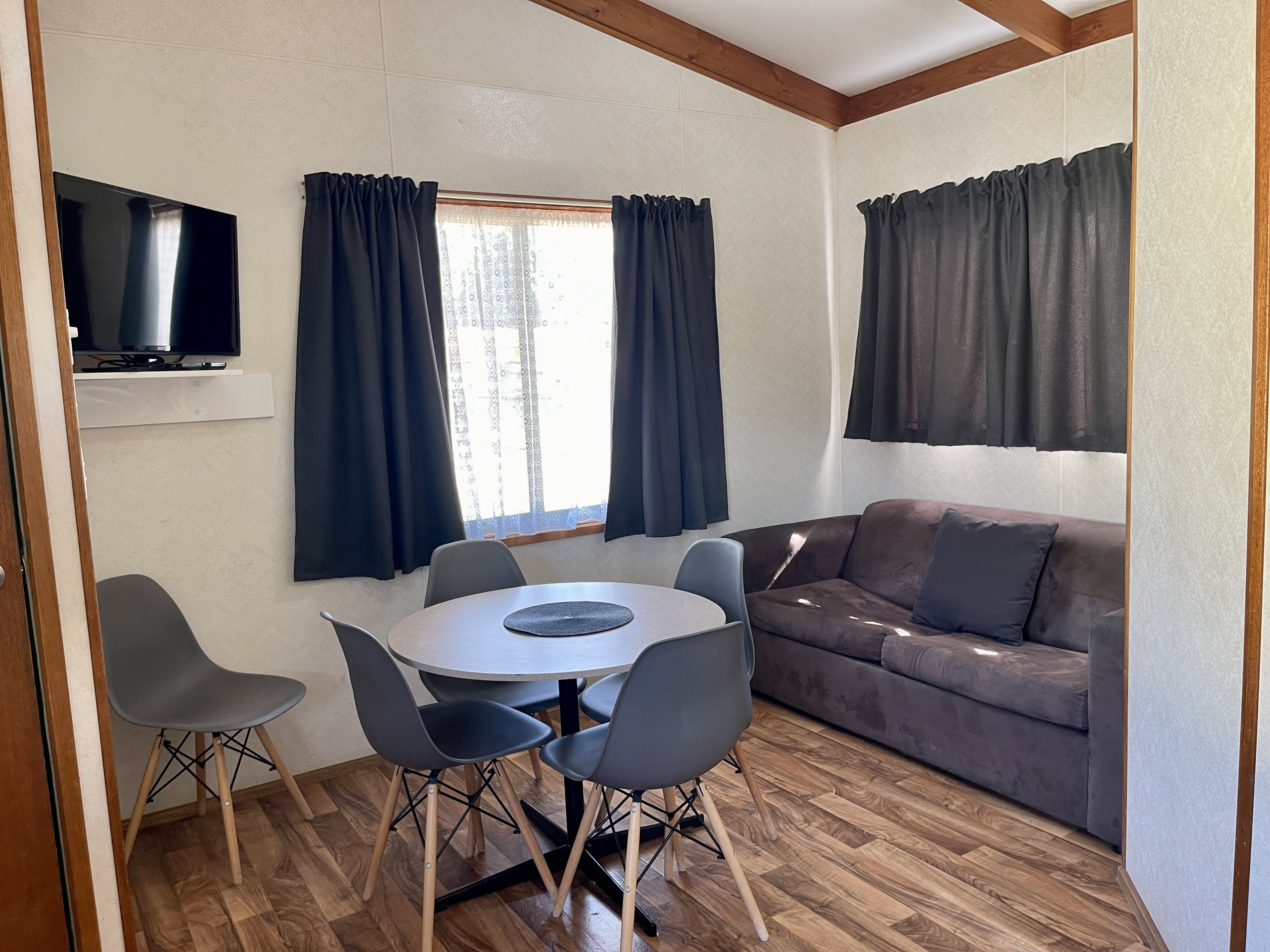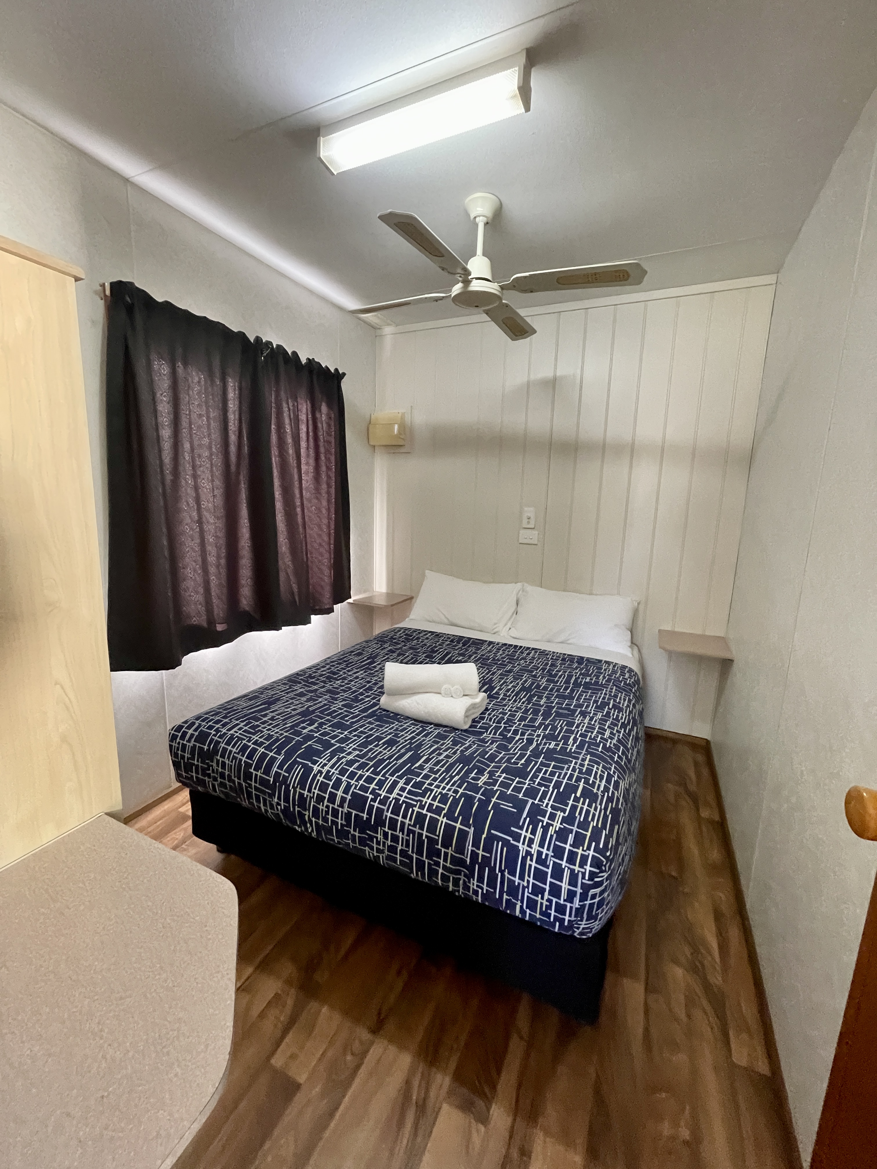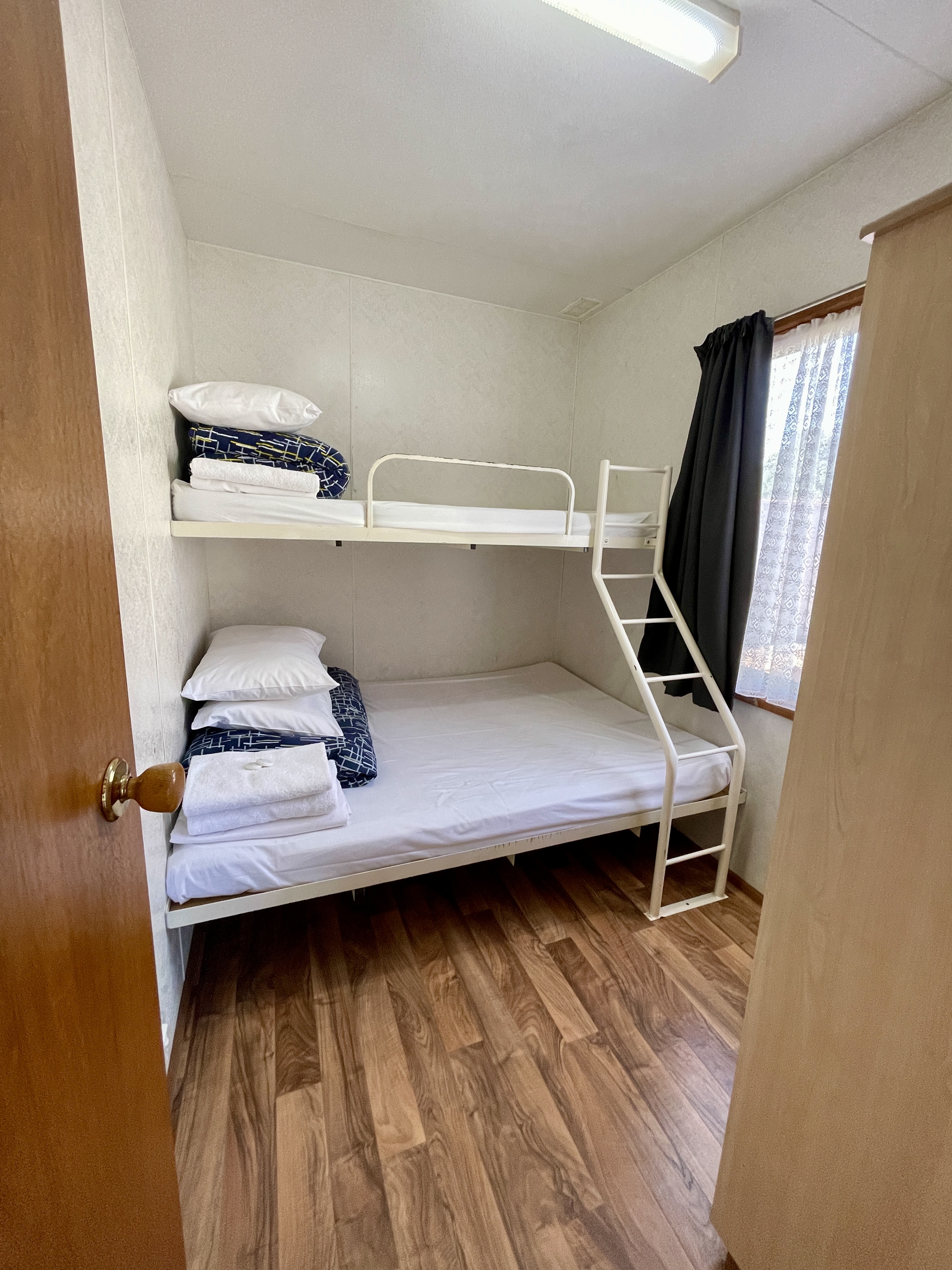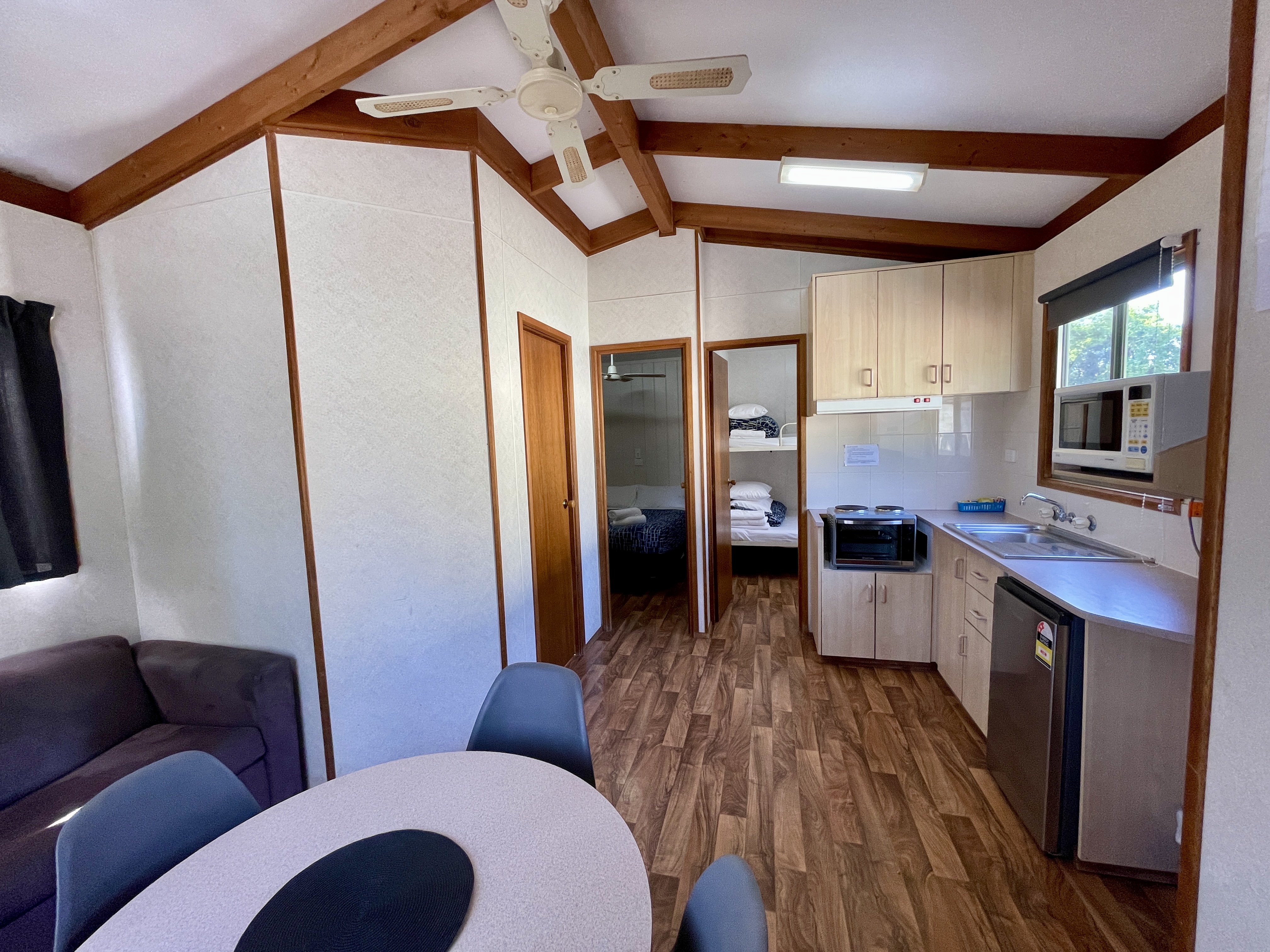 Our Standard Cabins are a comfortable budget friendly option. This Cabin features 2 bedrooms, one with double and the other with a tri-bunk. All linen is provided. Ceiling fans in the main bedroom & living areas. Fully equipped kitchenette, & reverse cycle for your comfort.