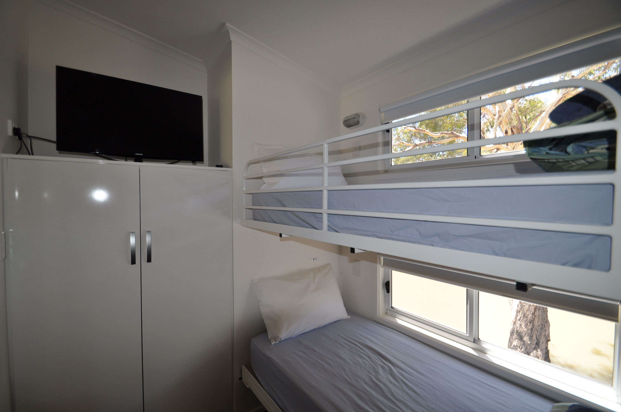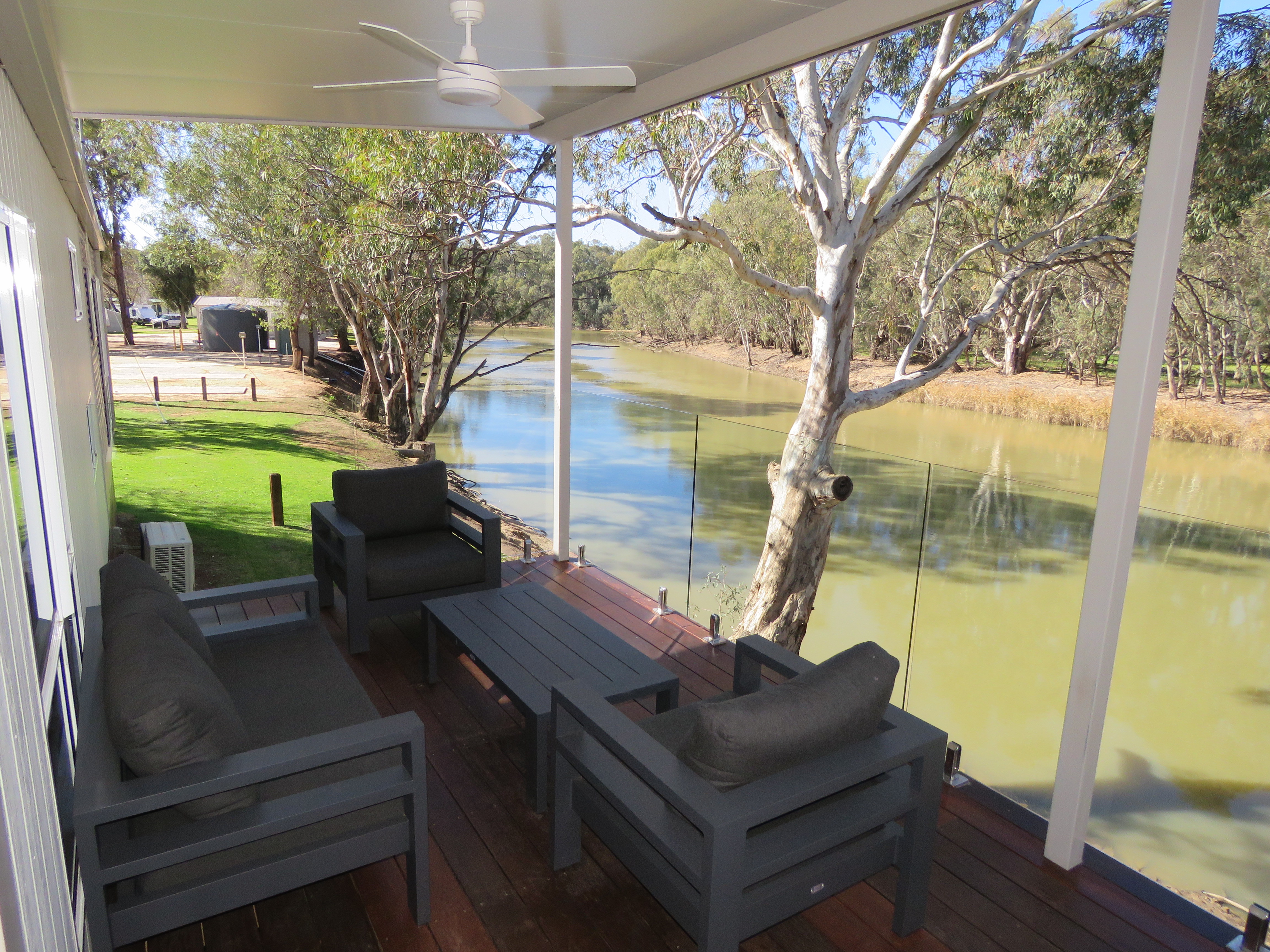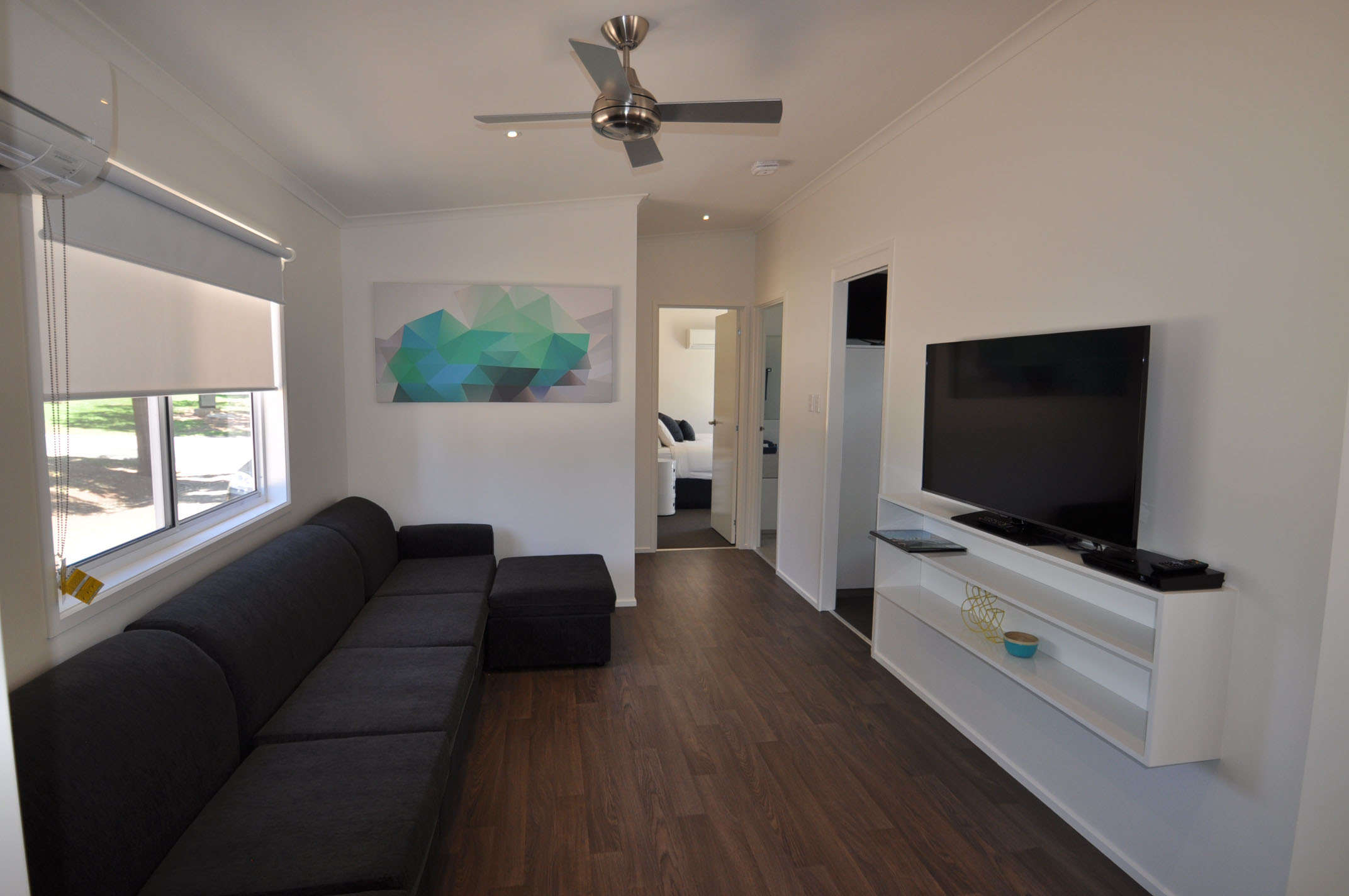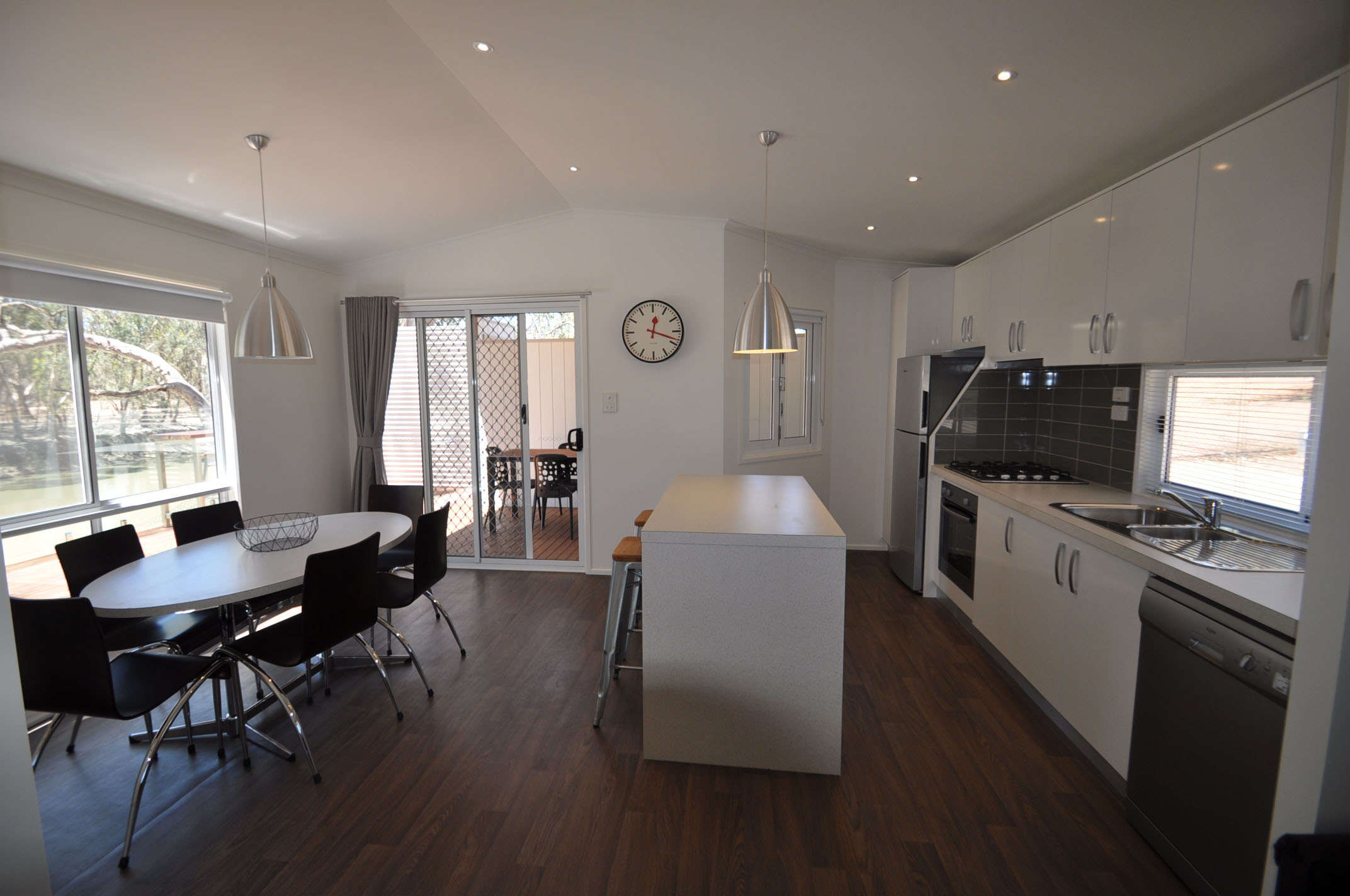 The Luxury River Edge Cabin has all the features of a 5 star accommodation. Sitting right on the riverbank you get the most magnificent view from your king size bed in the master bedroom, which also has a walk-through robe and an ensuite with a double shower. 2 sets of bunks are in the second bedroom which also has river views. The open plan kitchen, dining and lounge area is perfect for entertaining the family or perhaps a relaxing weekend away for 2! With your own BBQ, you may never actually have (or want) to leave the cabin!