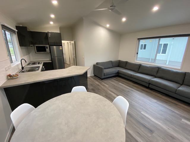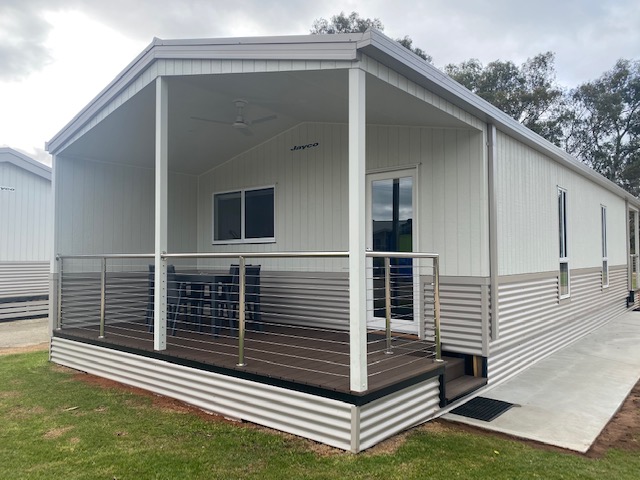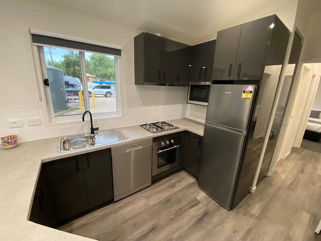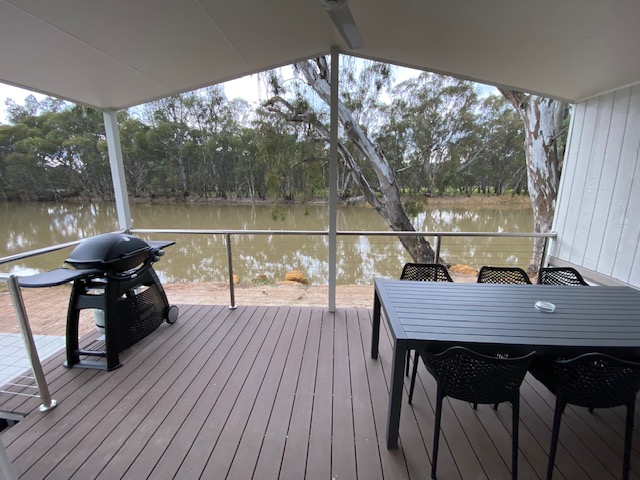 This cabin has all the luxuries to make your holiday relaxing with the added bonus of its River's Edge location. The main bedroom has a queen bed and an ensuite, the second bedroom has a queen bed and the third bedroom has 2 sets of bunks. All bedding is supplied. The modern kitchen consists of a stove, microwave, dishwasher and a full sized refrigerator. The spacious lounge area has an LCD television and both queen bedrooms have a television. The cabin has split system air conditioning and a large deck with outdoor setting.