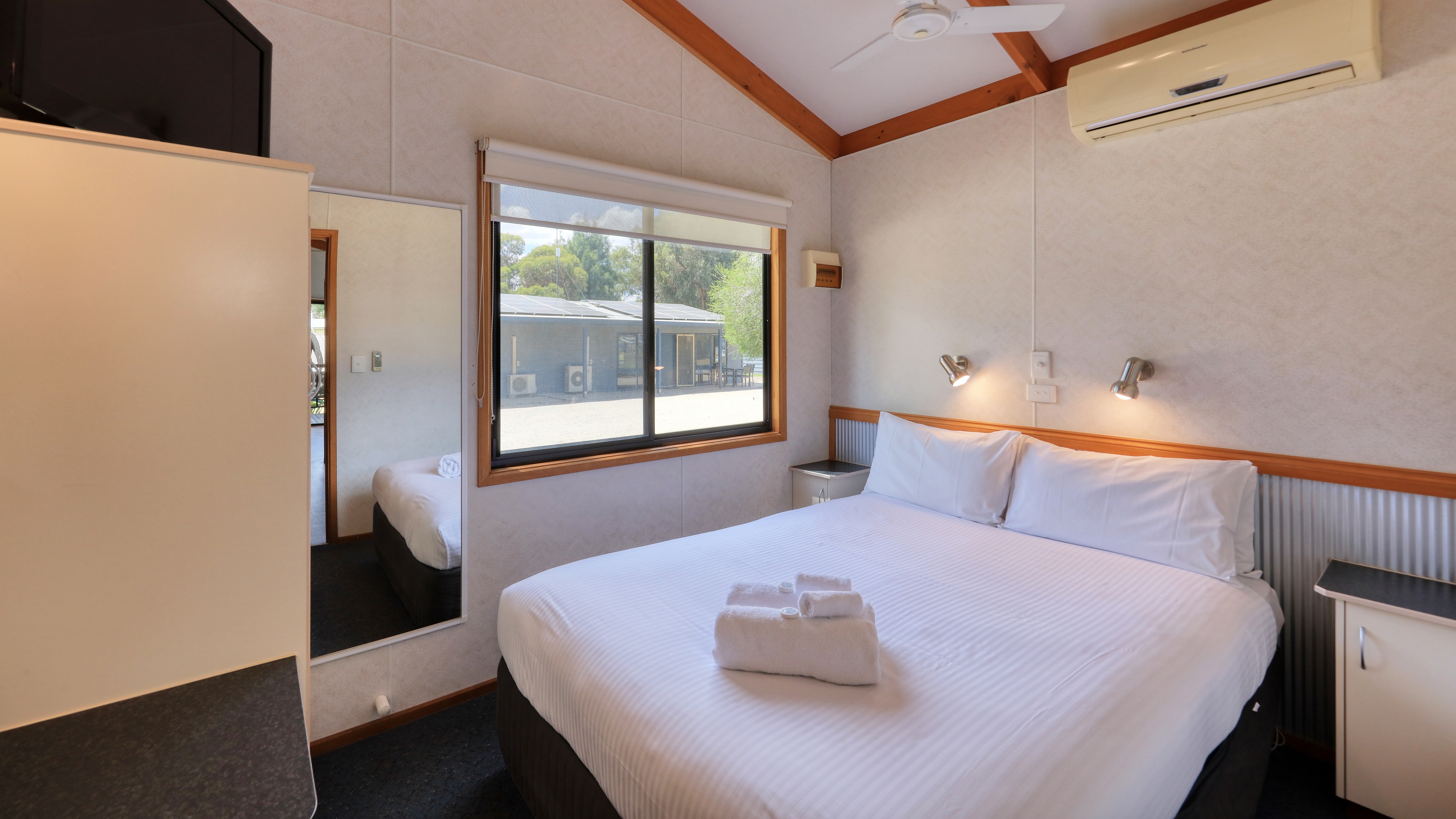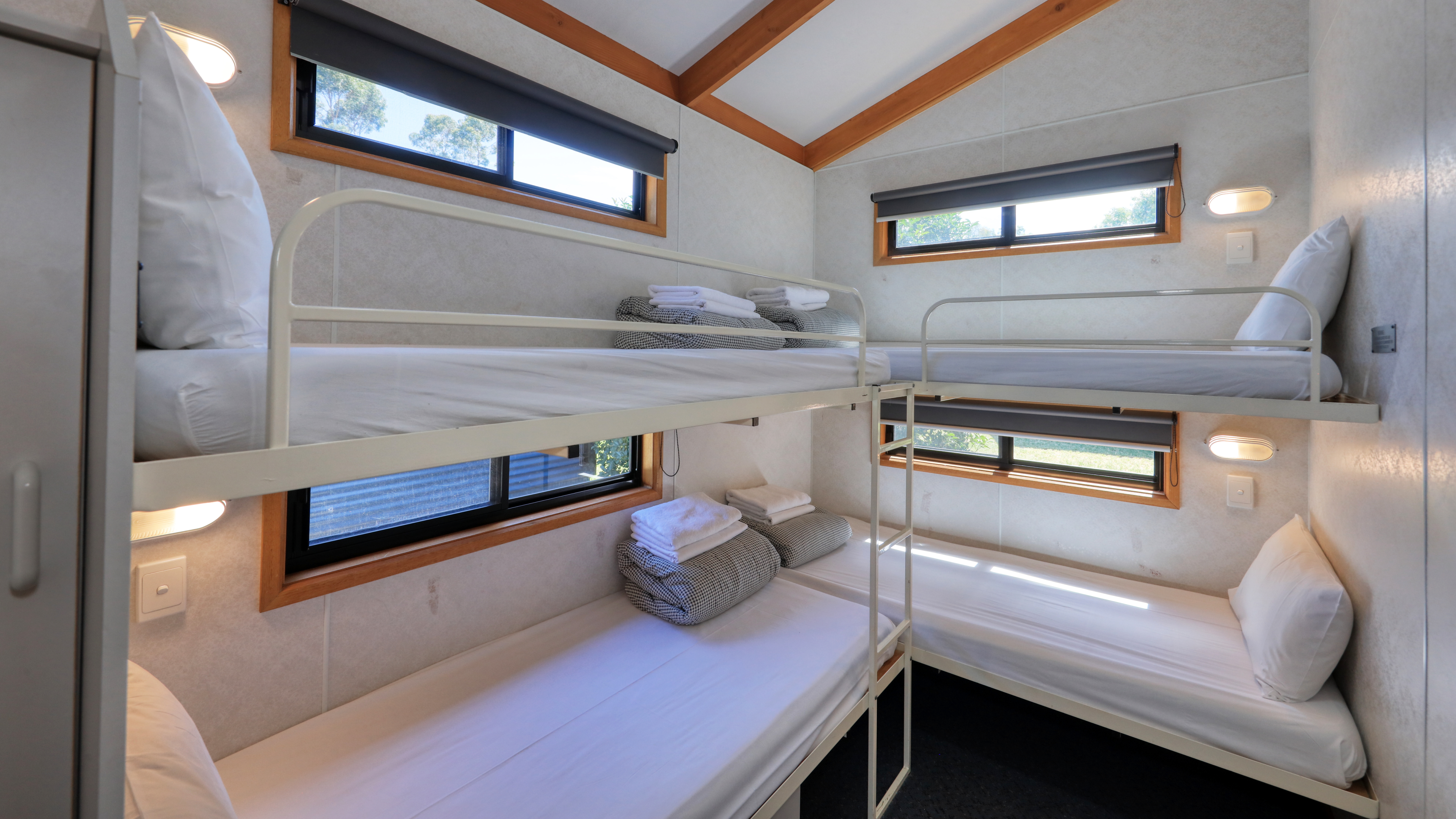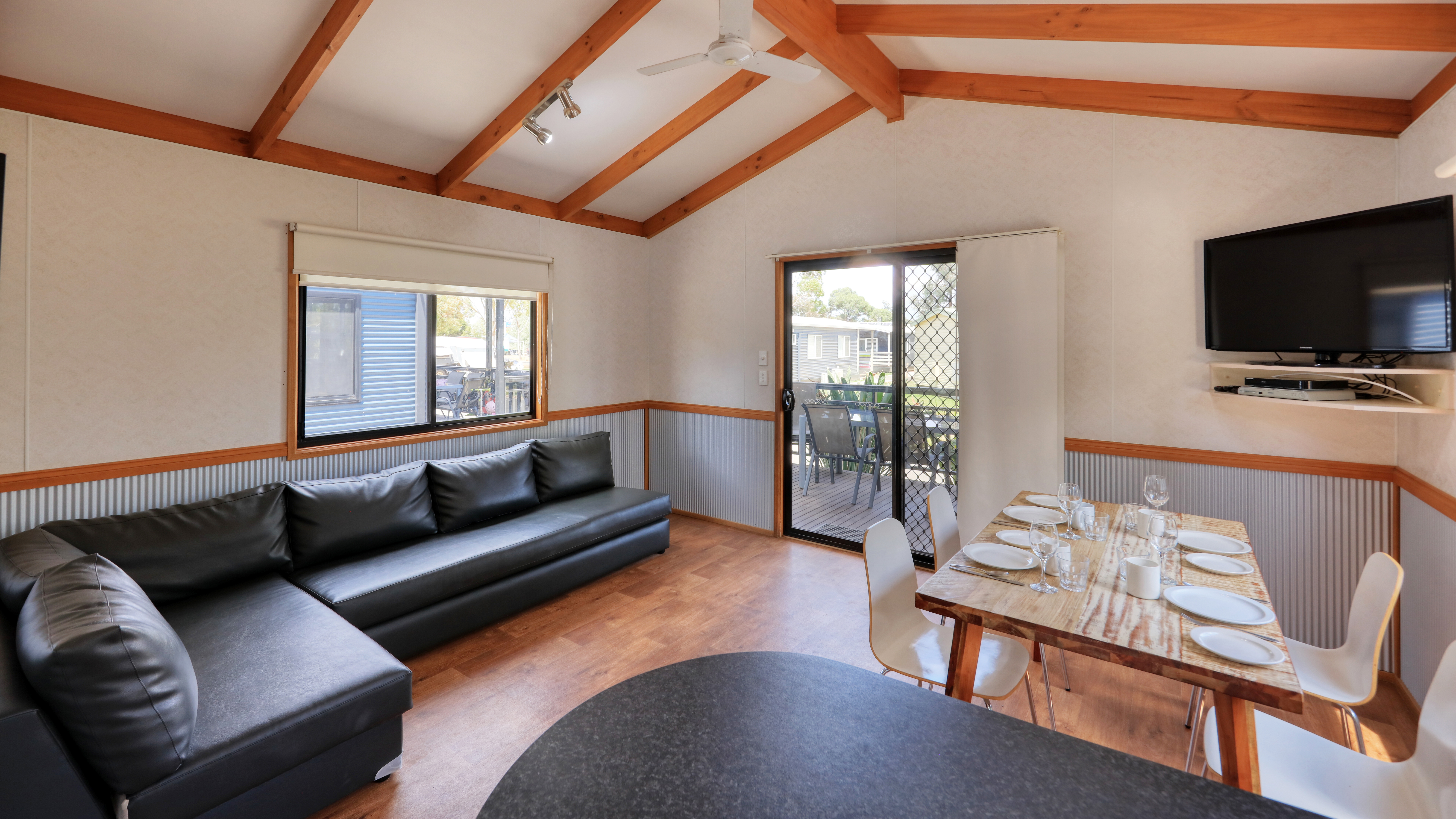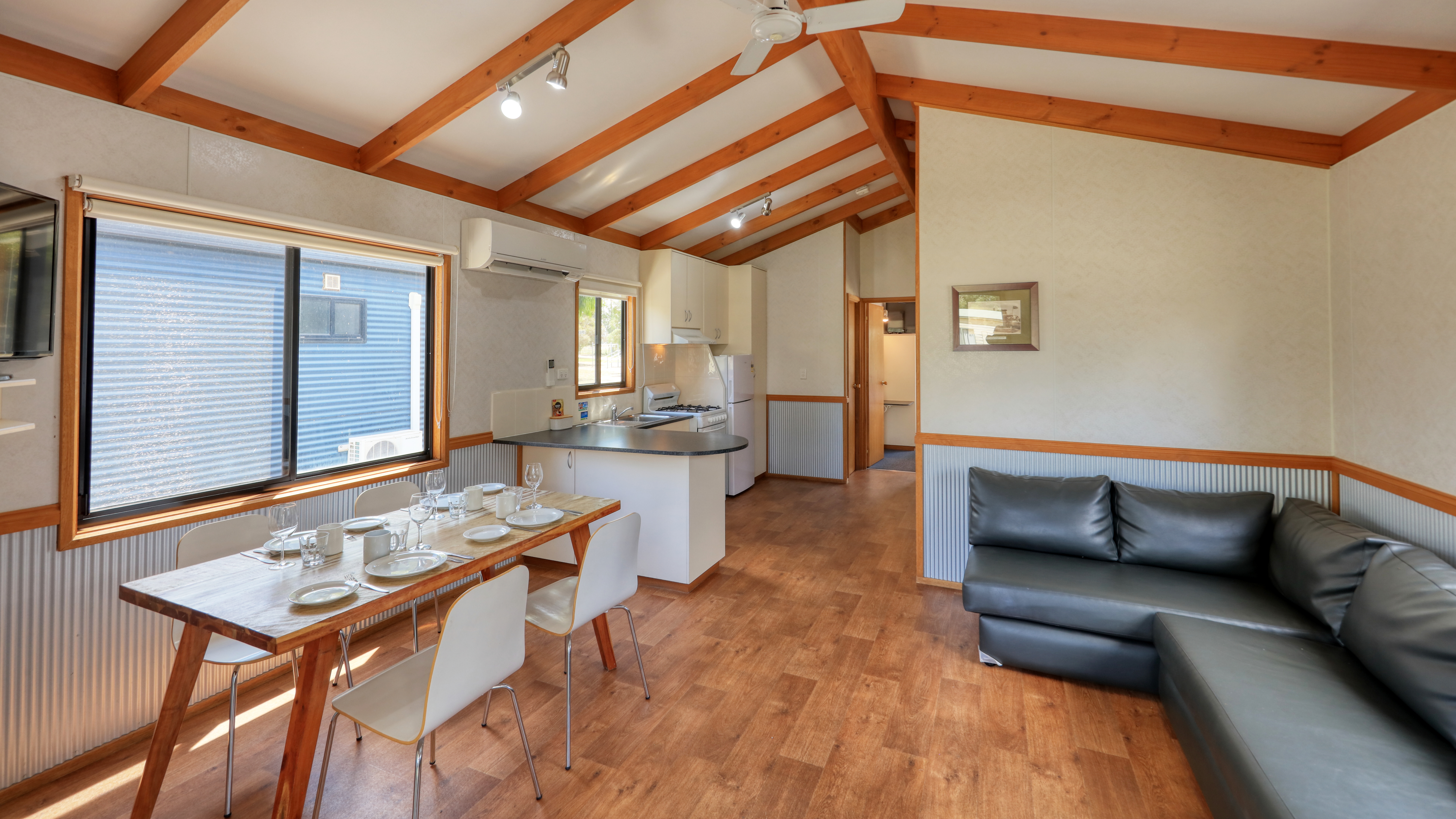 This accommodation contains 2 separate bedrooms, kitchen/living room and bathroom. The main bedroom has a queen bed and television and the second bedroom has two sets of bunks, all linen is provided. The fully equipped kitchen comprises a full size stove, refrigerator and microwave. The living room has an LCD television and a DVD player. Split system air conditioning keeps the temperature under control. A large deck at the front of the cabin provides an ideal setting for alfresco dining.