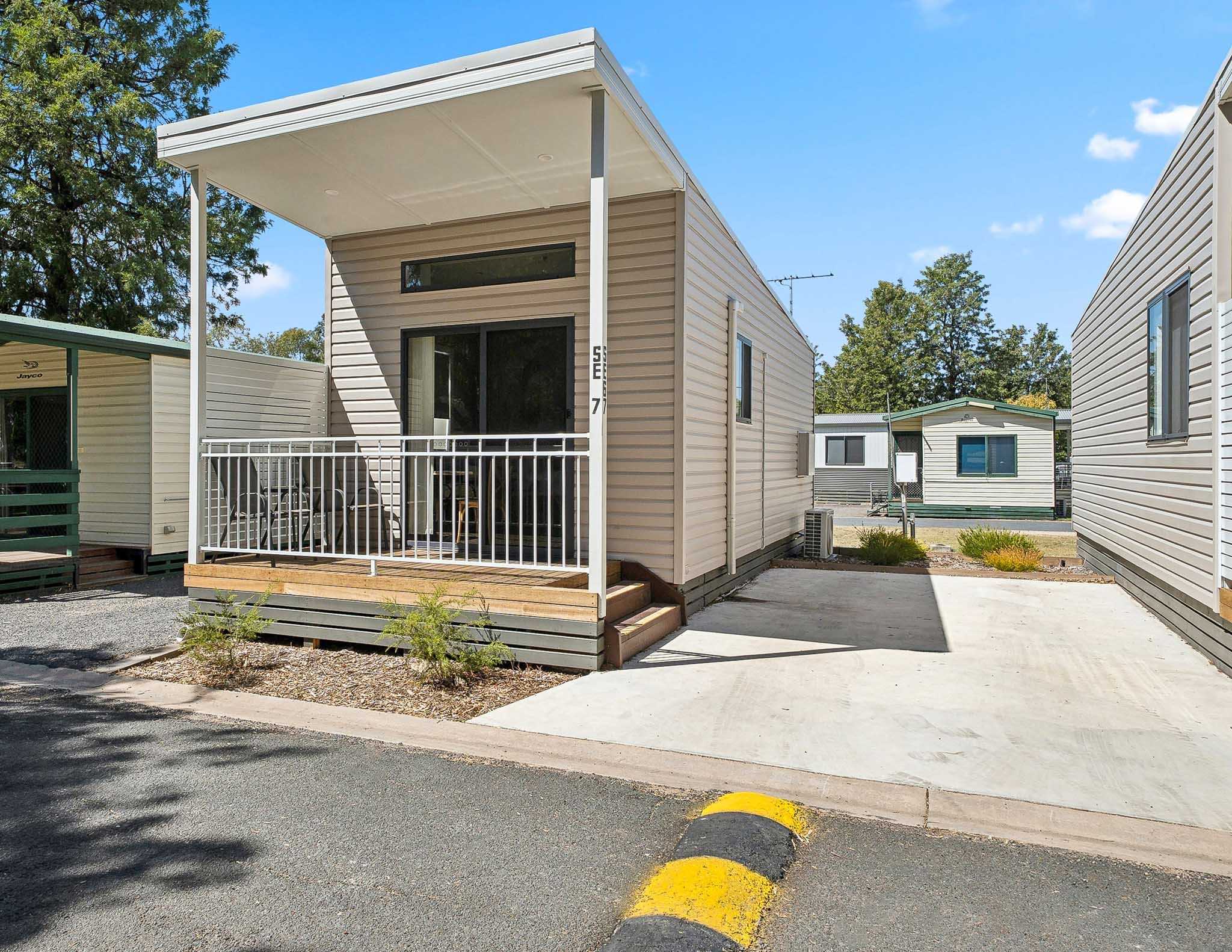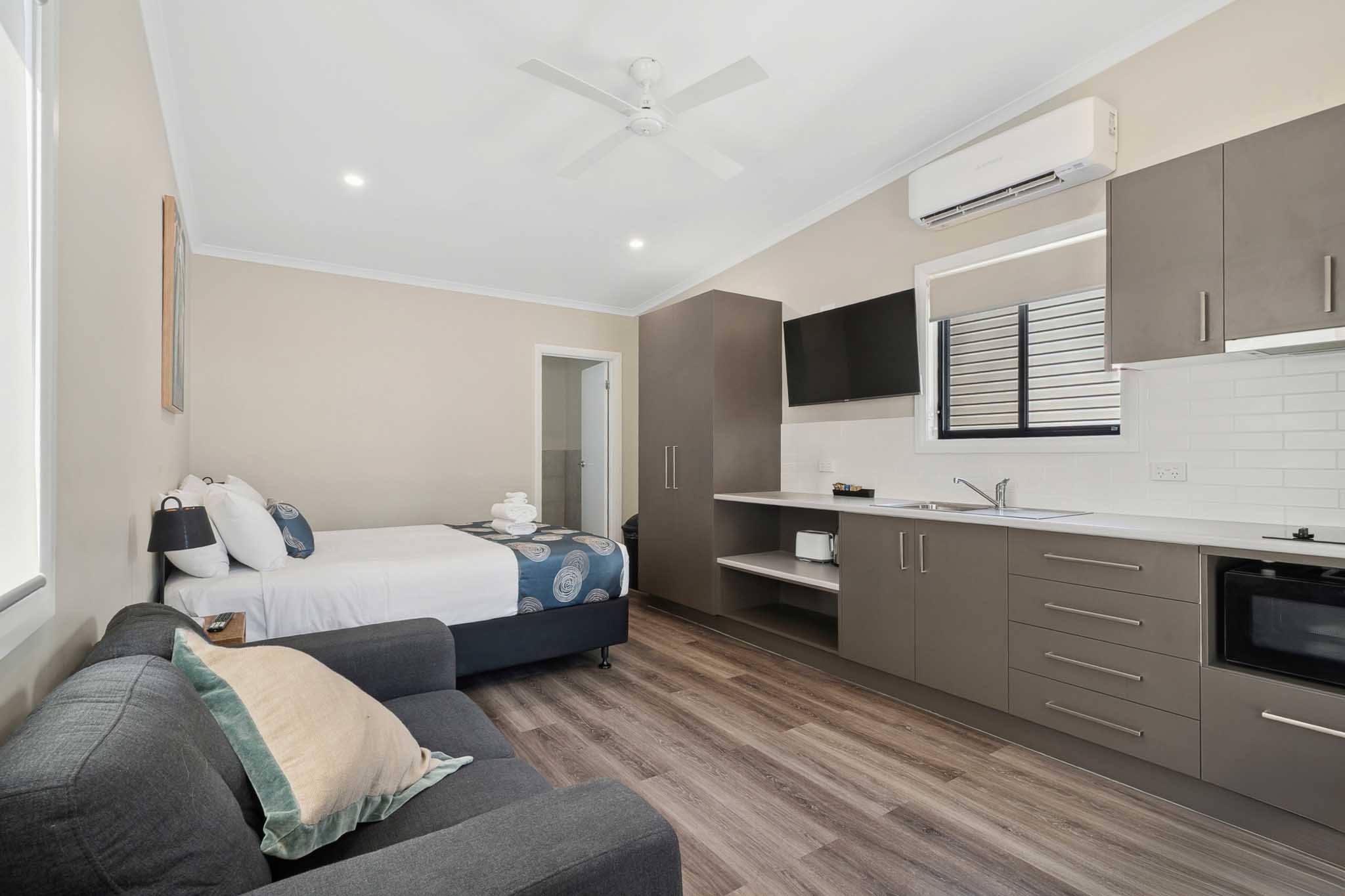 This modern studio cabin is perfect for couples or solo travellers, featuring a queen bed and open-plan layout. Enjoy a well-equipped kitchenette with electric oven, stovetop, microwave, and full-size fridge. Relax with air conditioning, a private ensuite, and TV for winding down. With towels, toiletries, and all essentials included, it’s an ideal base for peaceful getaways or business stays.