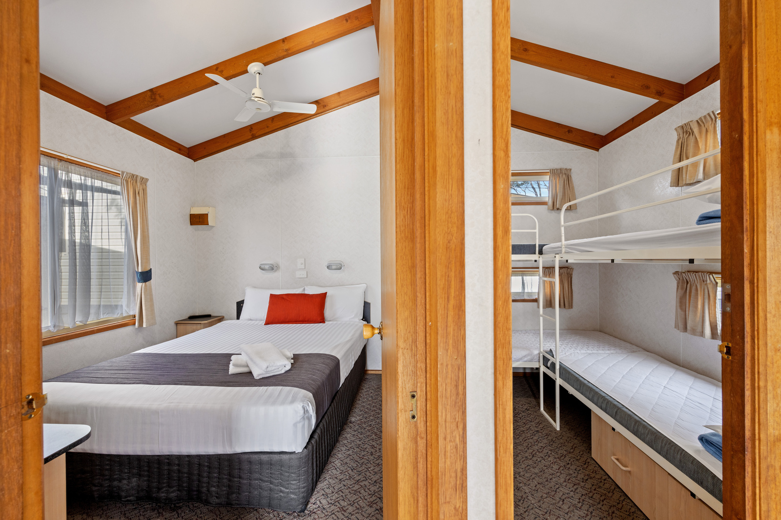 Stay with added space and privacy. Our two bedroom Villas sleep up to six guests with a queen bed in the main bedroom and two bunks in the second bedroom, as well as a bathroom, living area, kitchen, and private deck.