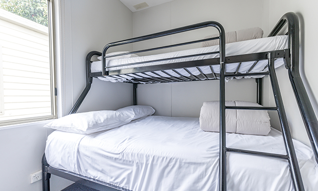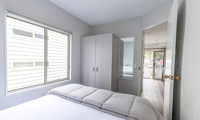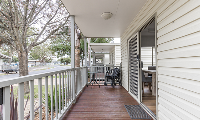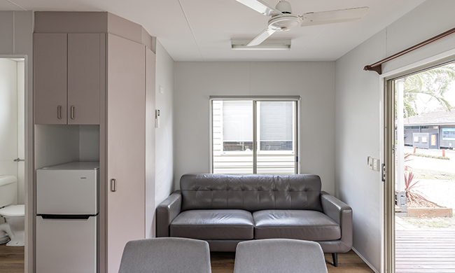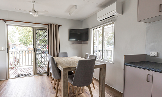 Enjoy easy access to key facilities. Standard two bedroom cabin sleeping up to five. One queen, and one single bunk with double. Featuring split system air-conditioning; kitchen with microwave, stovetop, and fridge; bathroom; lounge and dining area; TV; veranda with outdoor seating.