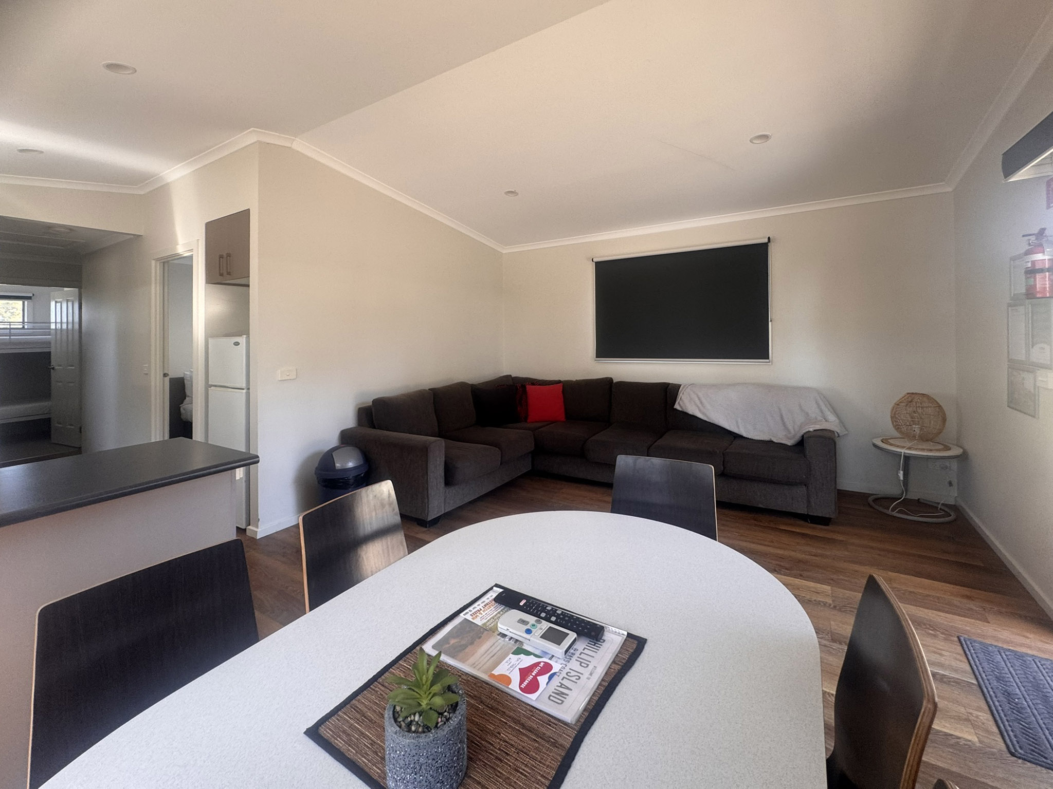 With the ability to accommodate up to 8 people comfortably, this cabin is perfect for a large family or group of friends. The spacious open plan will have you socialising with ease in your kitchen, dining and lounge area. Begin your day with the convenience of a double shower and vanity unit in the bathroom, making for a great start to any holiday.