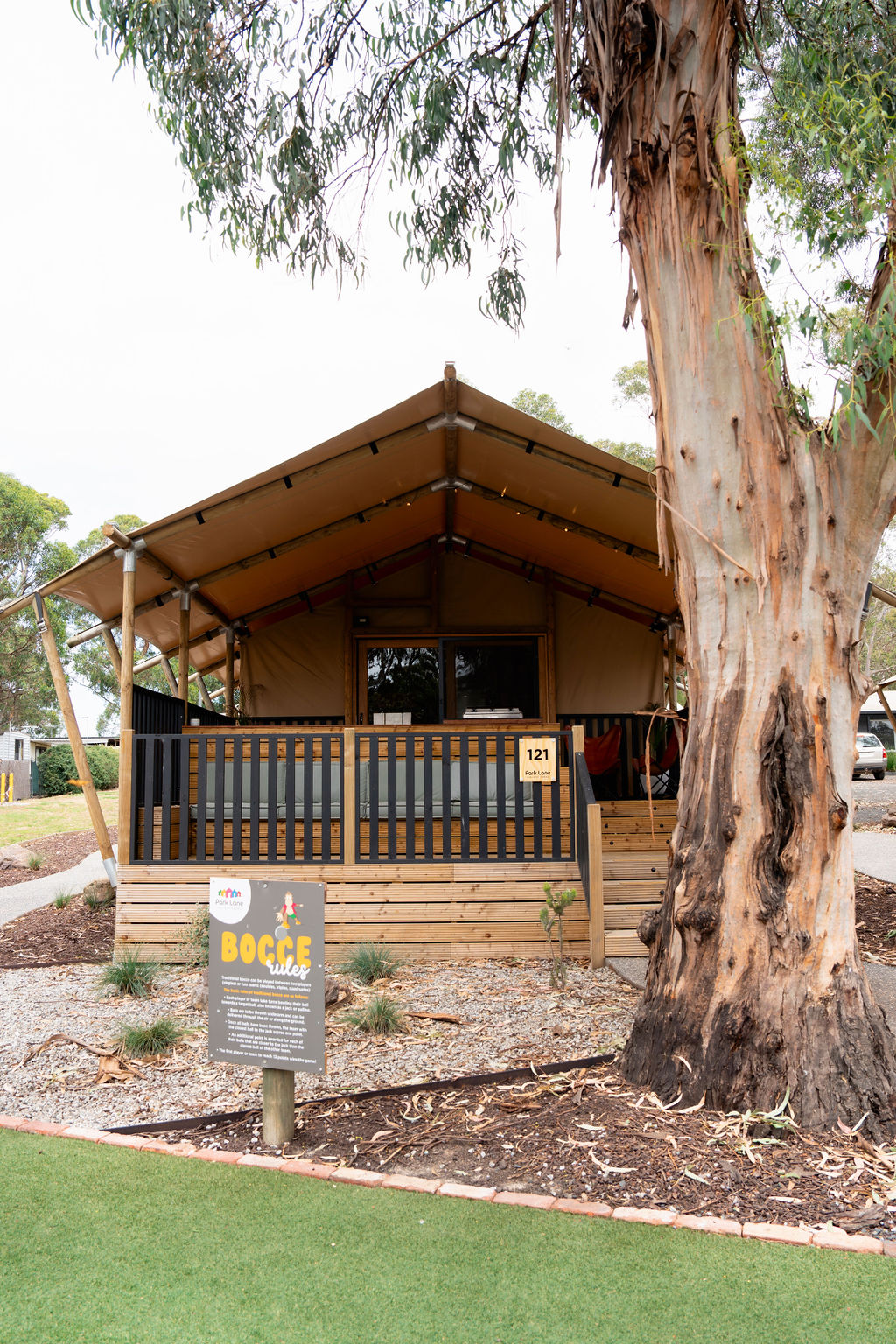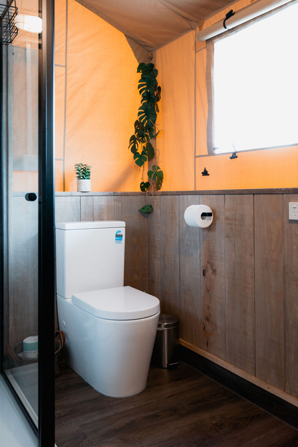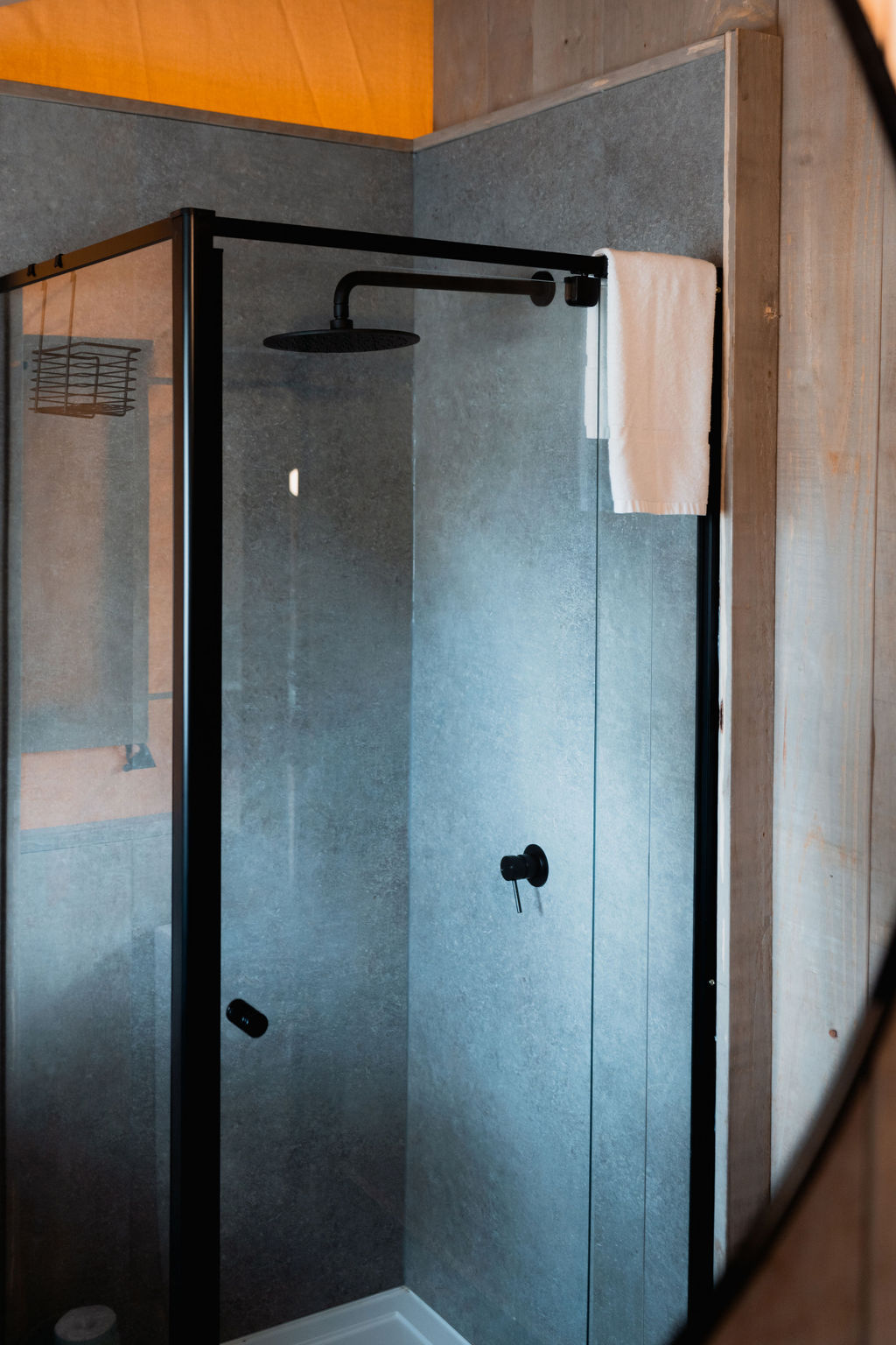 Accommodating up to 6 people, the tent includes a kitchen, luxury bathroom, reverse cycle AC and comfy beds to give you a true glamping experience.