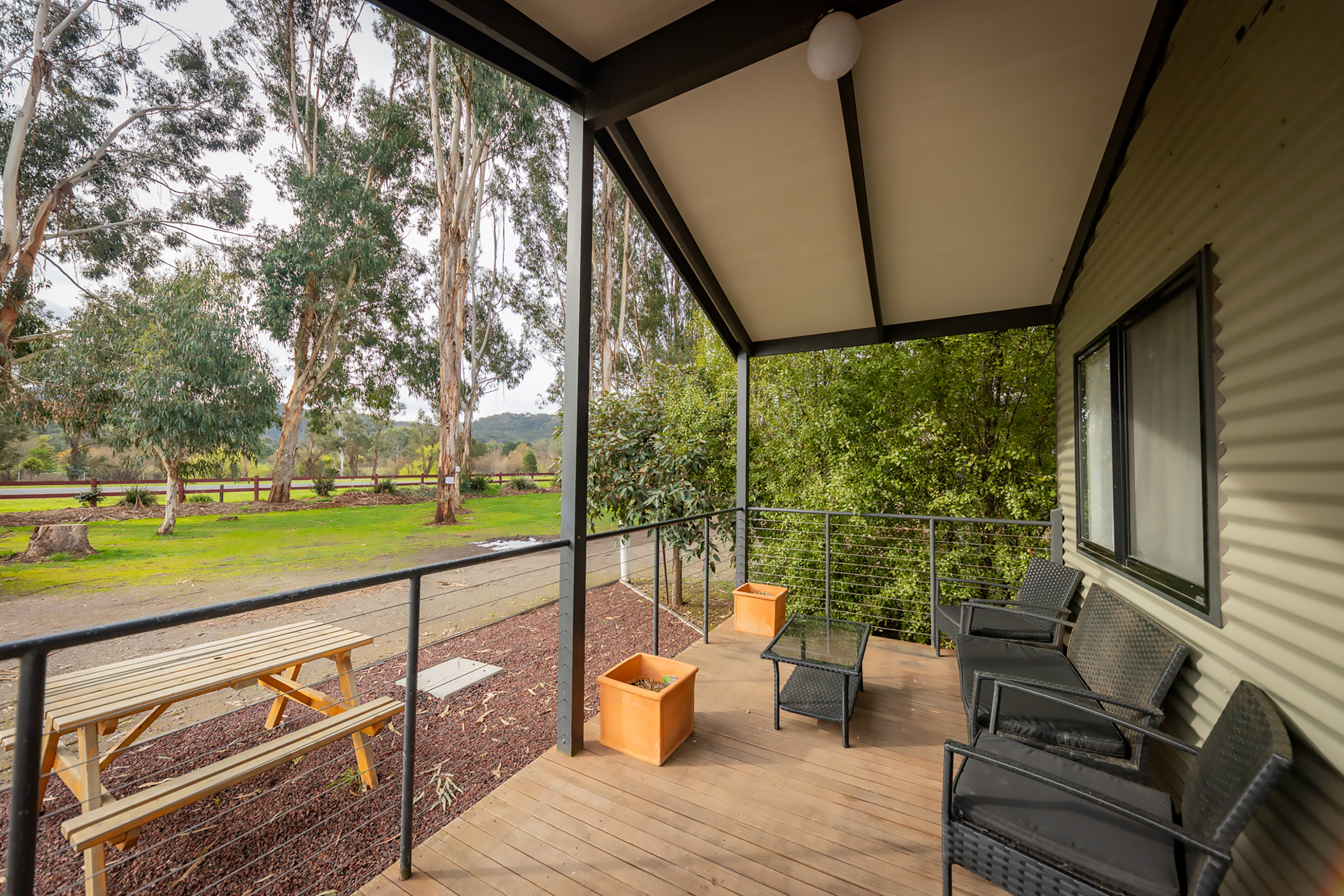 The cabin has a self-contained kitchen including a fridge, microwave, stovetop and plenty of crockery and cutlery with a seperate dining area, and a TV in the living area. The bathroom in the cabin includes a shower, toilet, and vanity. The cabin is air-conditioned for your comfort.