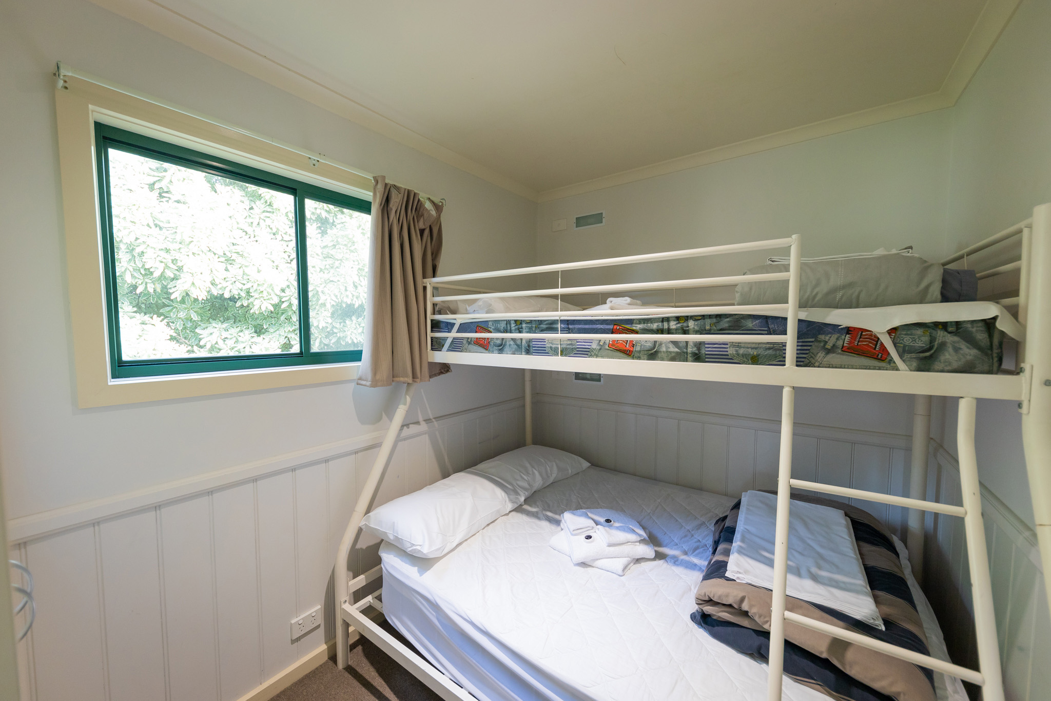 This open-plan cabin offers a queen bed in the main bedroom and second bedroom, and a tri-bunk in the third bedroom.