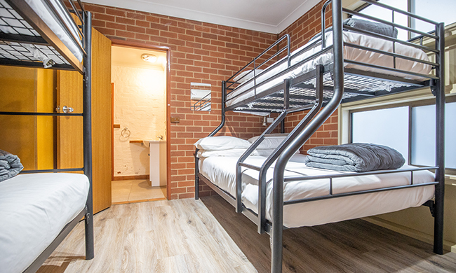 Dorm-style accommodation. One Bedroom with: One double with single top bunk and one single bunk. Features outdoor patio and use of shared bathroom and holiday park facilities.