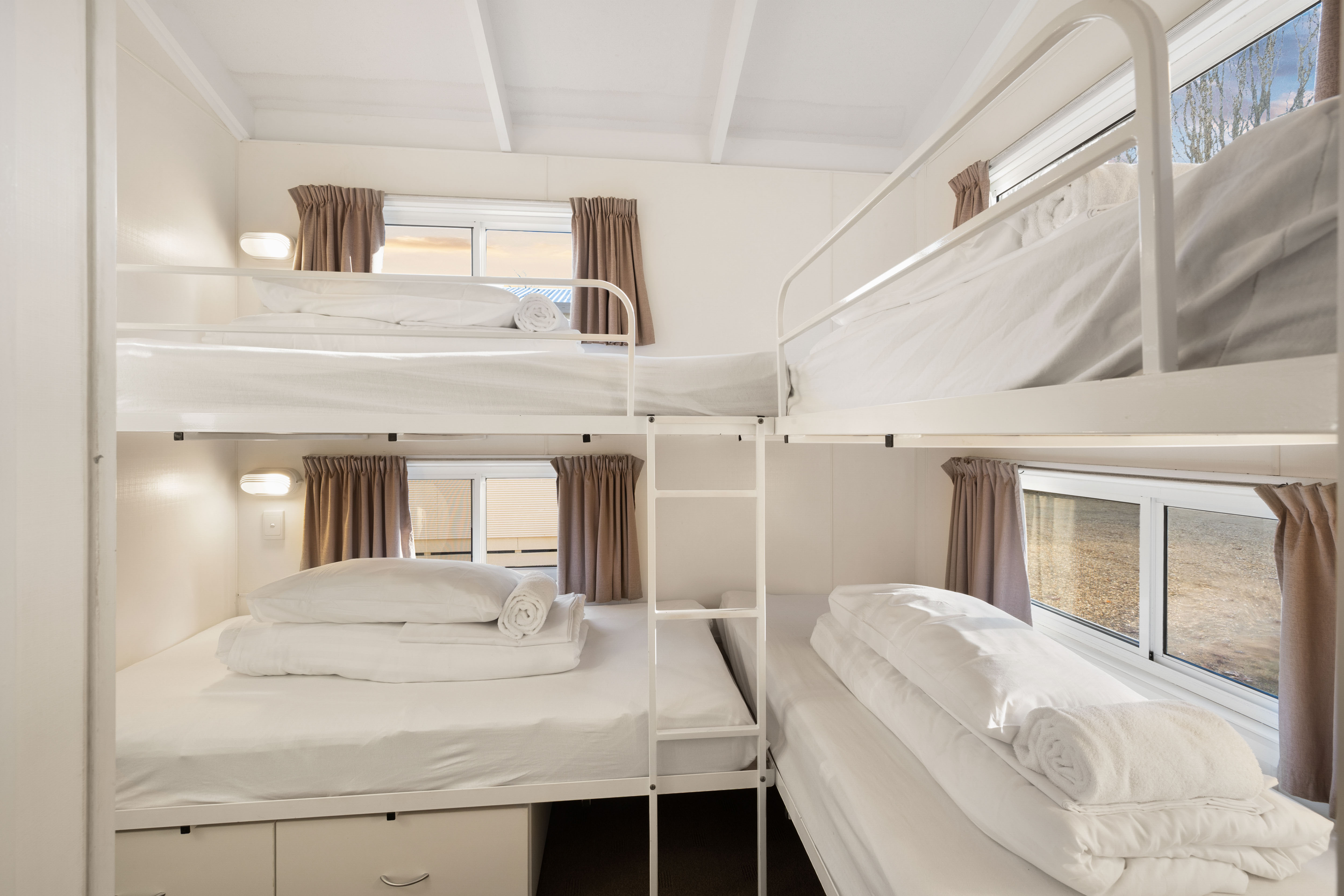 The Deluxe Villa is a two-bedroom cabin; the main bedroom with a queen bed, and the second bedroom has two sets of bunk beds.