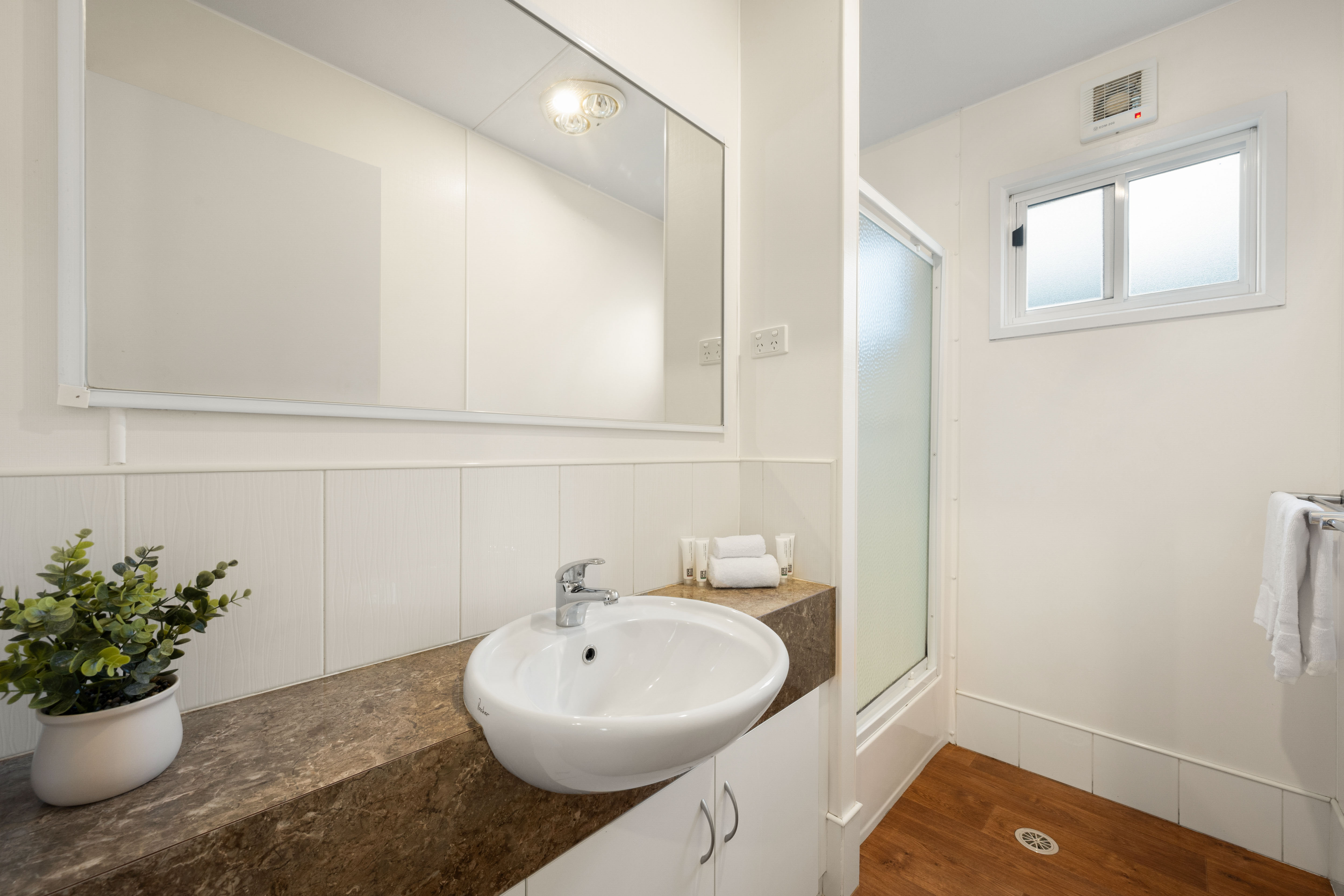 Each villa features two bedrooms—the main bedroom with a queen bed, and a second bedroom fitted with two sets of bunk beds—making it ideal for families. Full linen is provided for your convenience.