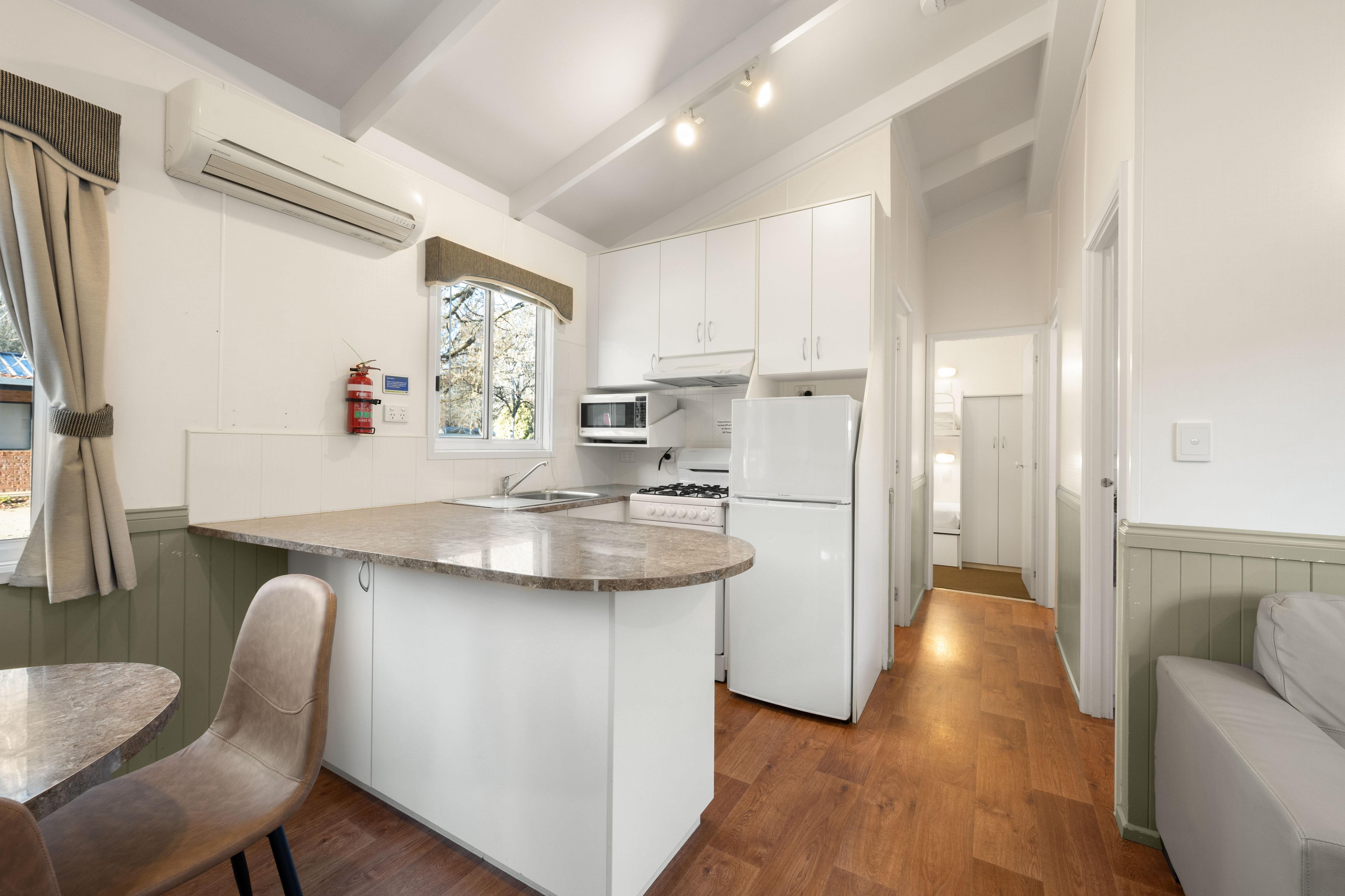 Inside, you'll find a bathroom with a separate toilet, and a well-equipped kitchen with a full-size fridge, stove, and microwave. The living area includes two comfortable couches, a flat screen television, and a split system air-conditioner to keep you comfortable all year round. Step outside onto your private deck, complete with outdoor furniture, perfect for enjoying a quiet morning coffee or evening drinks as the sun sets.