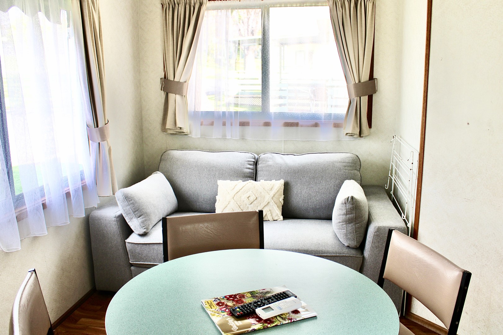 The lounge and dining area boasts a 3-seater sofa with a pull-out double bed, a dining table and chairs, a TV with a built-in DVD player, heating, air conditioning, and a ceiling fan. Best of all, the cabin is dog-friendly, so you can bring your furry friend along to enjoy the vacation too!