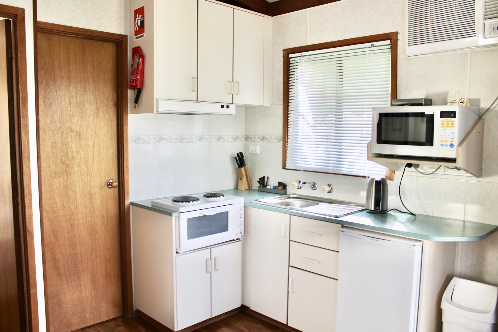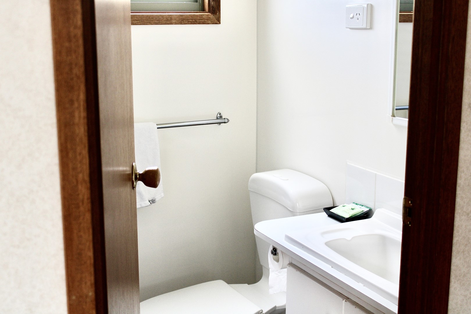 The ensuite bathroom is equipped with a toilet, a shower, and a hand basin. A hair dryer and drying rack are also provided. The kitchen comes fully equipped with an electric 2-burner cook-top, a small oven, a bar fridge, a microwave, an electric frypan, a kettle, a toaster, cutlery, and crockery.