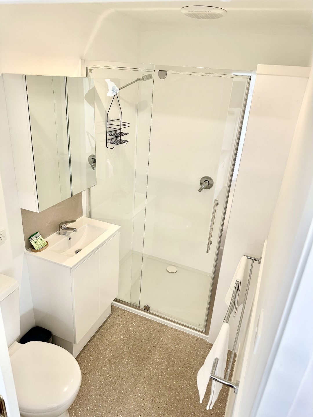 The bathroom is equipped with a toilet, shower with a hip tub at the base, hand basin, hairdryer, and drying rack.