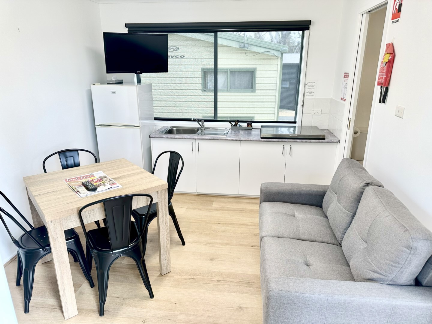 The lounge, kitchen, and dining area offer a 4-burner cooktop, large fridge, microwave, kettle, toaster, cutlery, and crockery. The dining area includes a table and chairs, and the lounge features a 2-seater sofa and a TV with a built-in DVD player. The cabin is air-conditioned and heated for your comfort.
