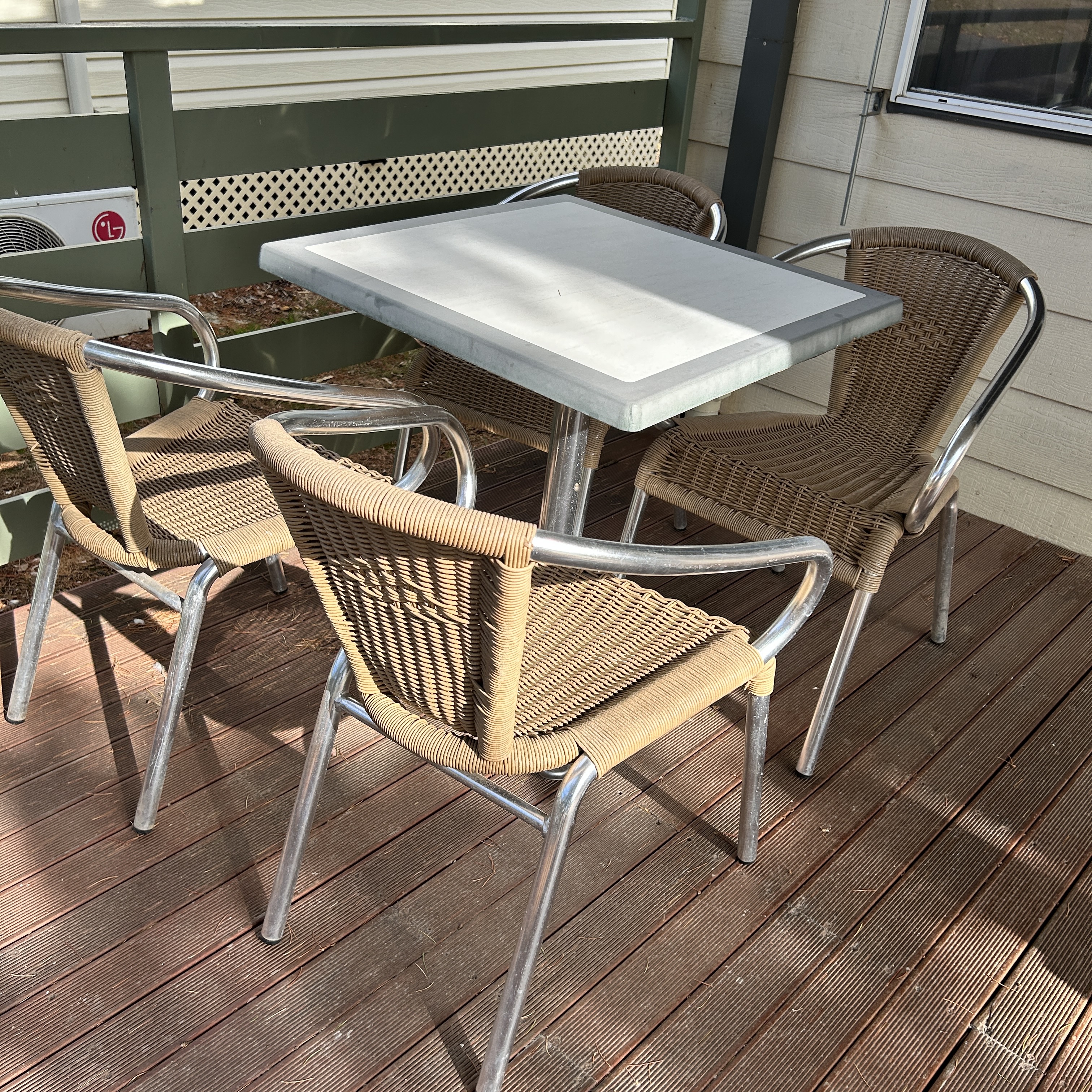 Outside, there is a veranda with table and chairs, perfect for relaxing.