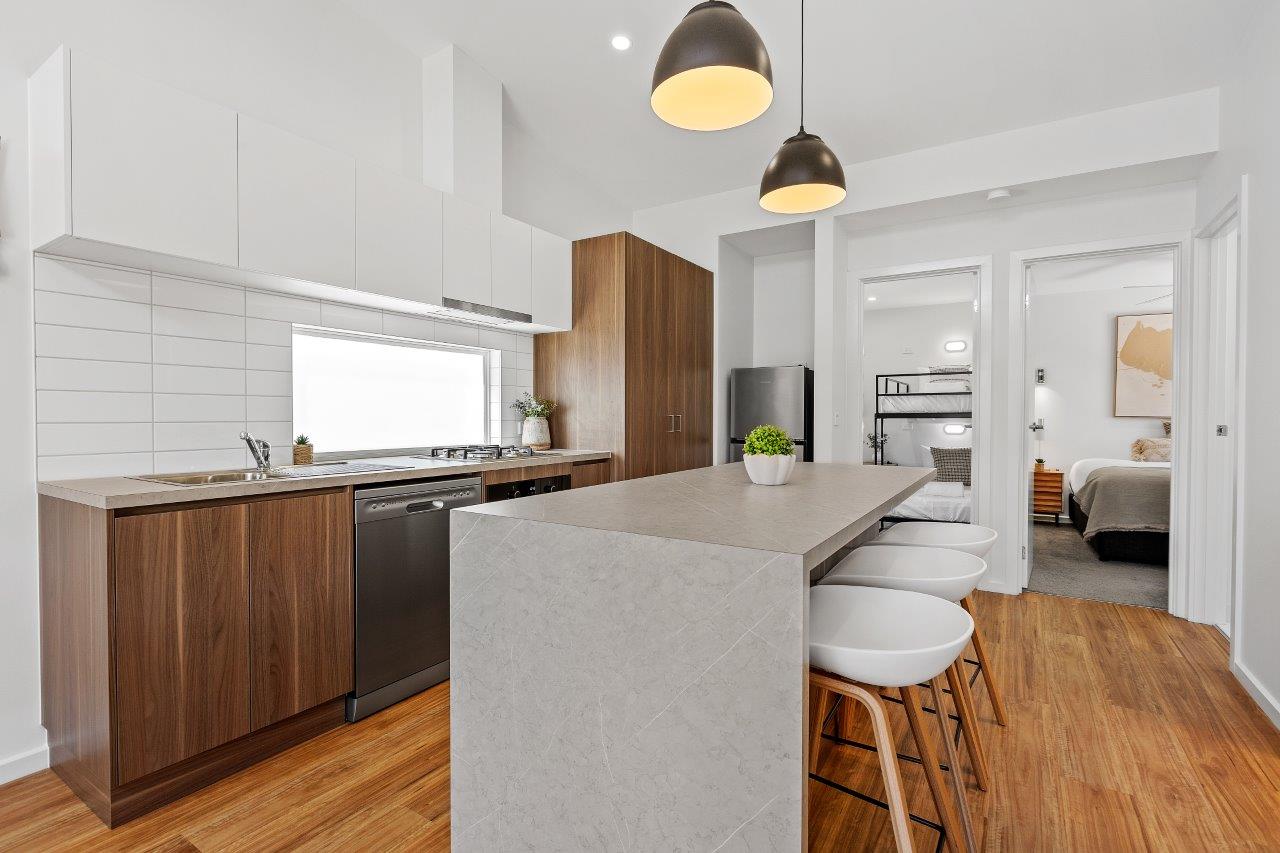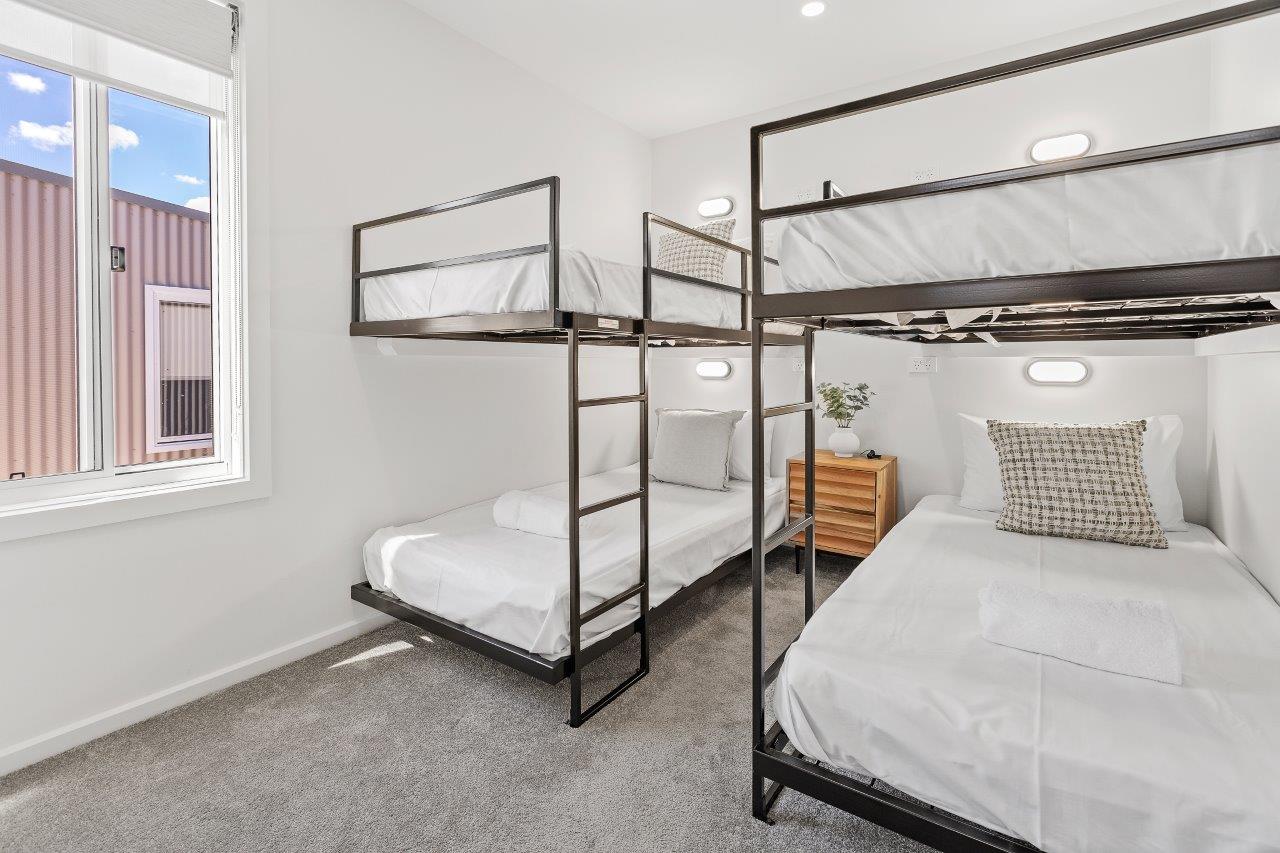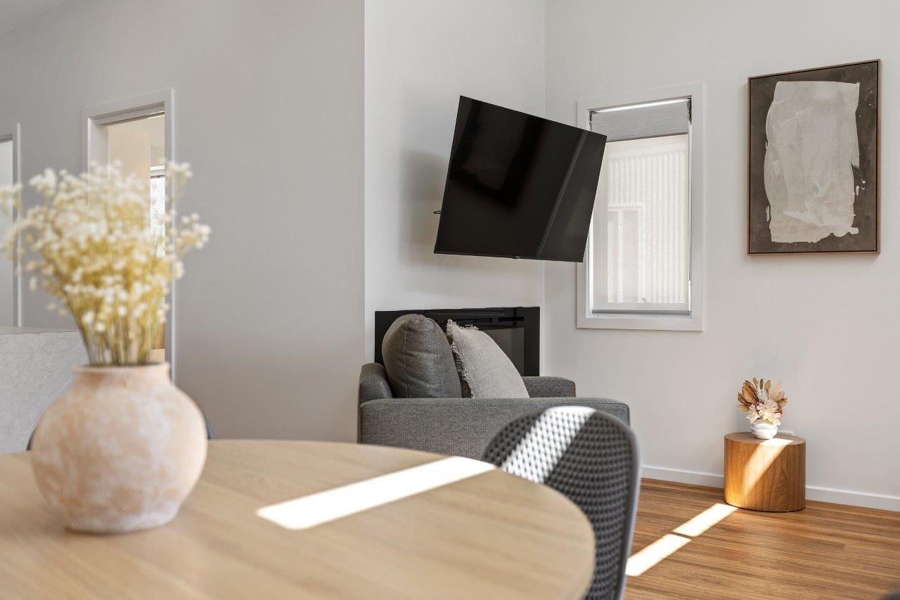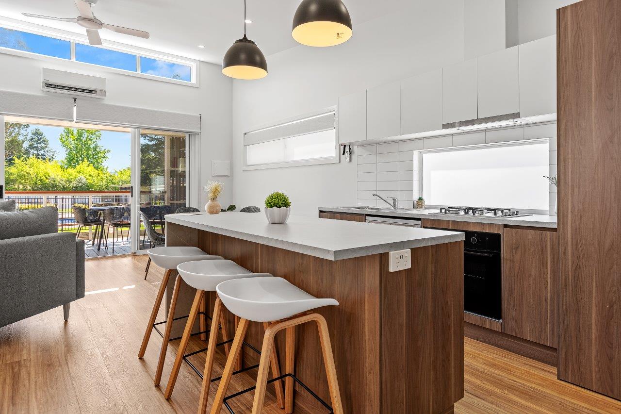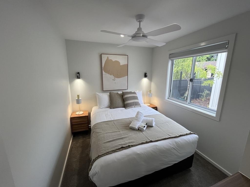 The main bedroom features a queen bed and the second bedroom features two King Single bunk beds. The spacious open plan living/dining area, with split system cooling, full kitchen, large electronic fireplace, and a stacker washer and dryer. These also feature a large deck near the pool in this beautifully newly developed and landscaped site.