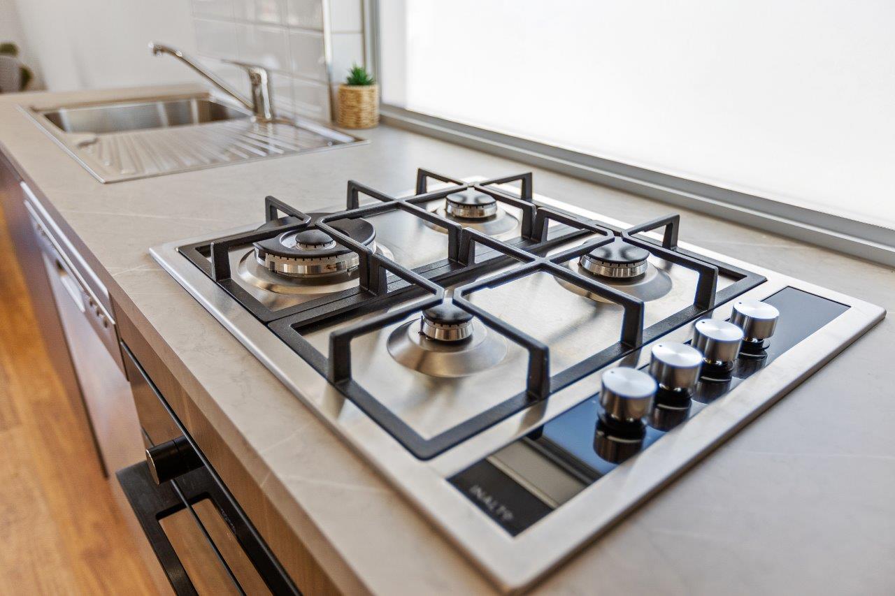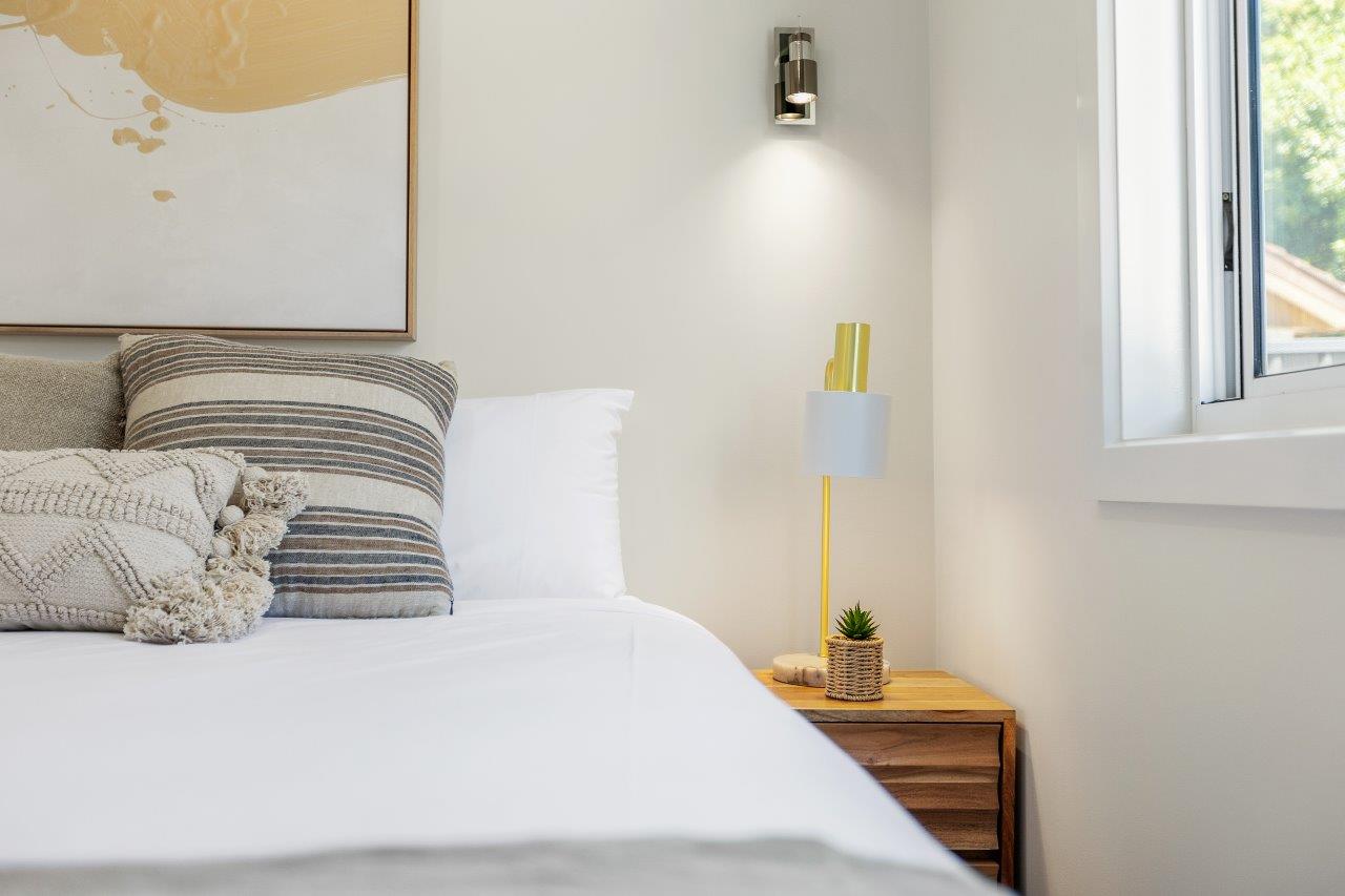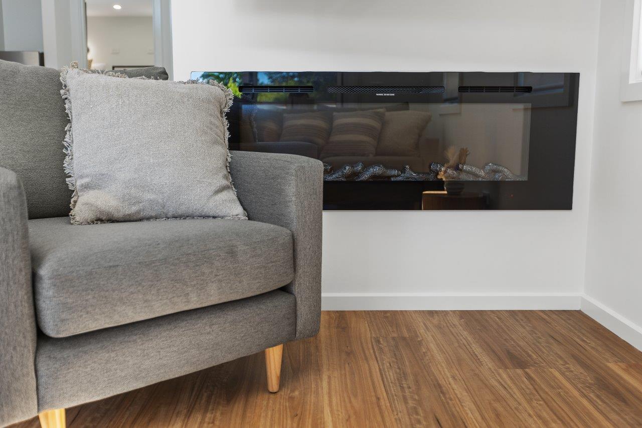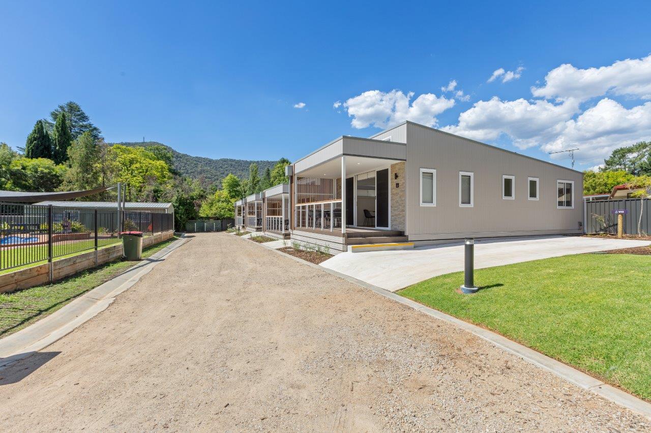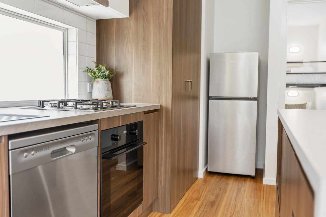 The main bedroom features a queen bed and the second bedroom features two King Single bunk beds. The spacious open plan living/dining area, with split system cooling, full kitchen, large electronic fireplace, and a stacker washer and dryer. These also feature a large deck near the pool in this beautifully newly developed and landscaped site.
