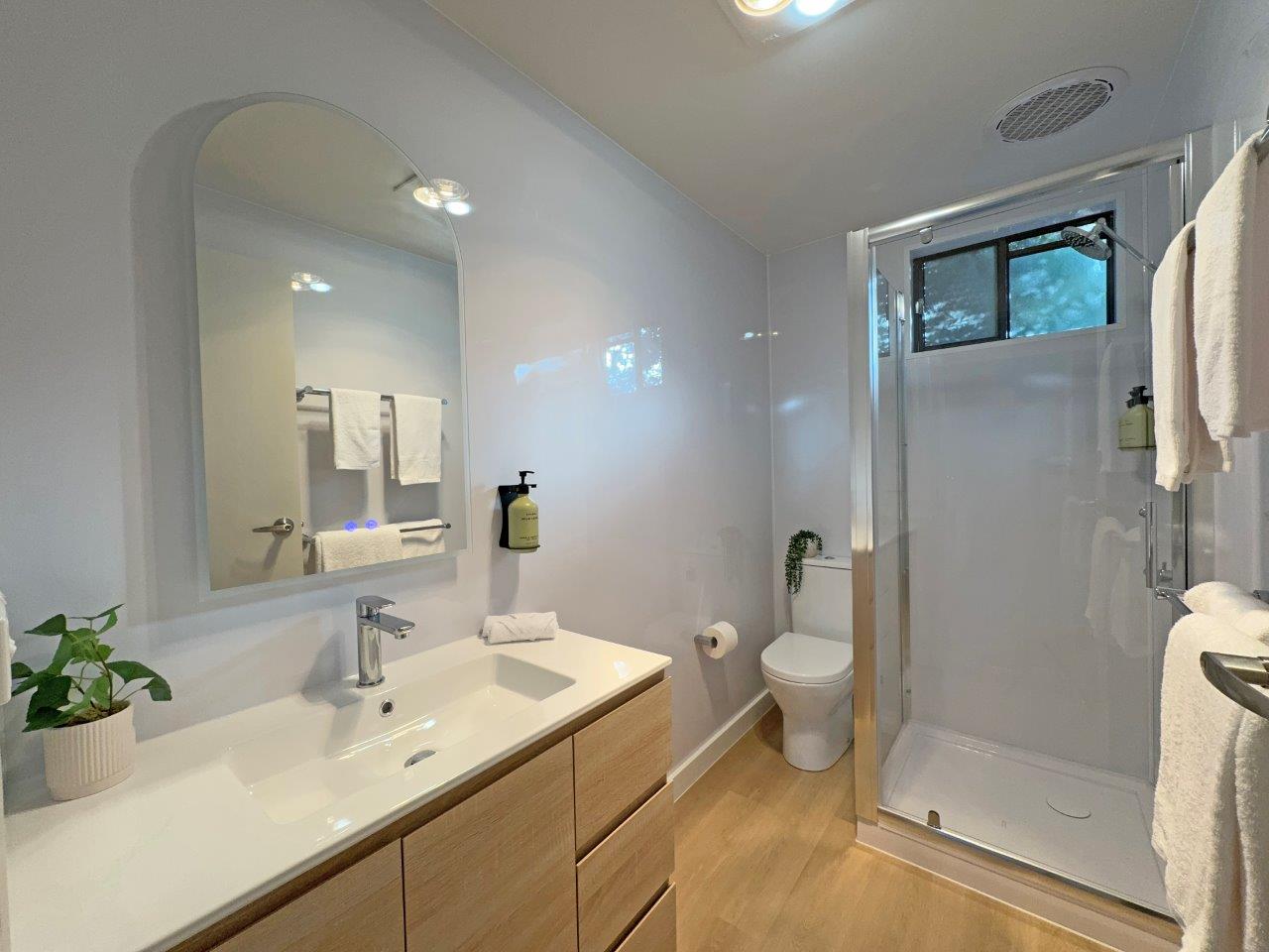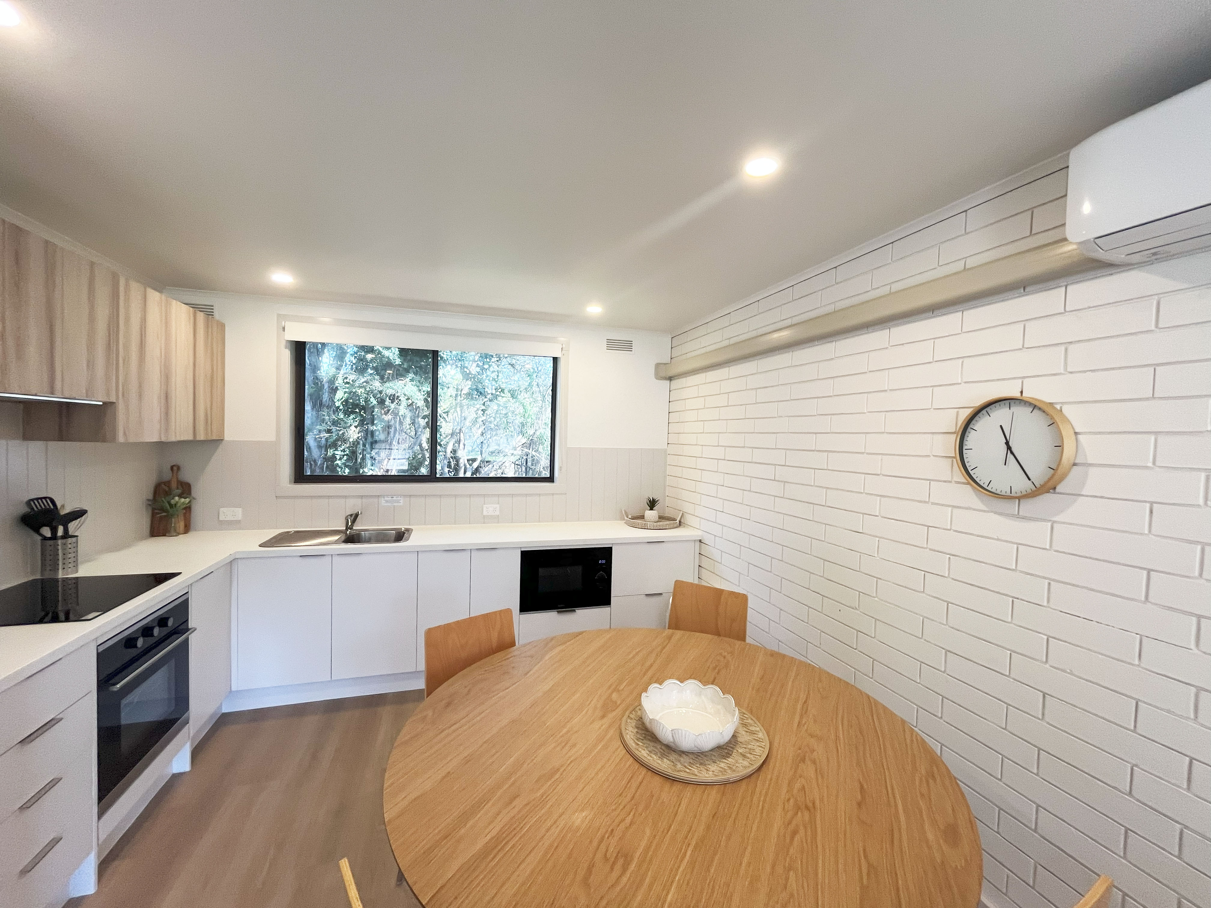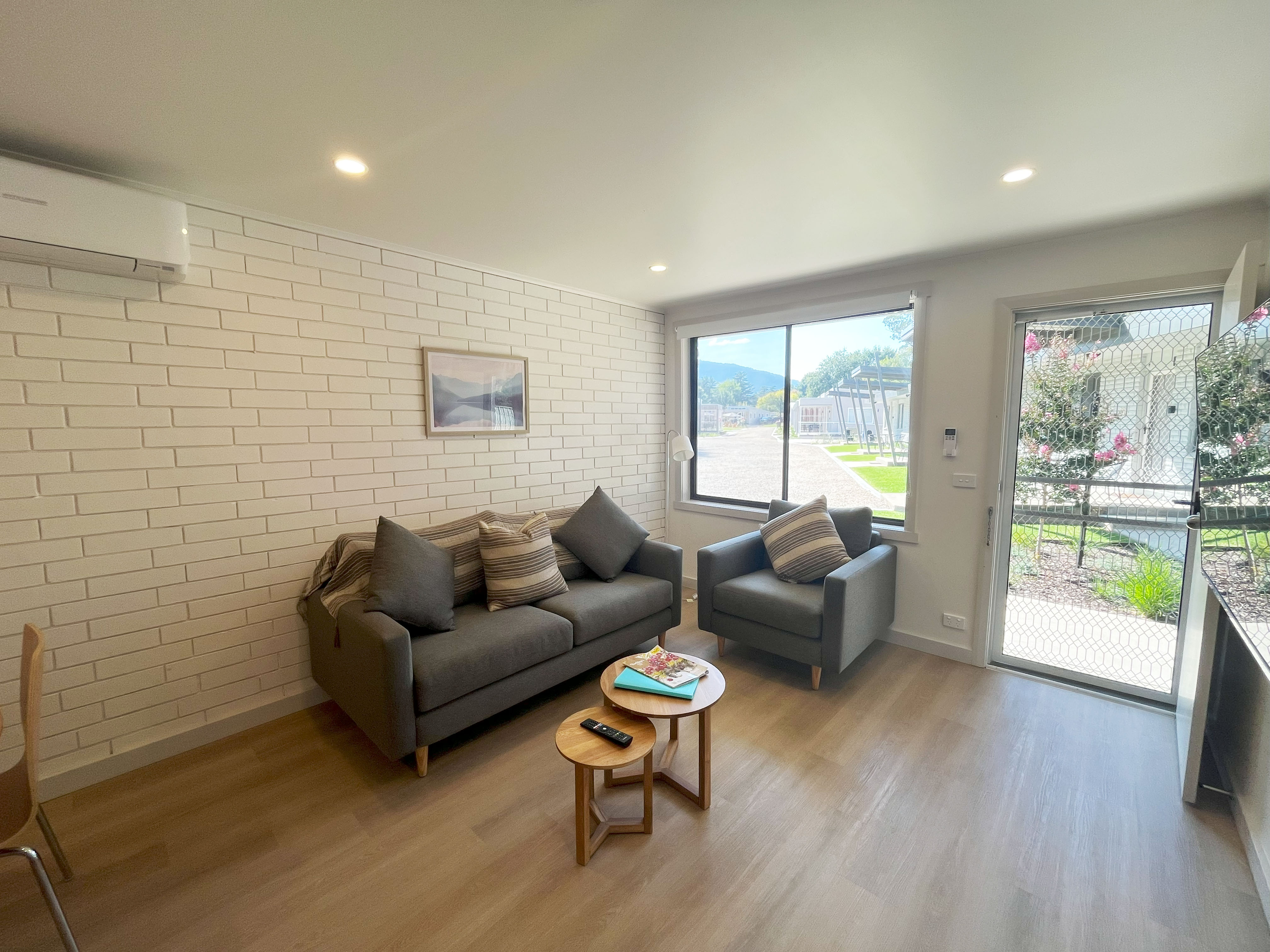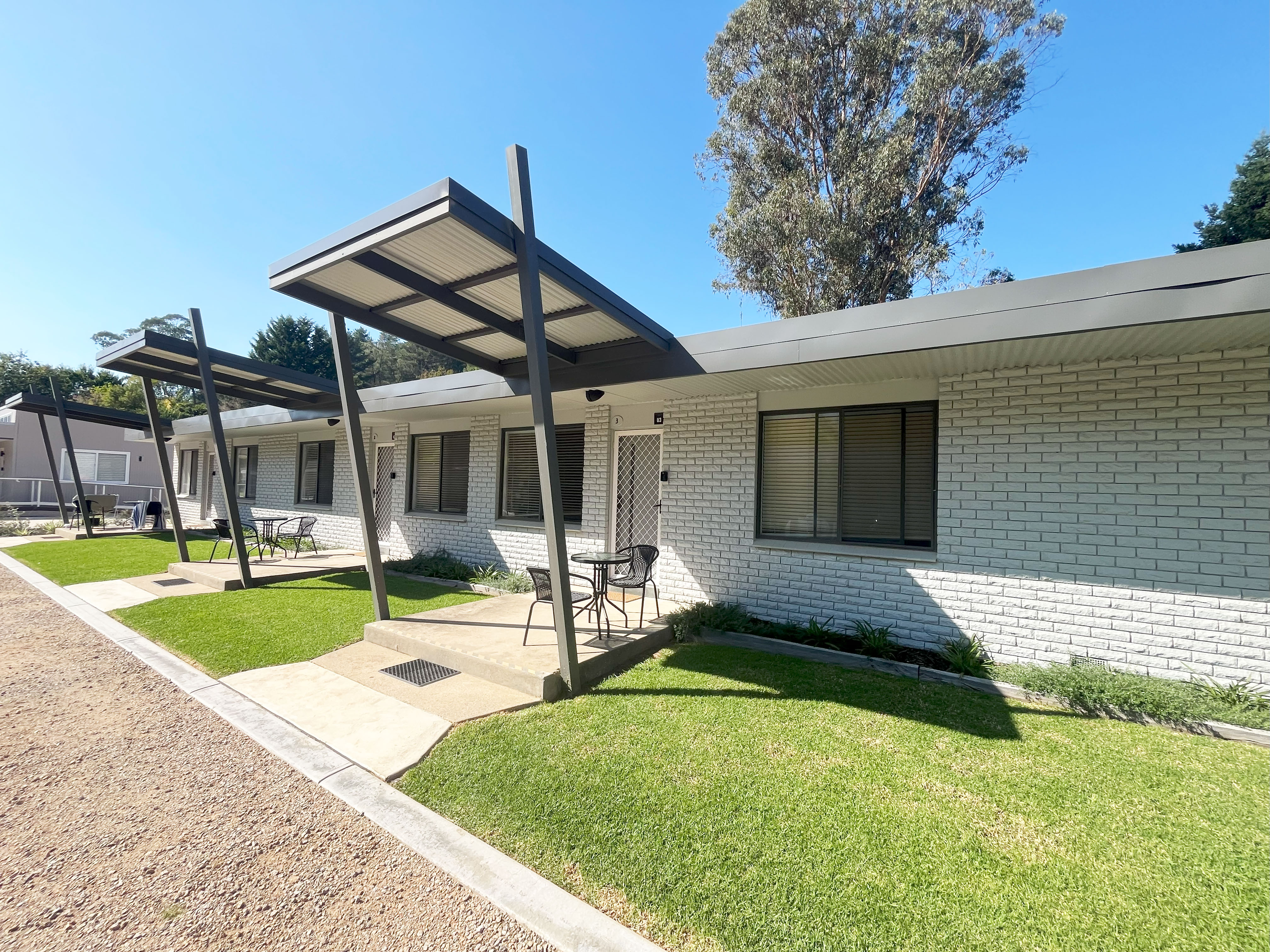 Perfect for a family of four, with queen bed in the main room and two singles in the second room. The units feature an open plan kitchen/living area, with fridge/freezer, microwave, full-size stove and oven. The bathroom features a shower, toilet and vanity. There’s split-system cooling/heating and the units open out onto a beautiful lawn and BBQ area.