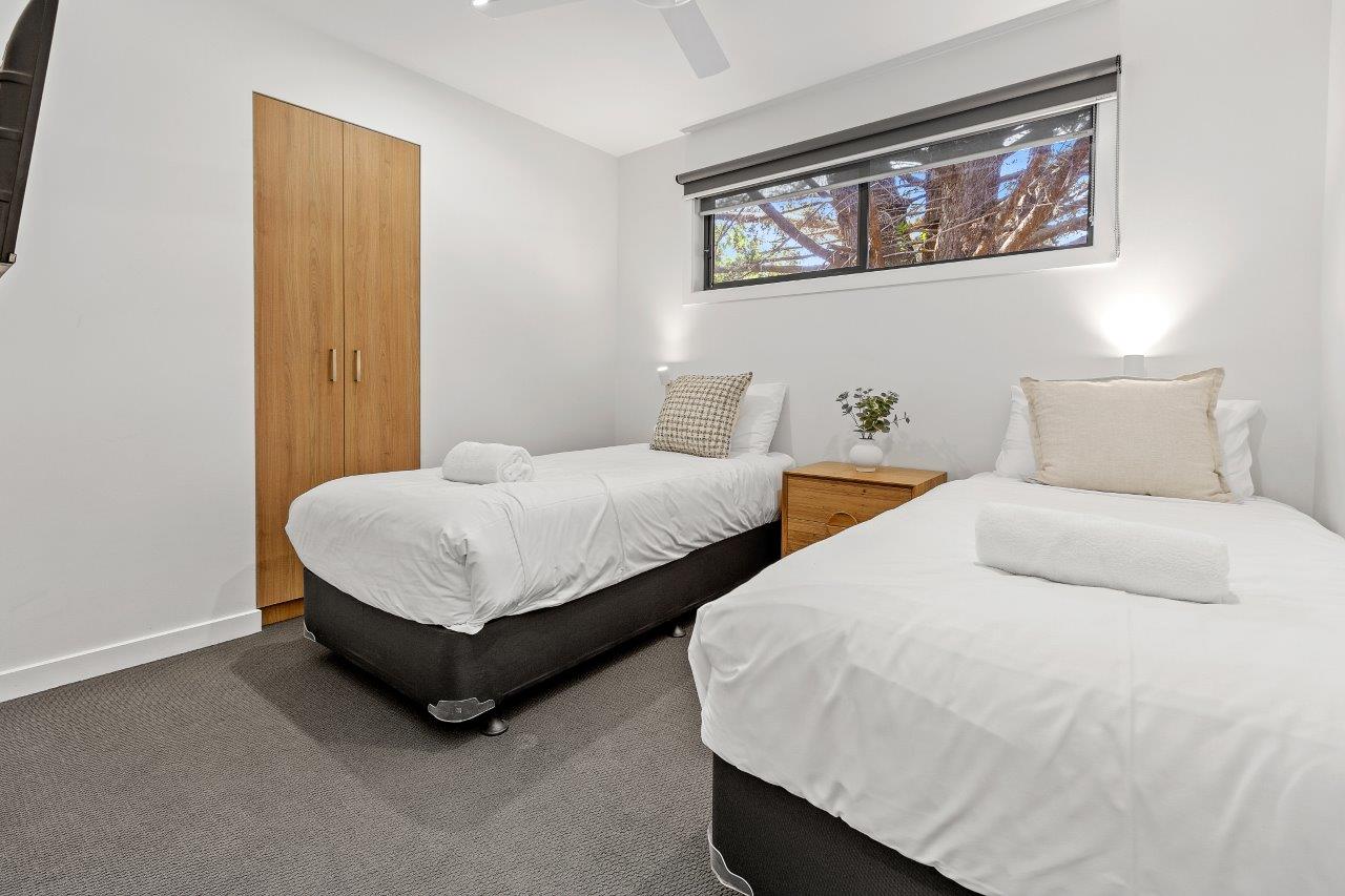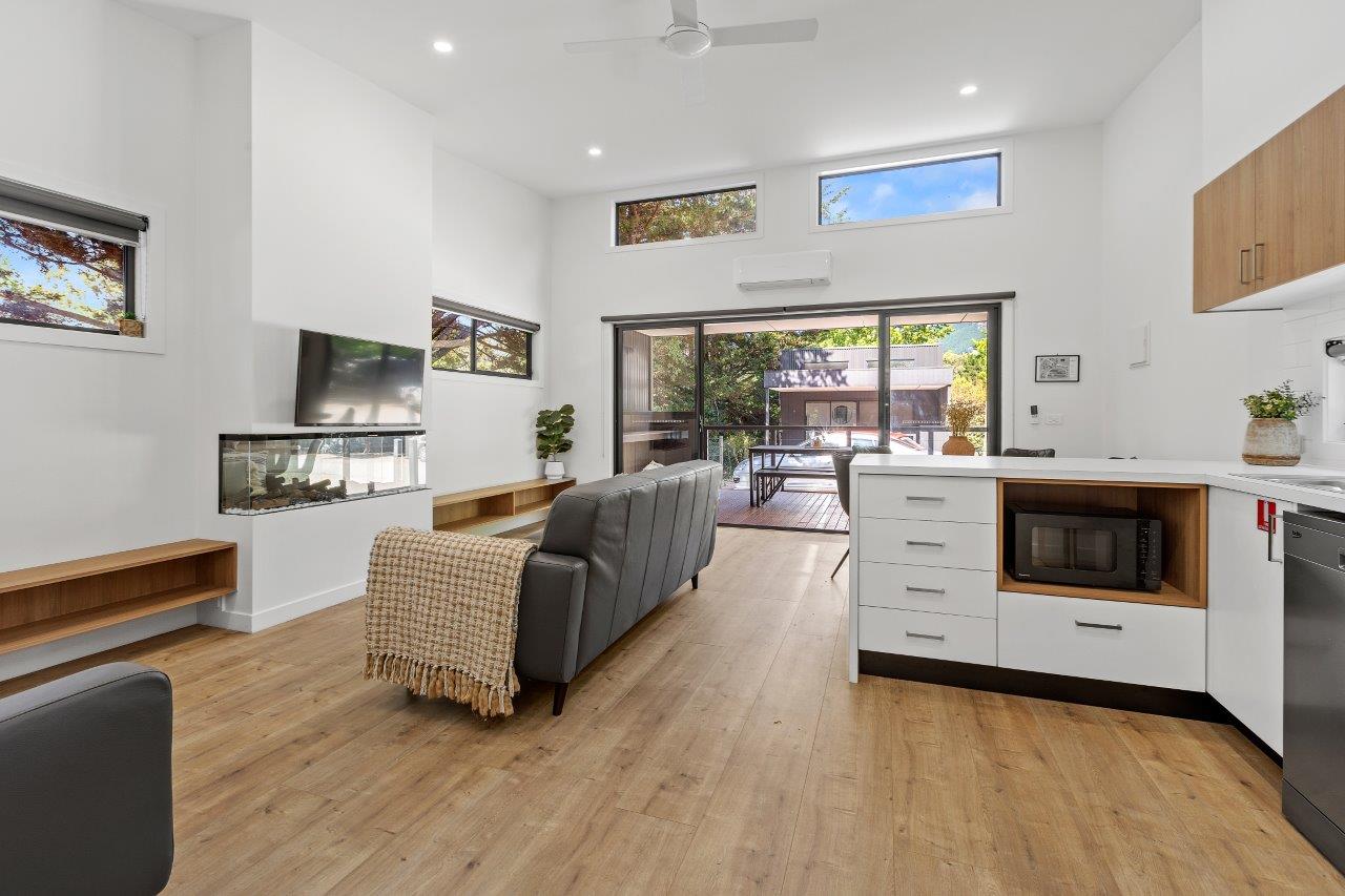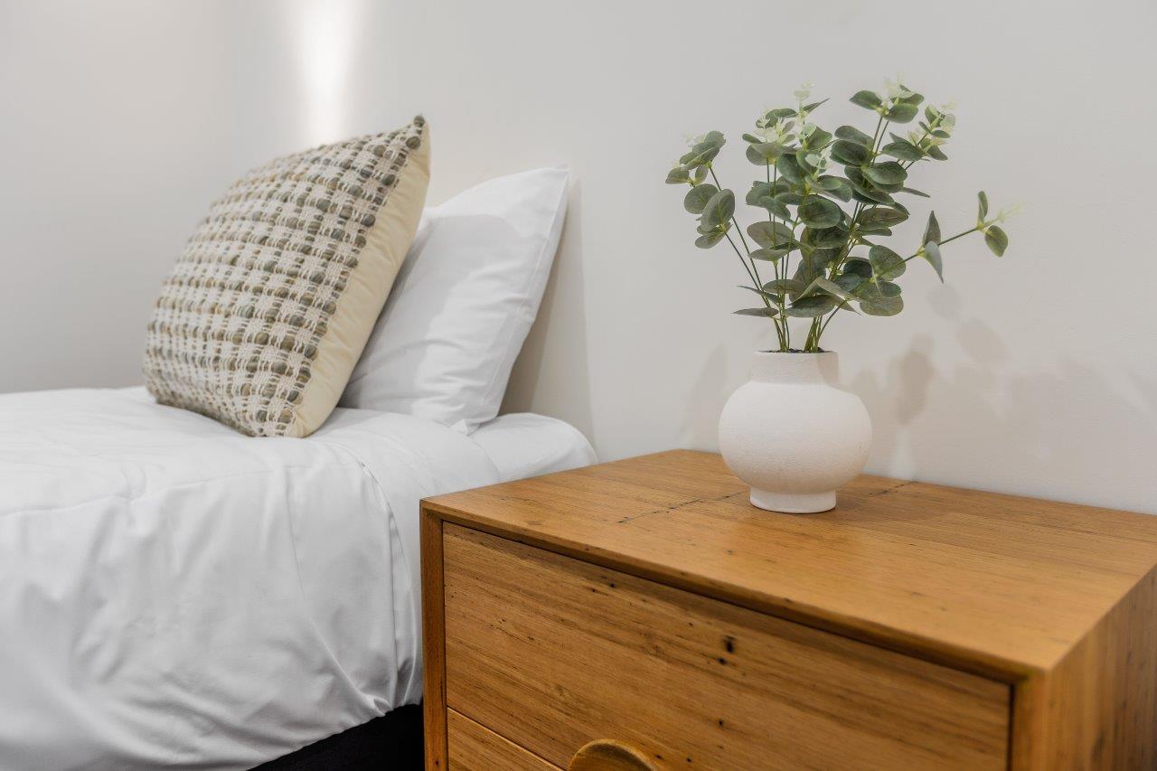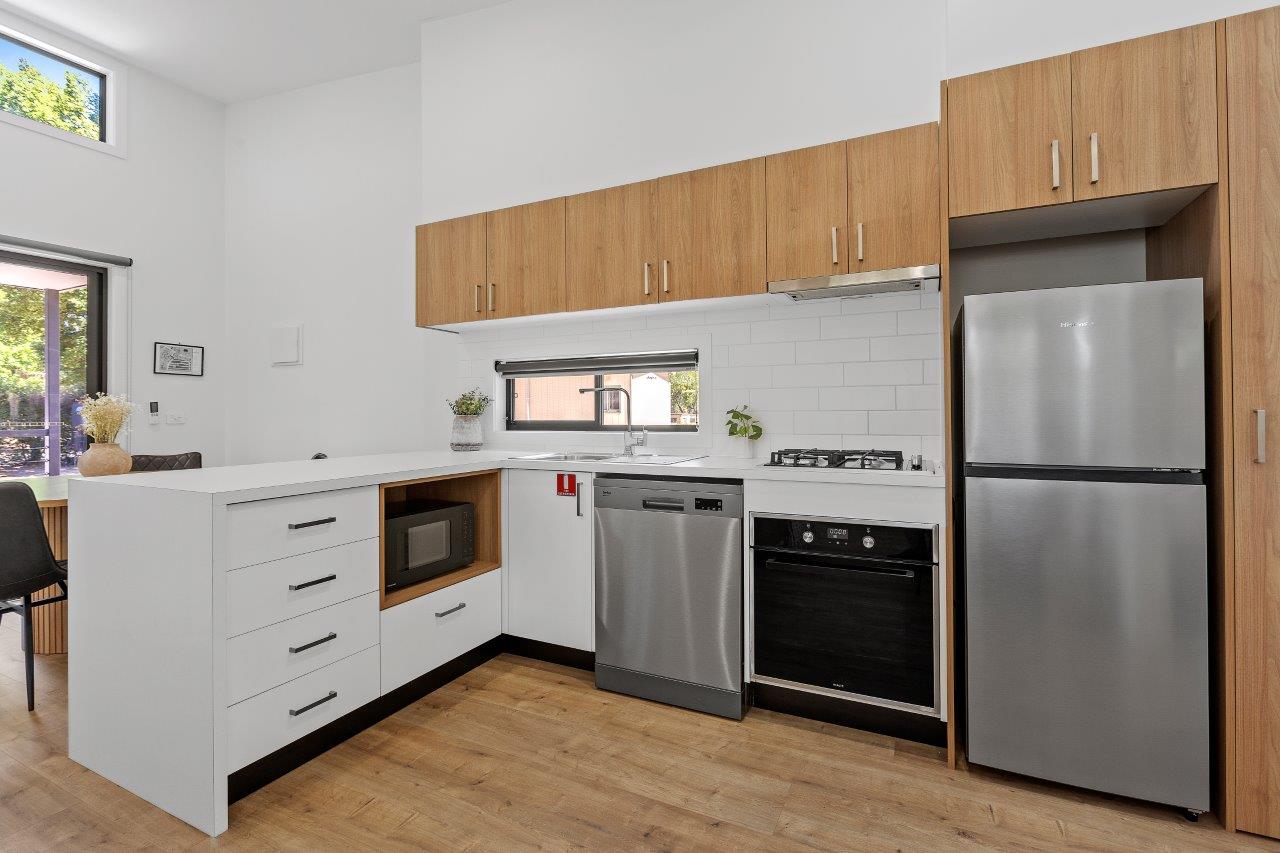 Our 2-bedroom villas offer modern furnishings and a smart layout. The main bedroom includes a queen bed and ensuite, while the second room has two single beds. Enjoy the spacious open-plan living and dining area, equipped with split-system cooling and heating, plus a full kitchen. Step outside to the lovely deck for alfresco dining.