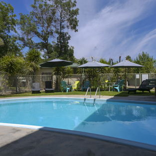 We have a swimming pool with seating and umbrellas, a children's playground with swings and a slippery dip.